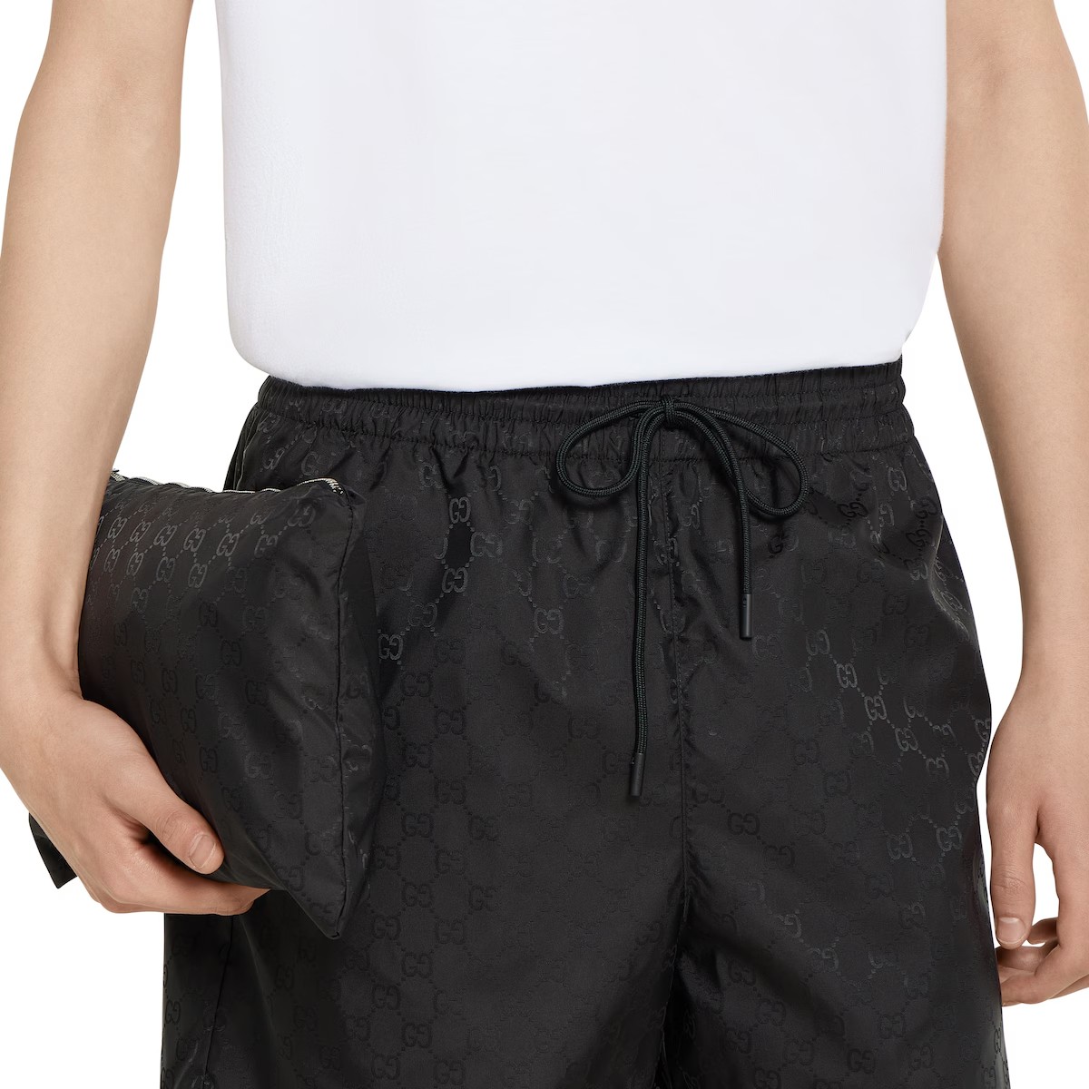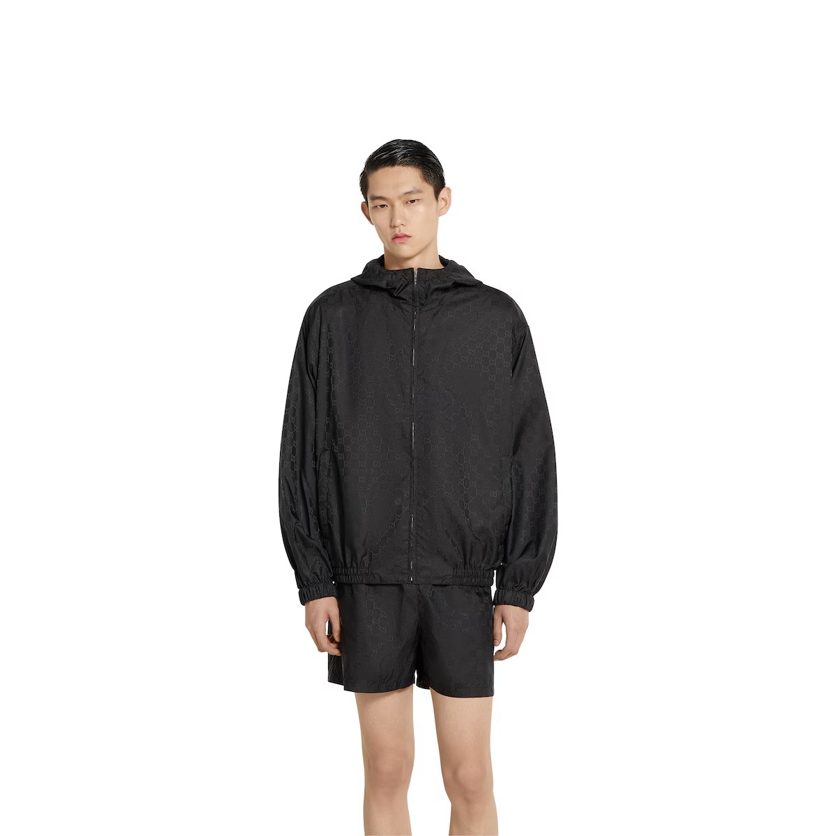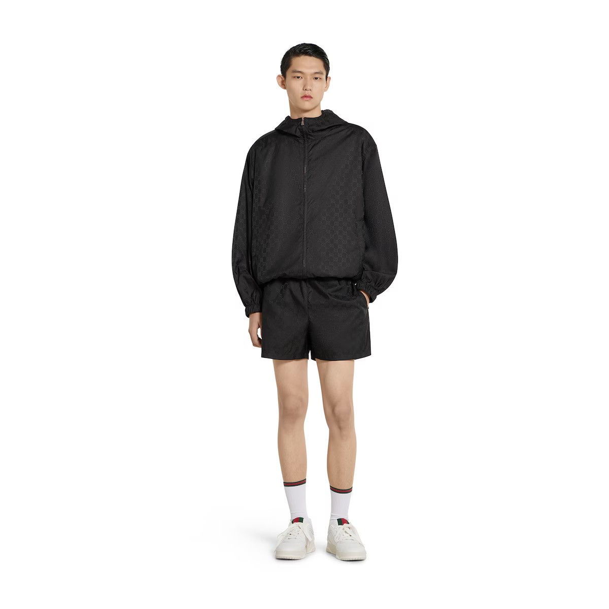 섬세한 플로라 자수, 엠보스 로고, 다양한 장인정신 디테일을 강조하는 차분한 블랙/그레이/그린 톤의 2025년 프리폴 아이템. 접어서 휴대 가능한 블랙 GG 나일론 자카드 소재의 후드 재킷.