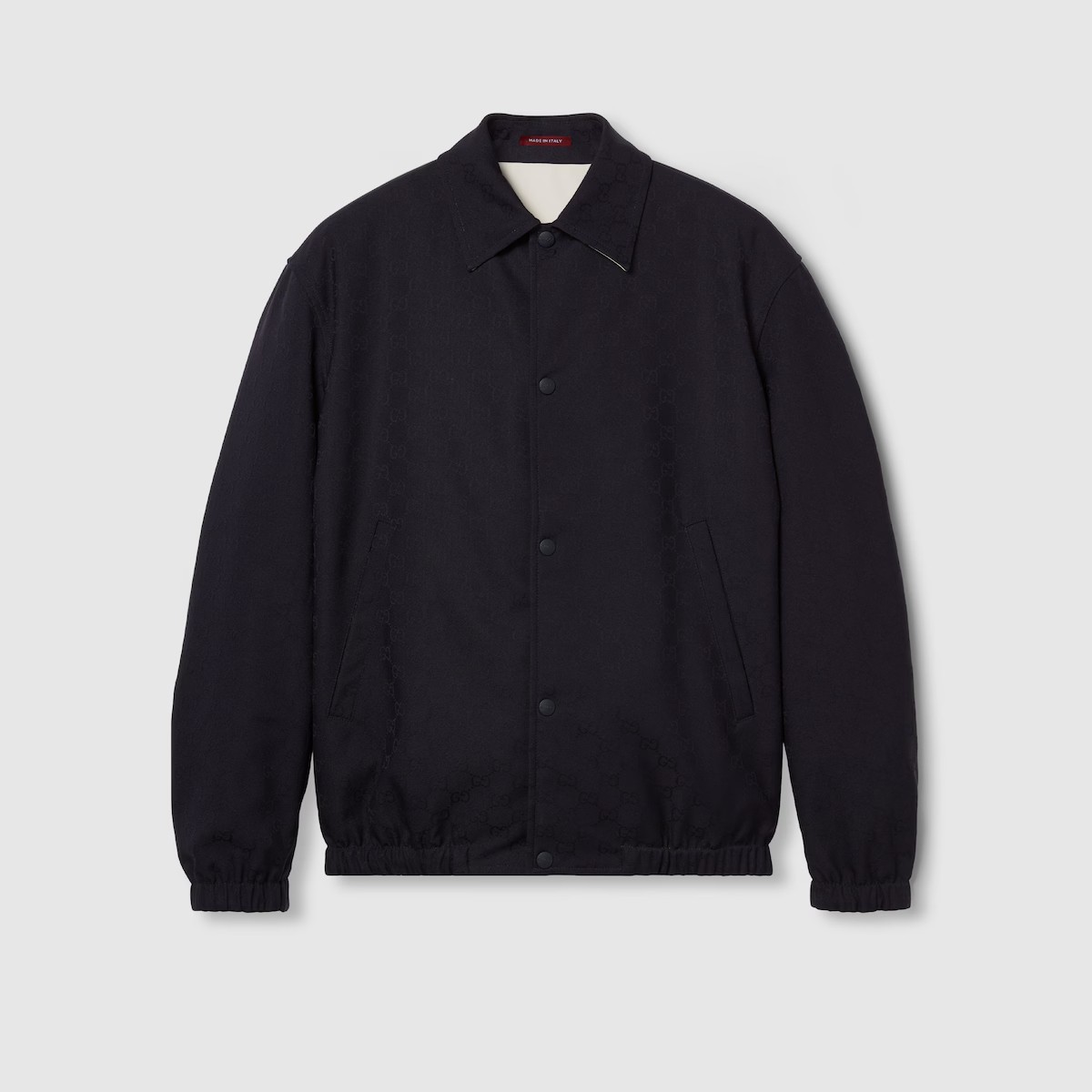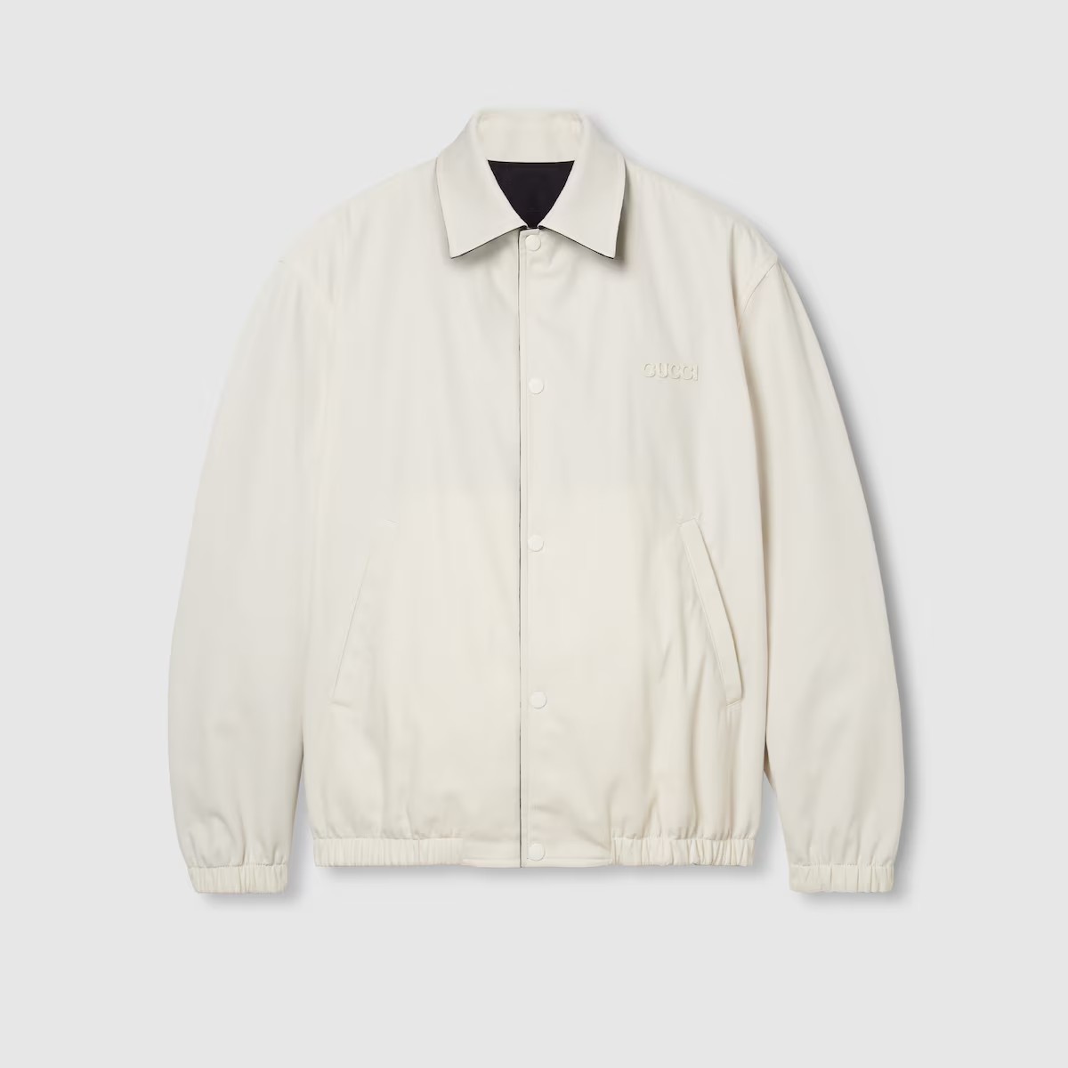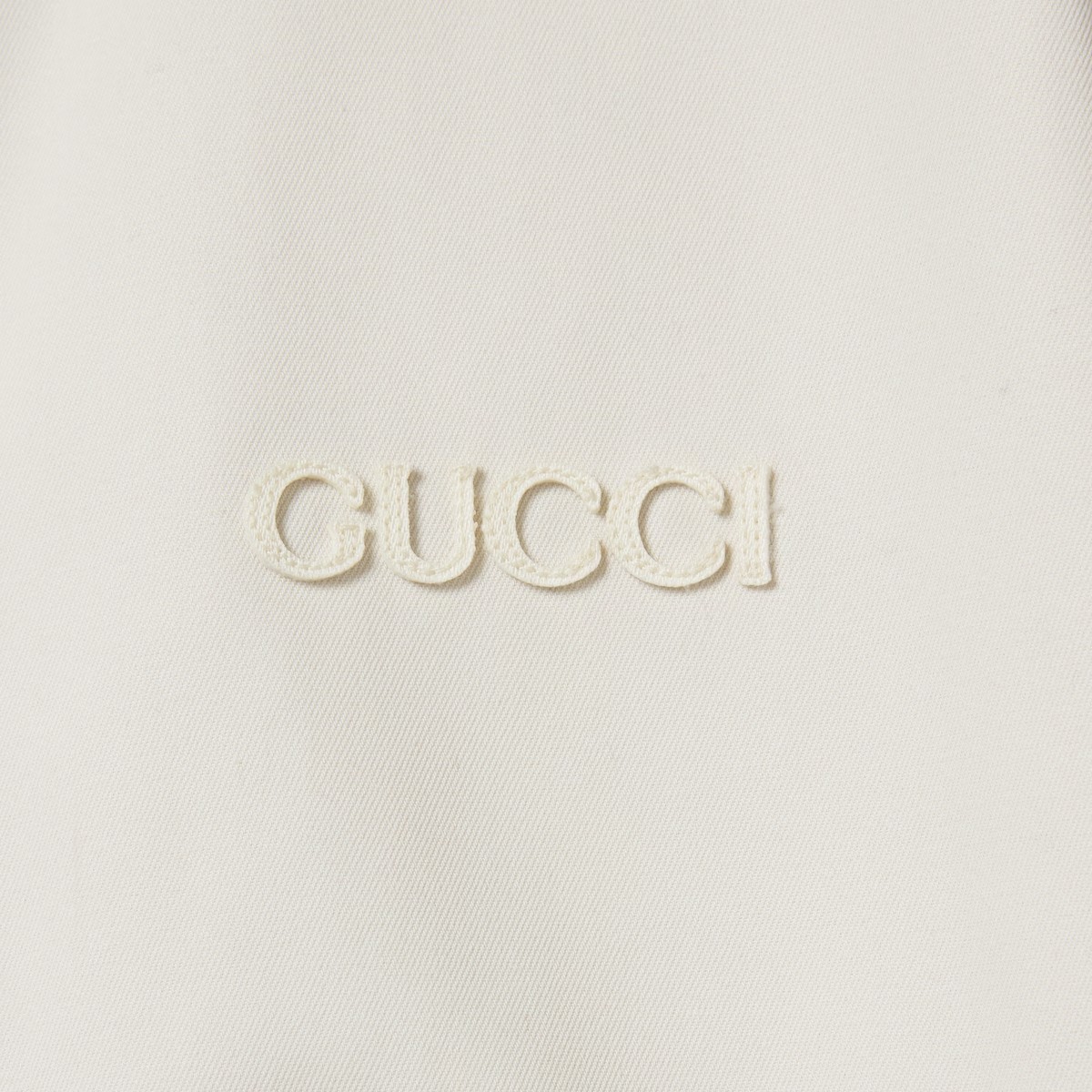 대담한 컬러와 리넨 블렌드부터 나일론에 이르는 다양한 패브릭의 조합으로 표현한 GG 모티브가 돋보입니다. 한쪽 면은 폴리에스테르 GG 자카드, 반대쪽 면은 아이보리 코튼 트윌 소재로 만든 리버서블 재킷. 구찌 자수 디테일로 실루엣을 완성함.