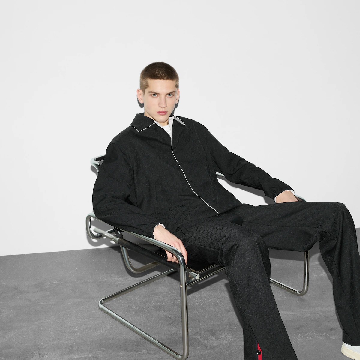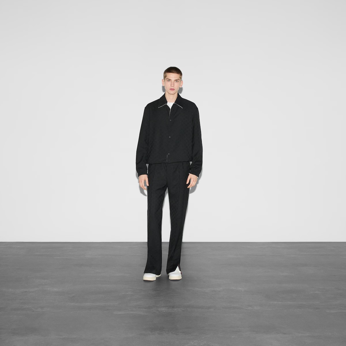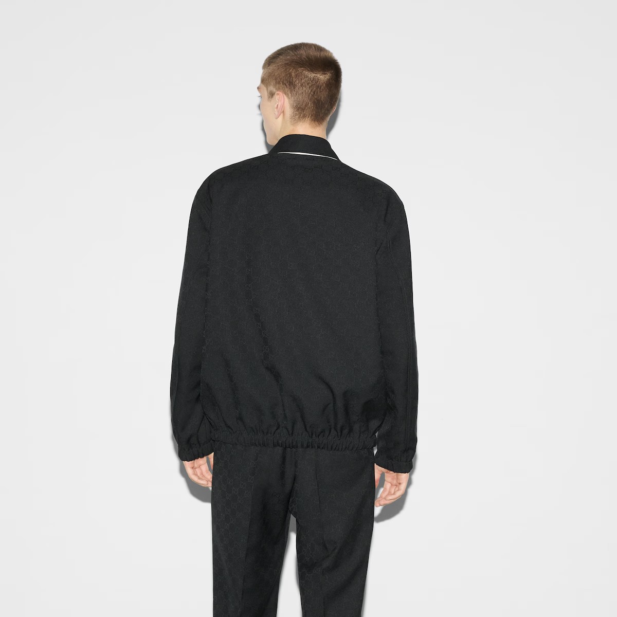 대담한 컬러와 리넨 블렌드부터 나일론에 이르는 다양한 패브릭의 조합으로 표현한 GG 모티브가 돋보입니다. 한쪽 면은 폴리에스테르 GG 자카드, 반대쪽 면은 아이보리 코튼 트윌 소재로 만든 리버서블 재킷. 구찌 자수 디테일로 실루엣을 완성함.