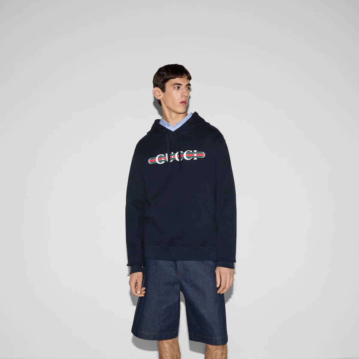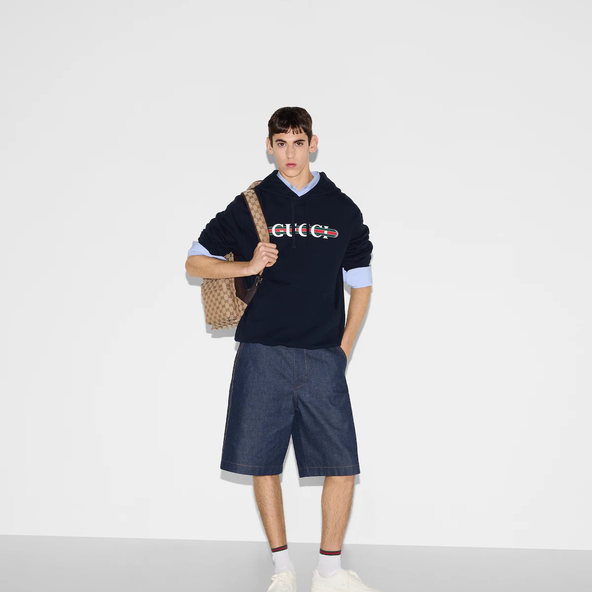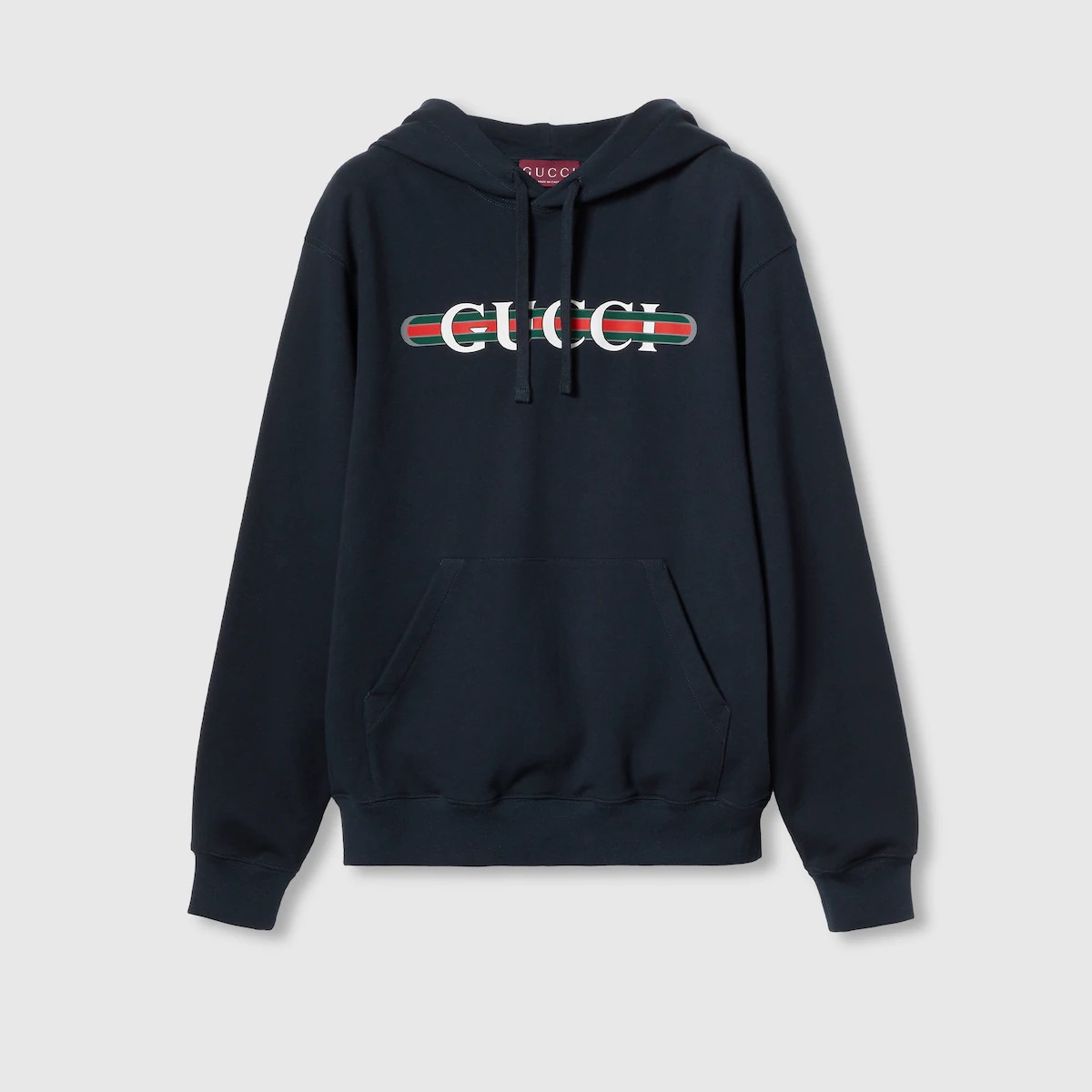 새로운 시즌을 맞아 진화를 거듭하는 구찌의 하우스 코드와 저지 소재의 만남. 코튼 저지 바탕에 구찌 웹(Web) 프린트로 하우스의 감성을 표현한 레귤러 핏 후드 스웨트셔츠.