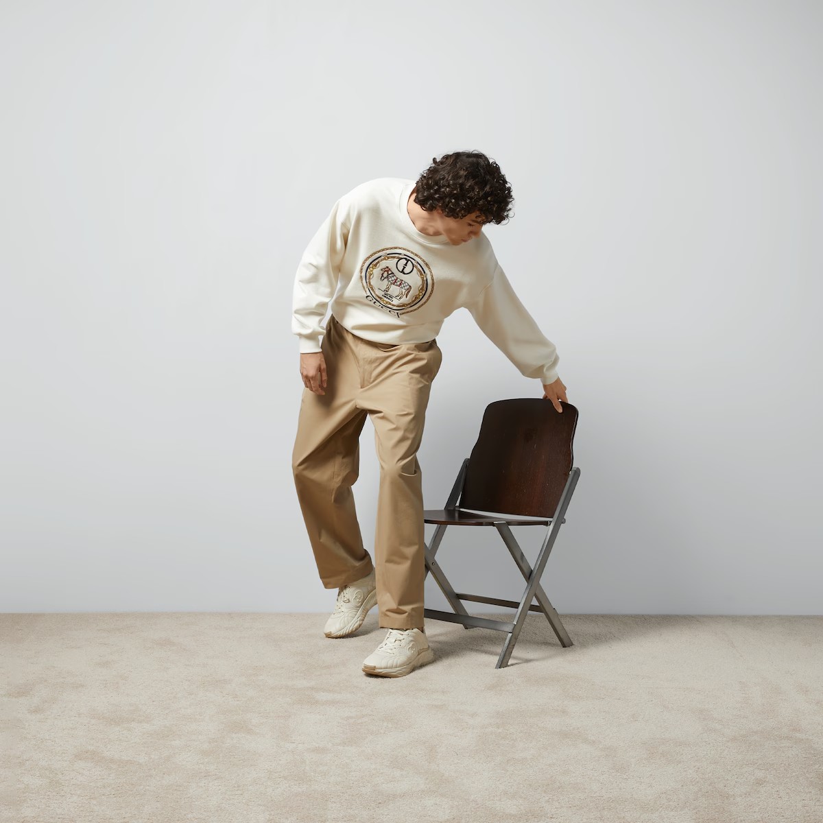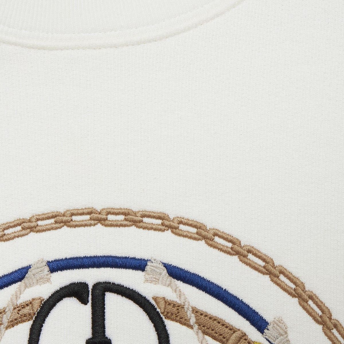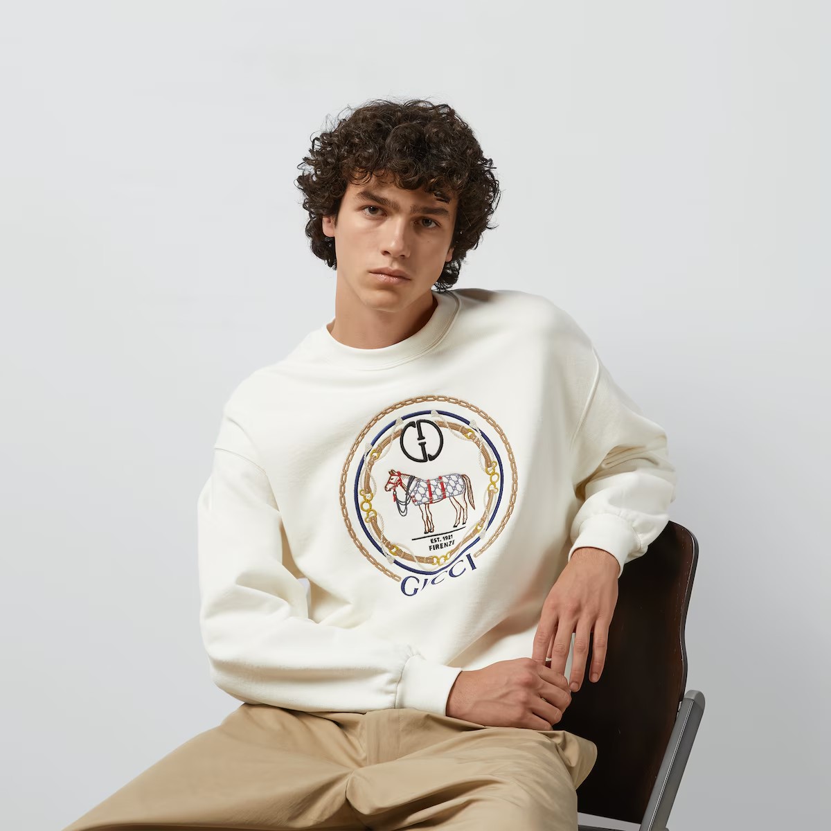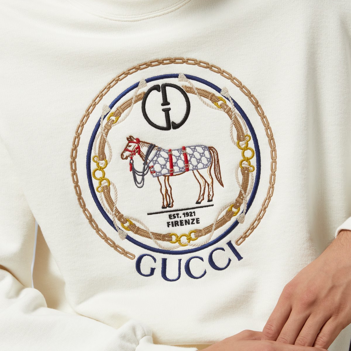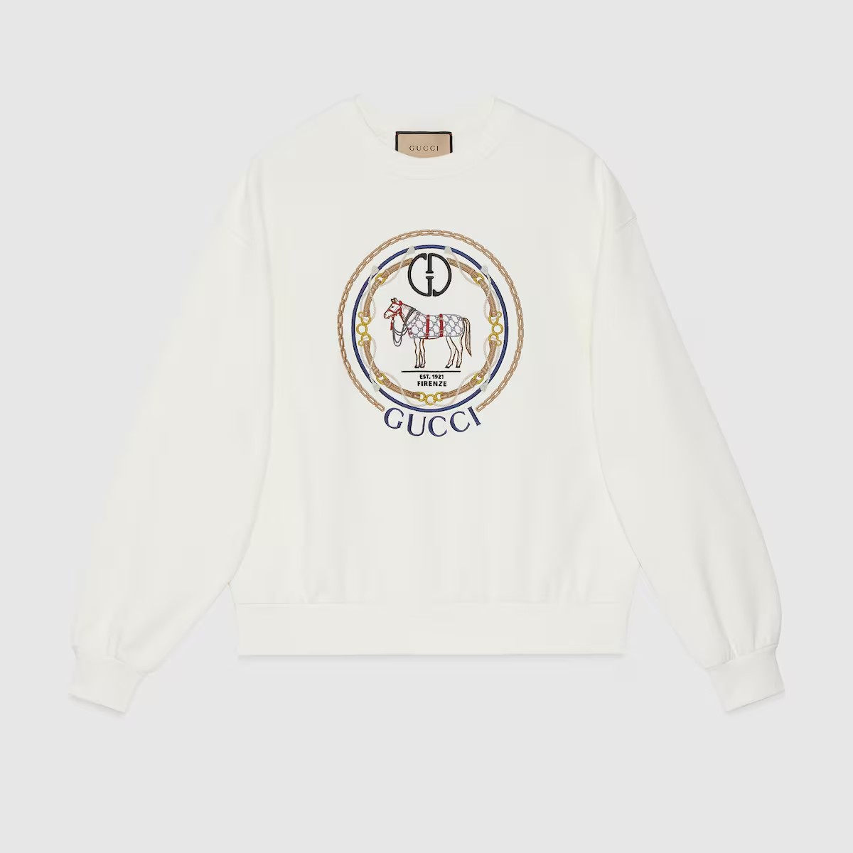 풍성한 볼륨감을 살려 여유로운 분위기를 불어넣는 캐주얼 디자인. 드롭 숄더와 크롭 길이, 넉넉한 핏의 스웨트셔츠, 후디, 티셔츠를 완성하는 시그니처 장식. GG, 홀스, Firenze 및 Gucci 자수가 돋보이는 화이트 펠트 코튼 저지 스웨트셔츠.