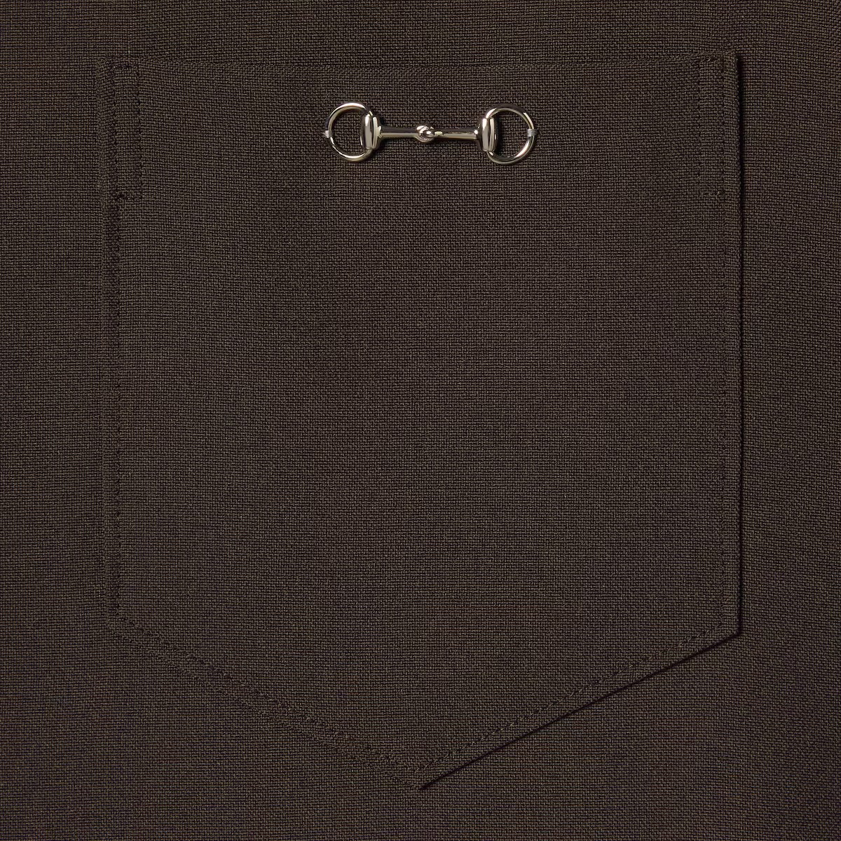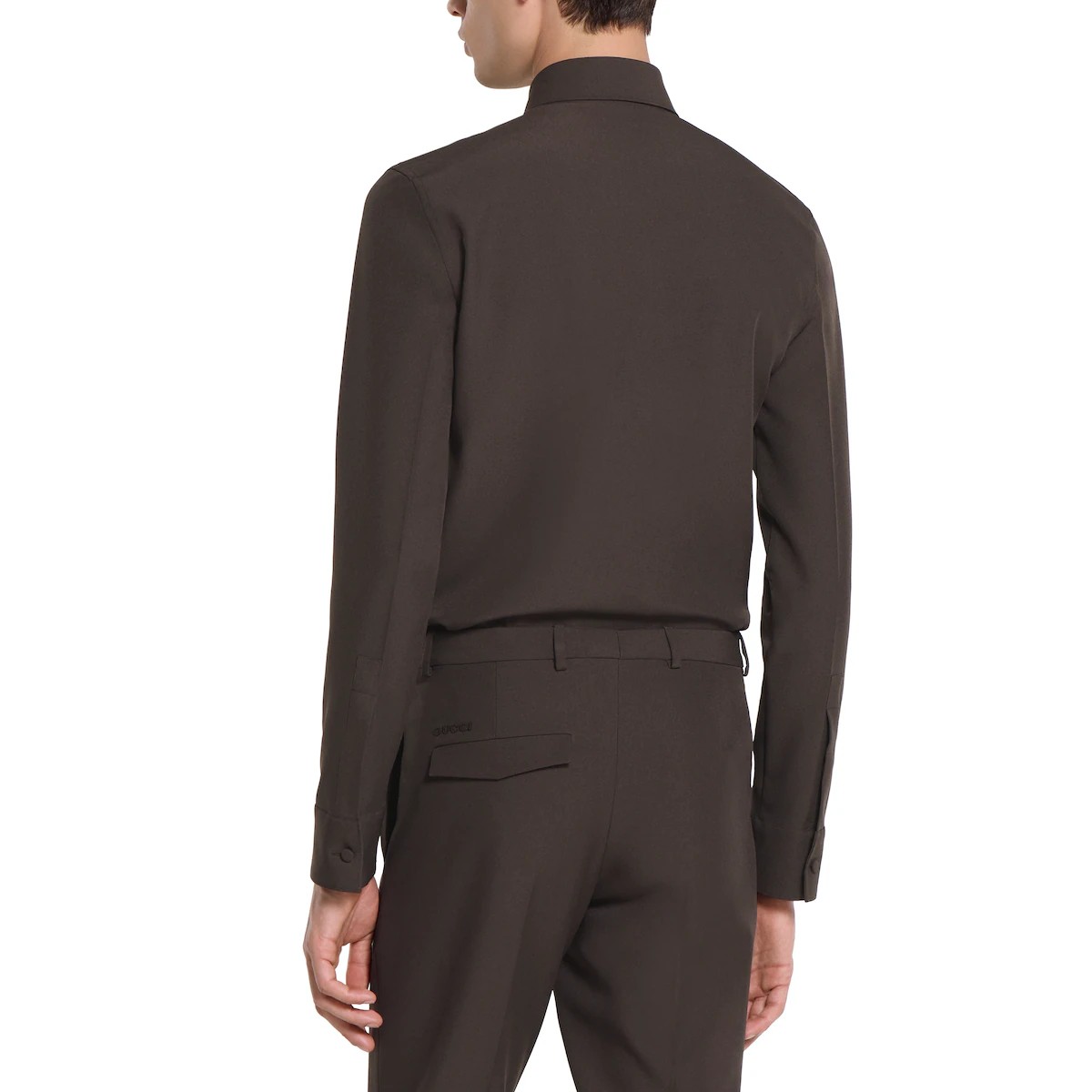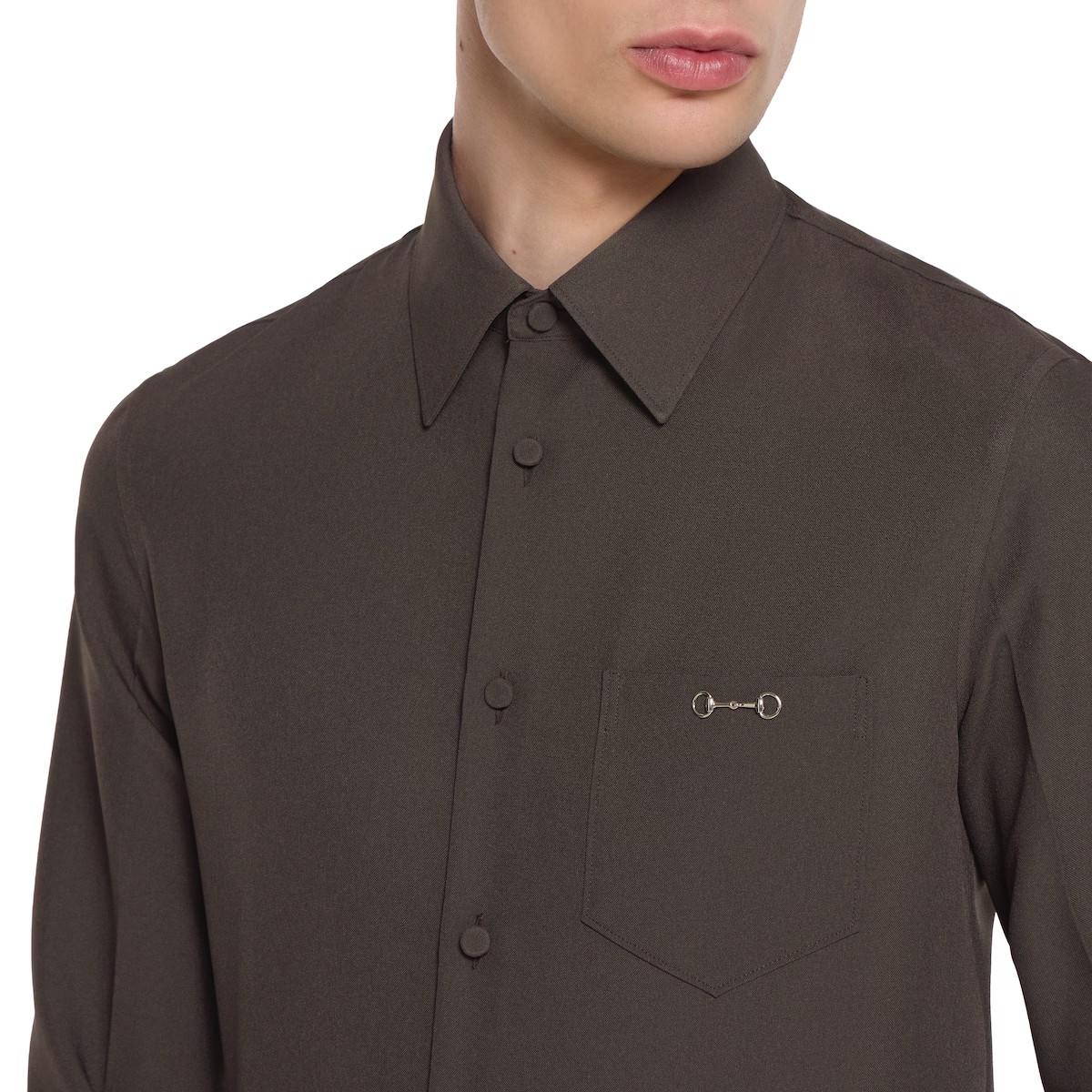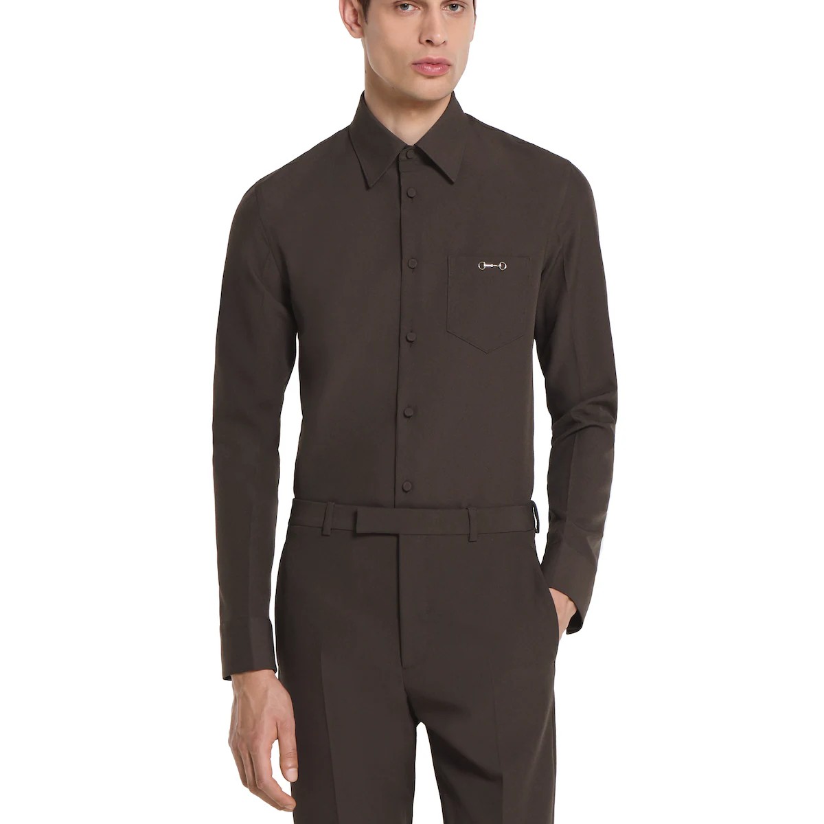 2025 가을-겨울 컬렉션, 구찌의 클래식 코드와 깔끔한 실루엣의 만남. 체스트 포켓의 메탈 홀스빗 디테일로 더욱 풍성해진 슬림 핏 셔츠. 드러나지 않는 버튼 클로저, 포인트 카라, 롱 슬리브로 스타일을 완성함.