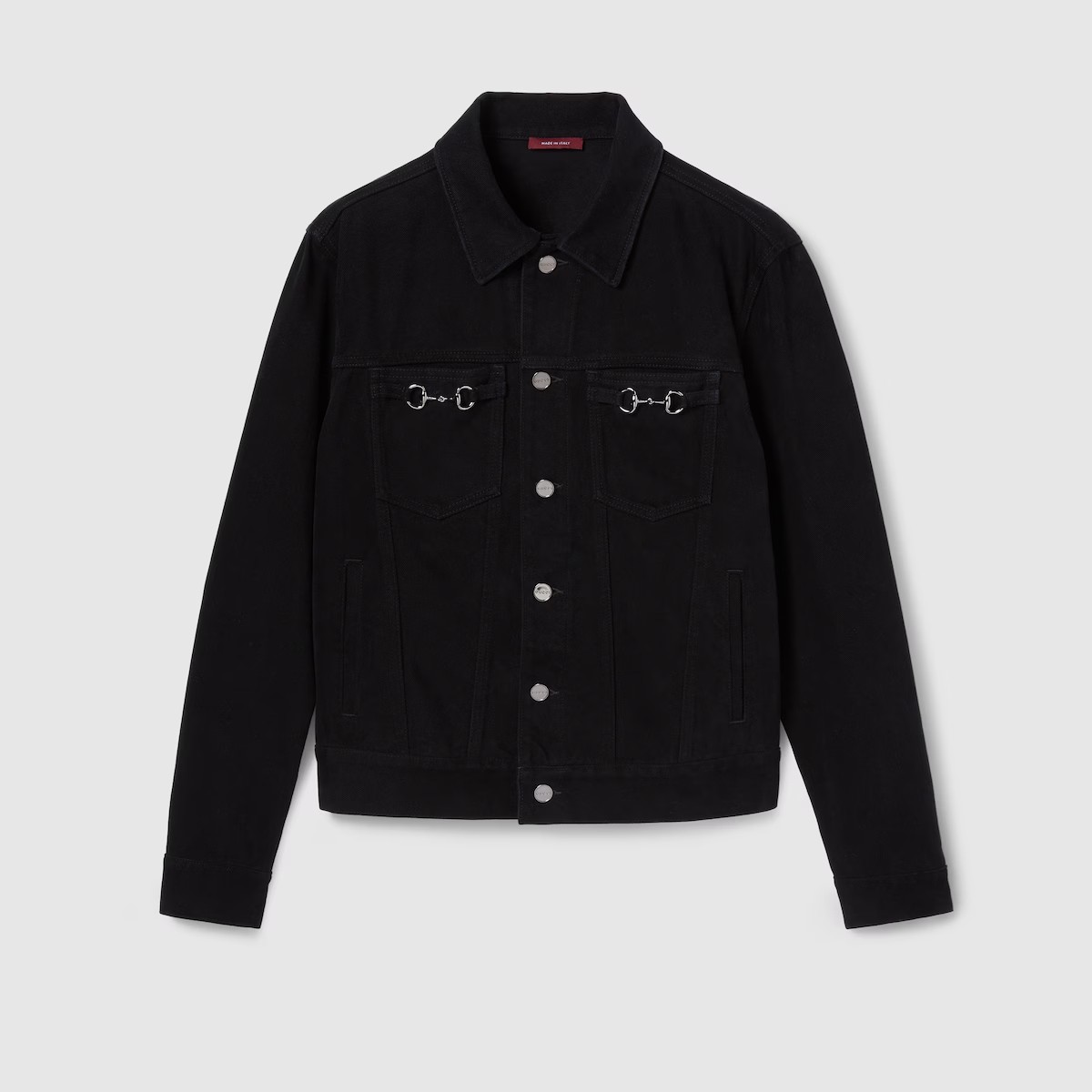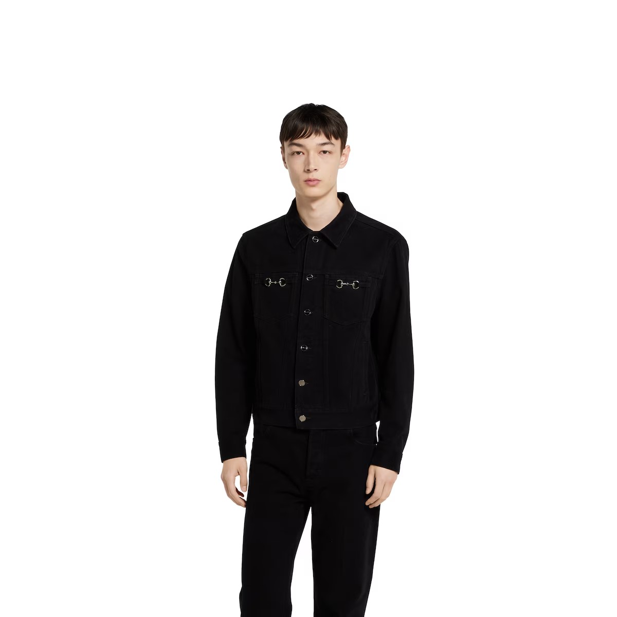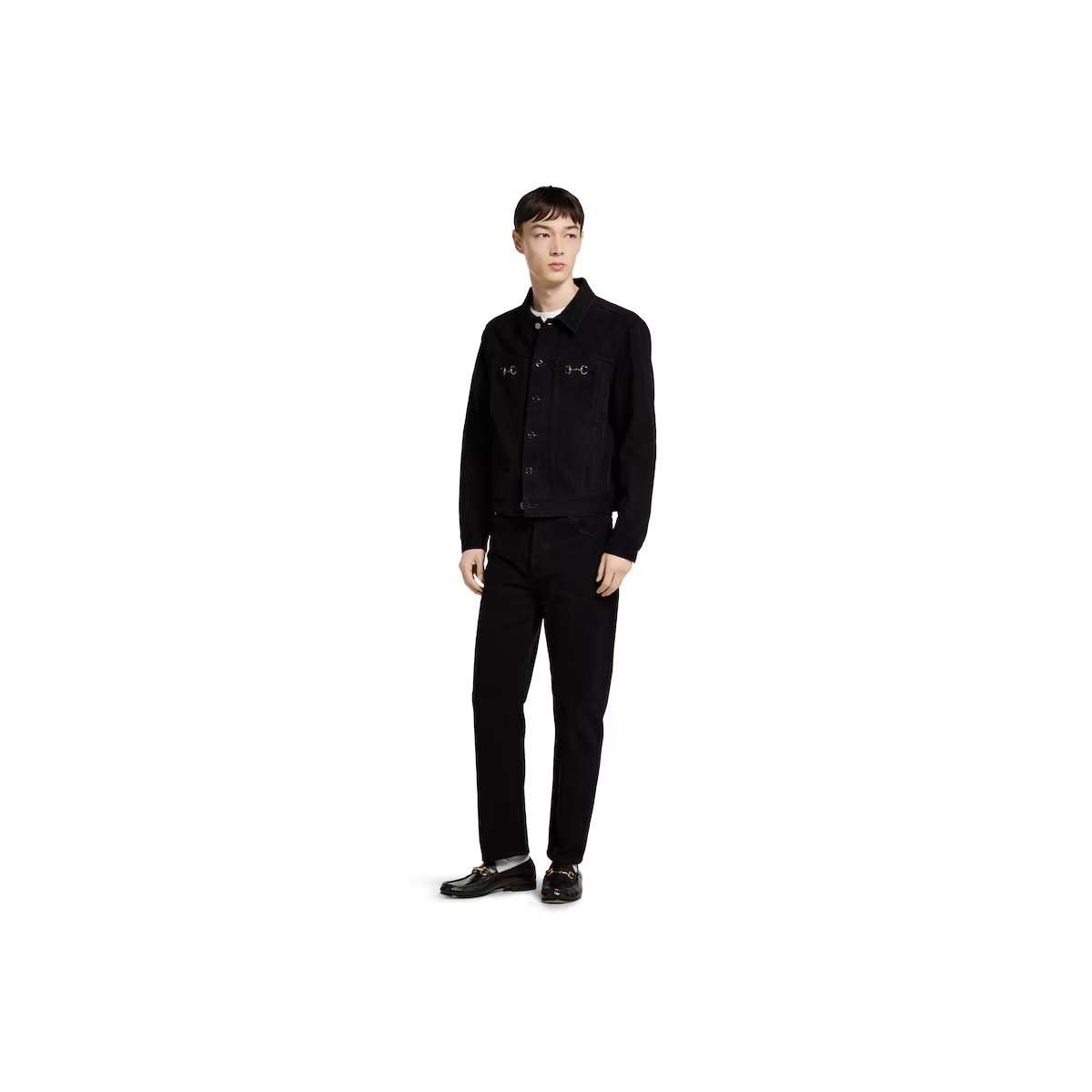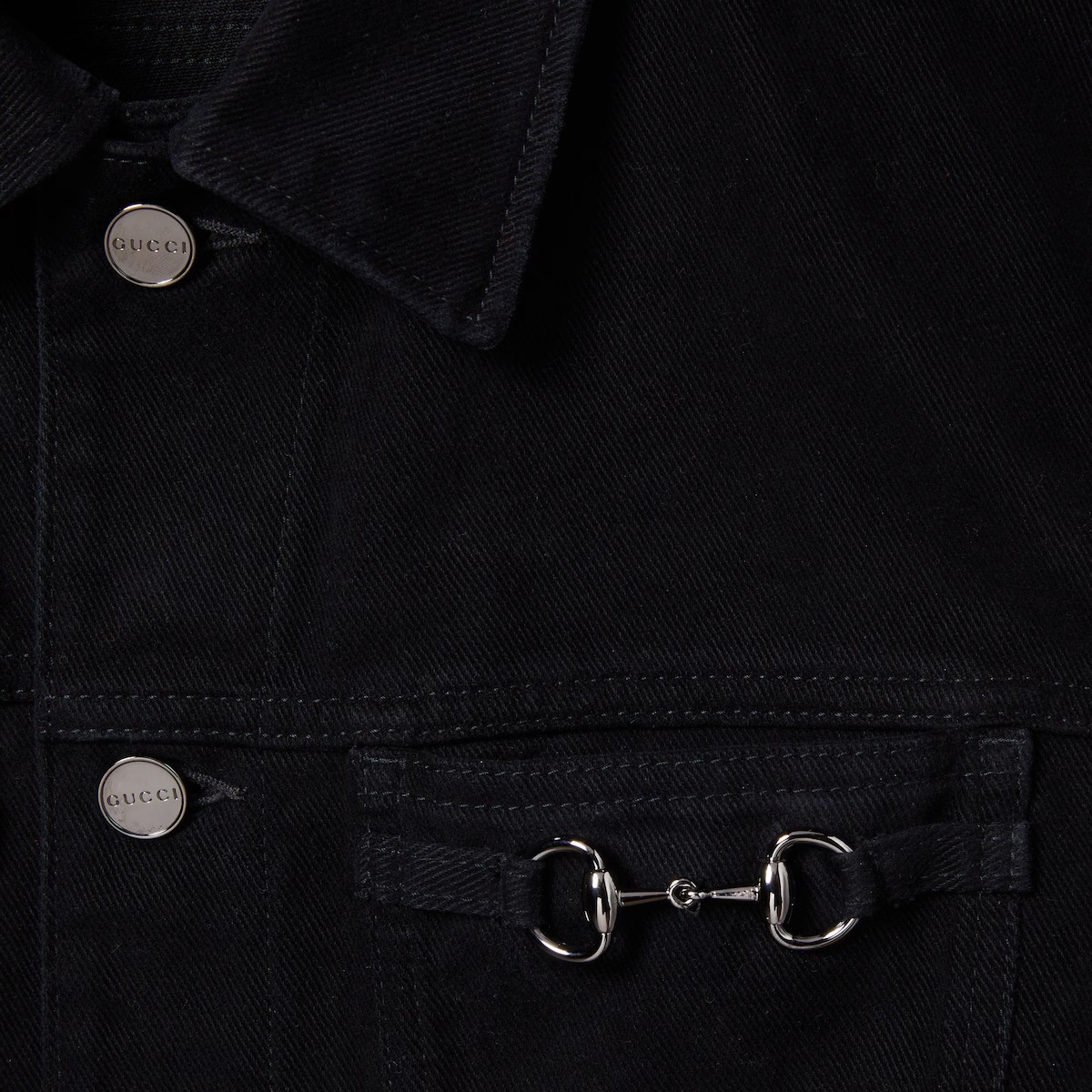 섬세한 플로라 자수, 엠보스 로고, 다양한 장인 정신 디테일을 강조하는 차분한 블랙/그레이/그린 톤의 2025년 프리폴 아이템. 블랙 코튼 데님 소재로, 하우스의 시그니처 홀스빗 메탈 장식으로 품격을 더한 재킷.