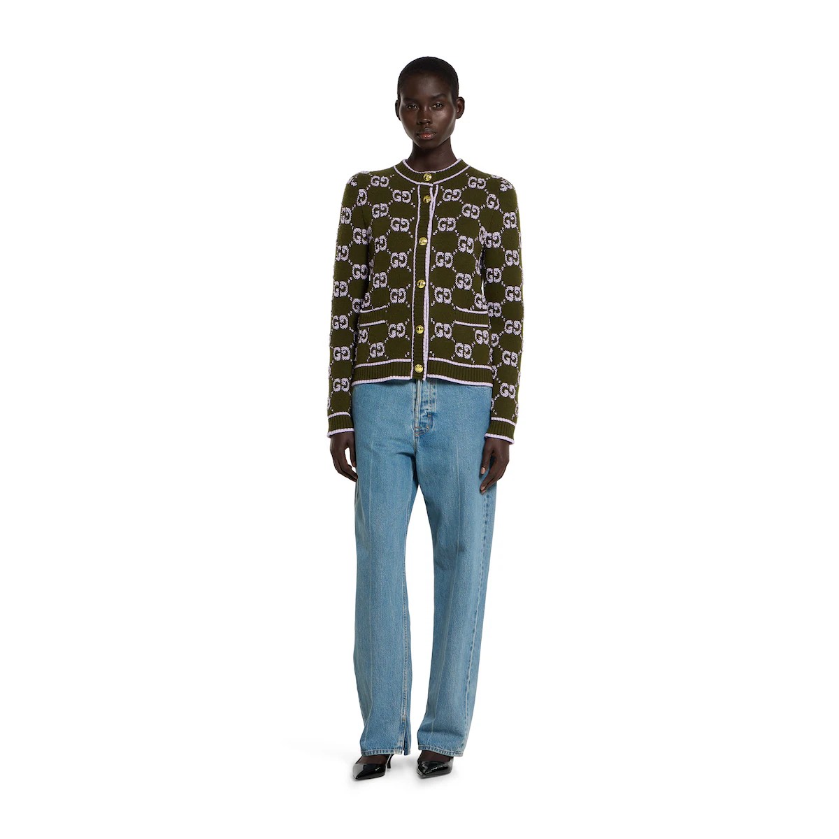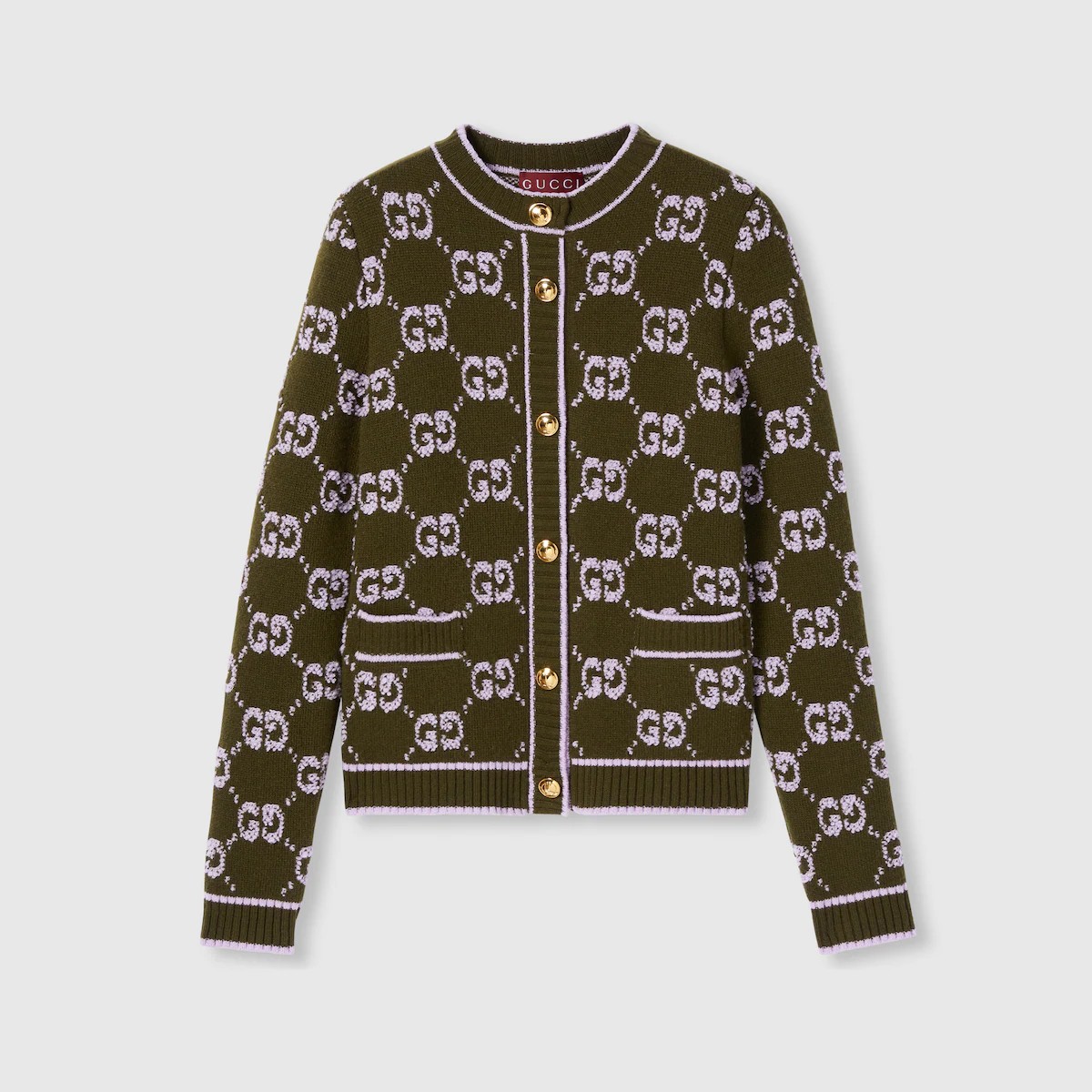 창립자 구찌오 구찌(Guccio Gucci)의 모노그램에서 영감을 얻어 오늘날에도 여전히 열렬한 지지를 받고 있는 GG 모티브. 2025 프리폴의 컬러 내러티브를 정의하는 그린. 소프트 울 GG 부클레 자카드 소재에 대조적인 리브 트리밍으로 스타일을 완성한 크루넥 가디건.
