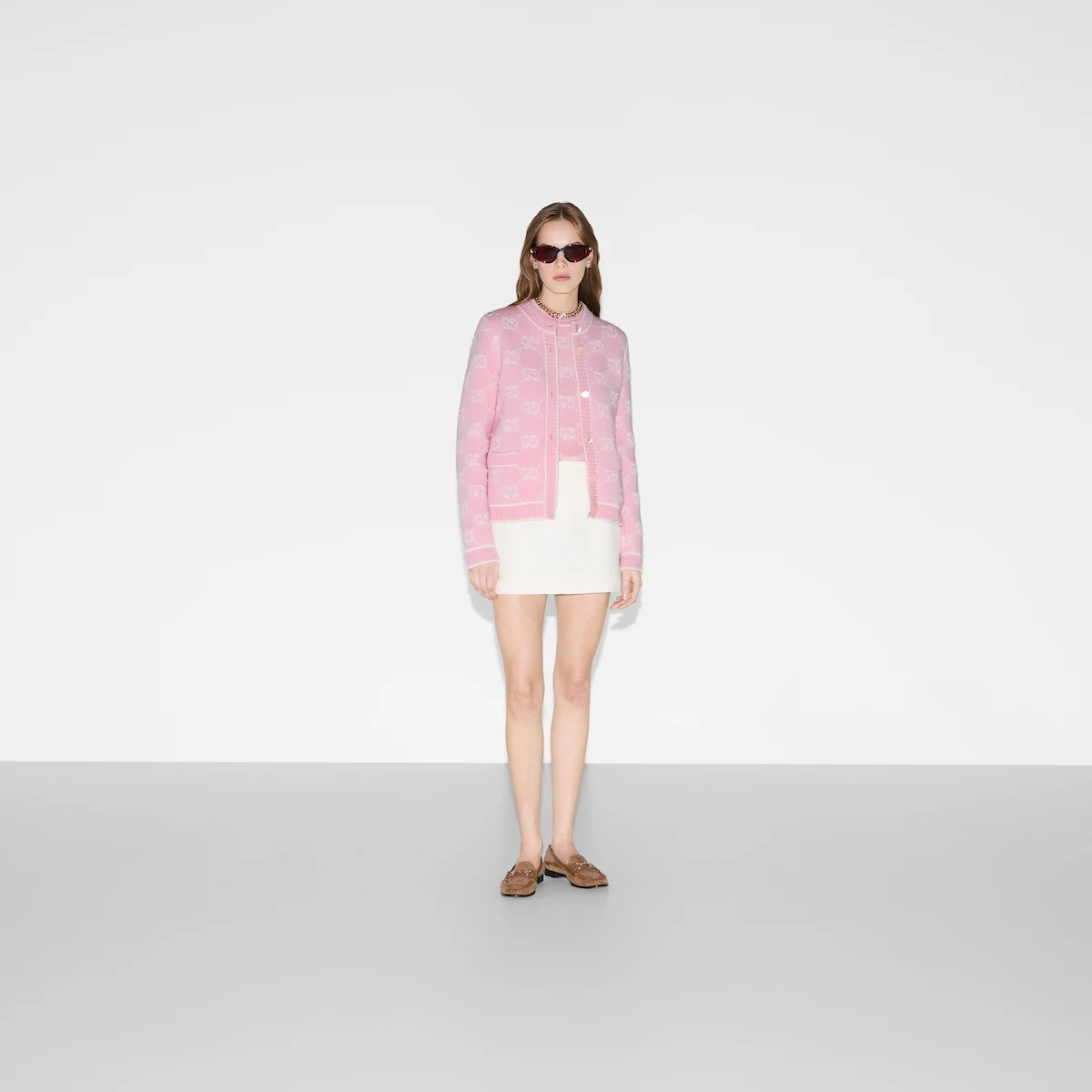 창립자 구찌오 구찌(Guccio Gucci)의 모노그램에서 영감을 얻어 오늘날에도 여전히 열렬한 지지를 받고 있는 GG 모티브. 소프트 울 GG 부클레 스티치 자카드와 대조를 이루는 리브 트리밍으로 완성한 크루넥 가디건.