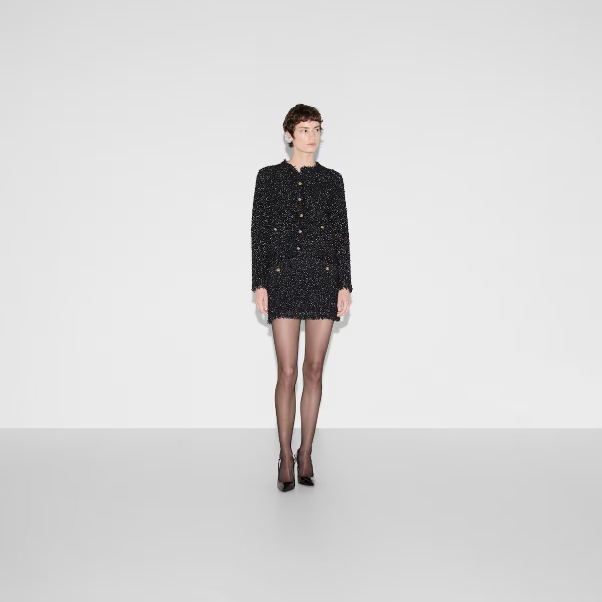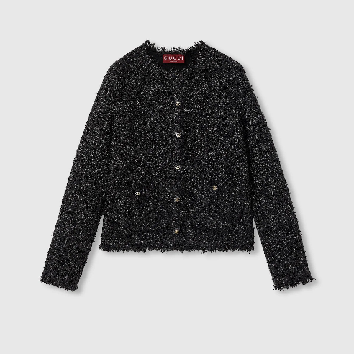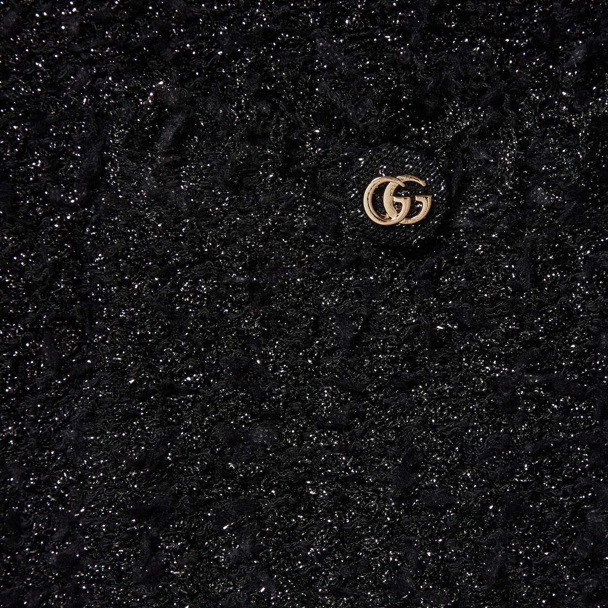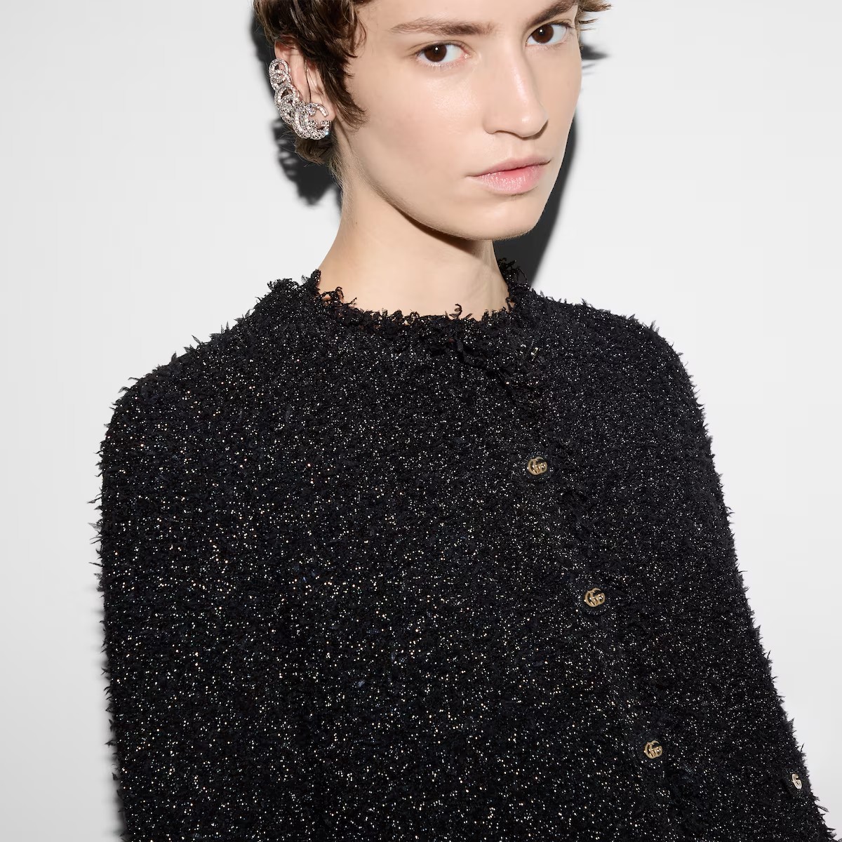 프린지, 비즈, 크리스털을 비롯한 정교한 디테일이 특징적이며, 다양한 영감과 하우스의 상징적인 코드를 통해 표현되는 하우스의 데일리 룩에 대한 접근 방식. 청키 라메 및 비스코스 우븐 효과 스티치에 더블 G 셀프 커버드 버튼 디테일이 돋보이는 크루넥 가디건.