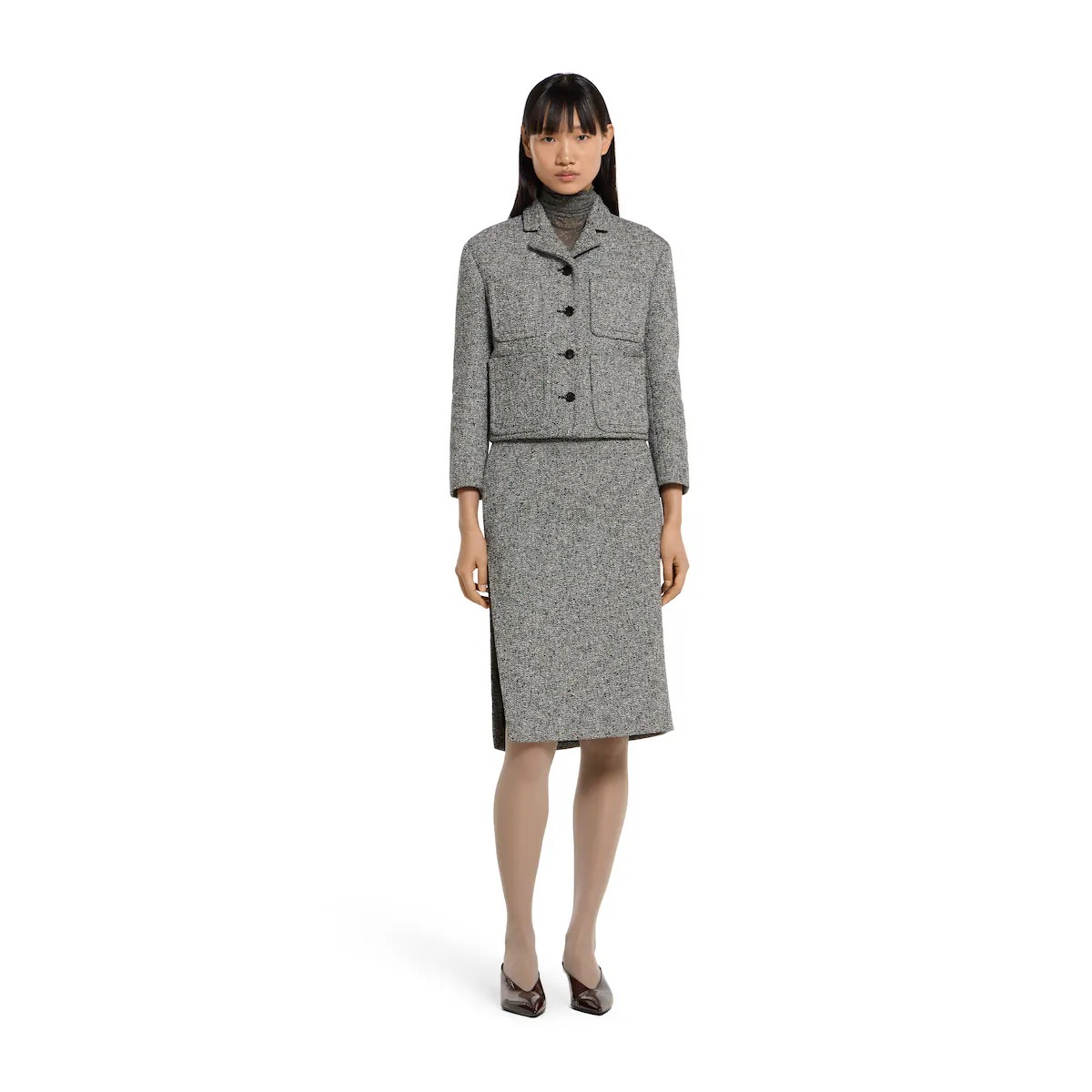 정교한 컷과 컴팩트한 비율로 세련되게 재해석한 2025 가을-겨울 컬렉션의 유틸리티 아이템. 피크 라펠, 앞면 플랩 패치 포켓 4개, 버튼업 앞면이 돋보이는 크롭 재킷. 하프 라이닝.