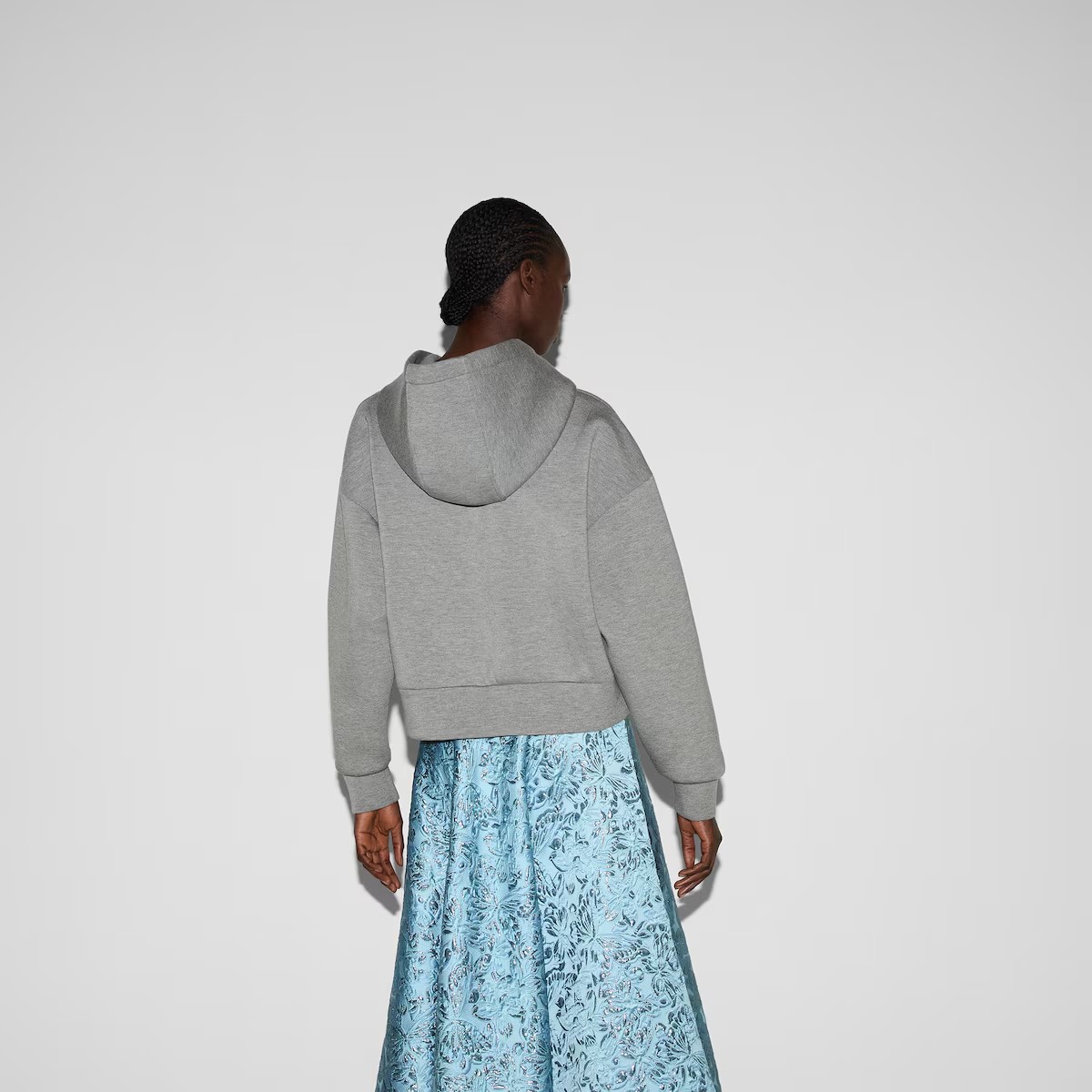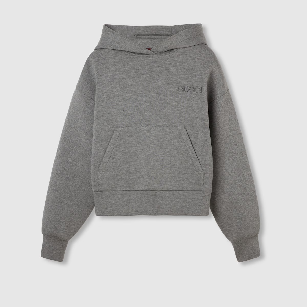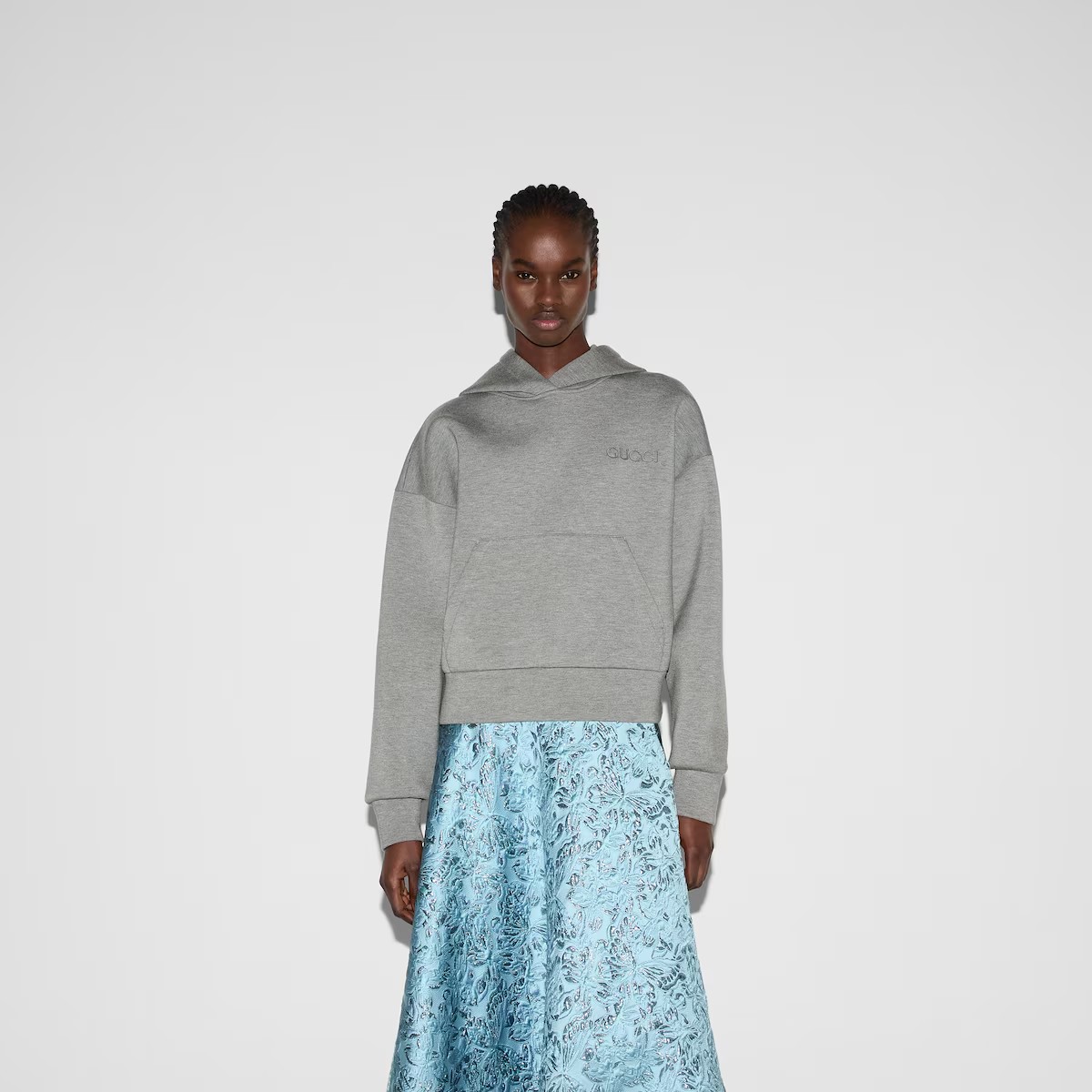 재해석된 시그니처 패턴이 새로운 실루엣의 재킷, 오버사이즈 셔츠, 파자마 세트와 조화를 이룹니다. 이 오버사이즈 후드 스웨트셔츠는 비스코스 저지로 제작되었으며, 구찌 자수로 장식되었습니다.