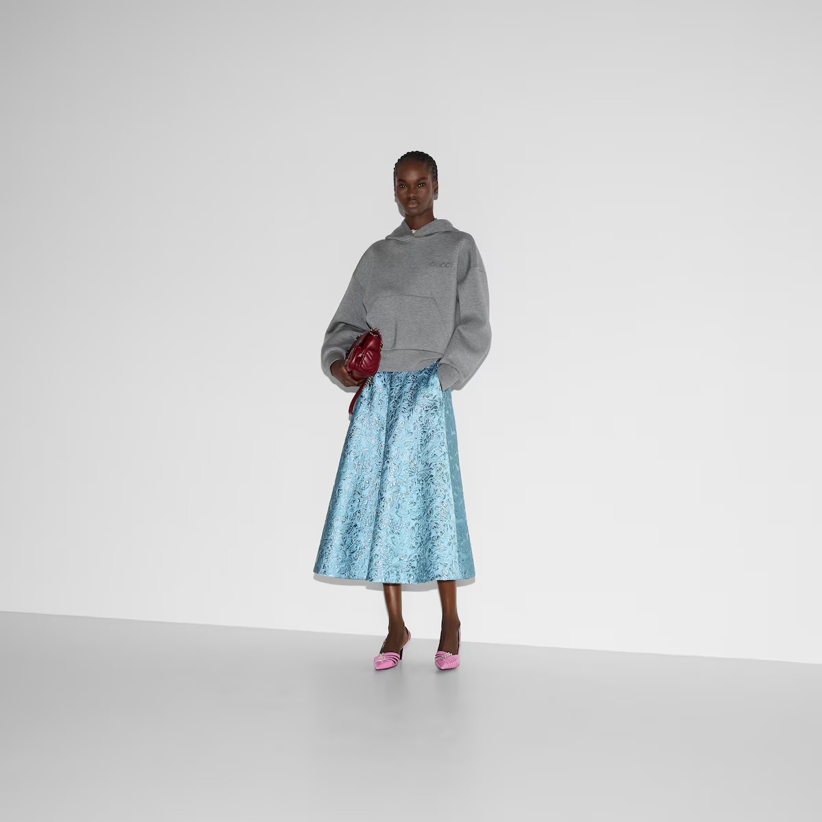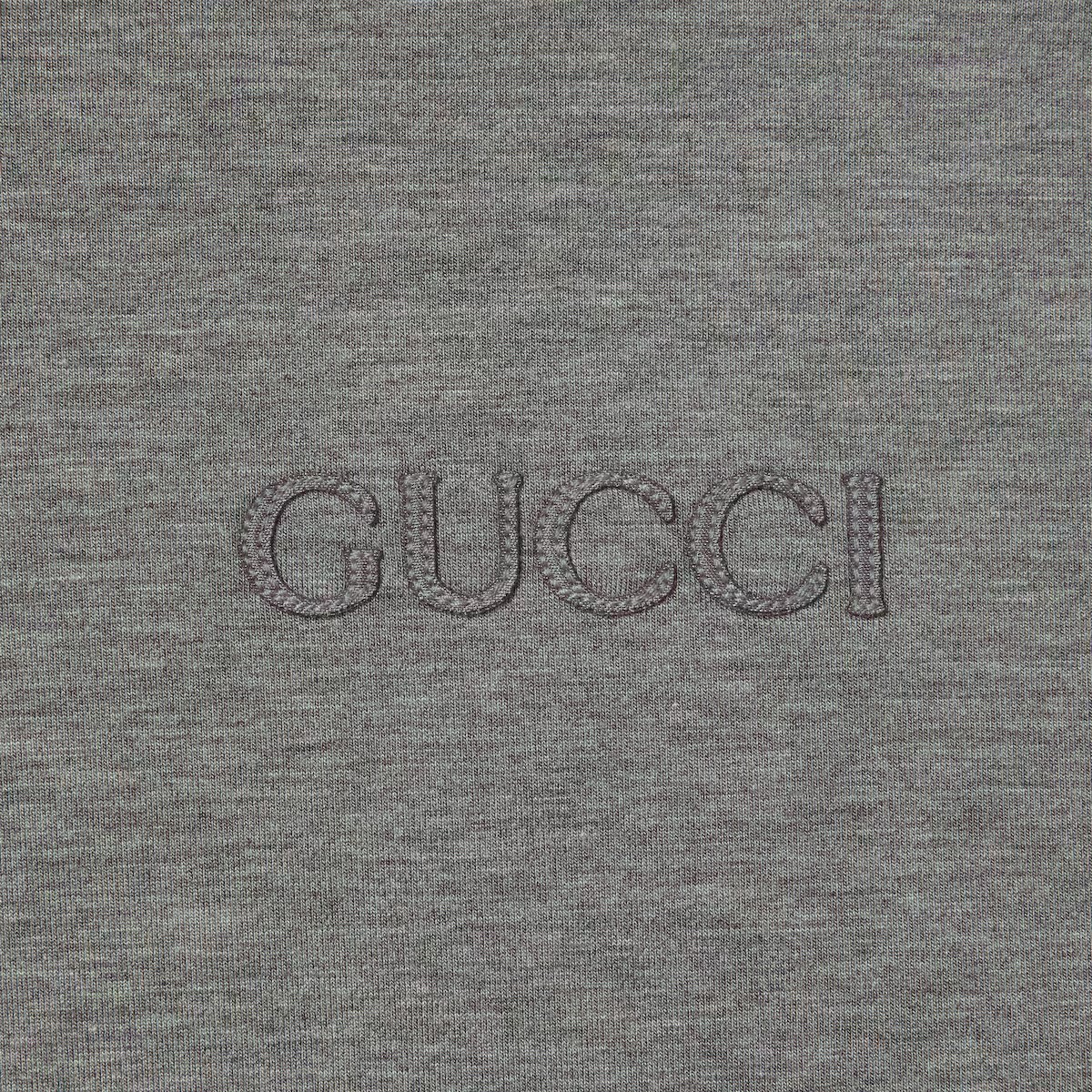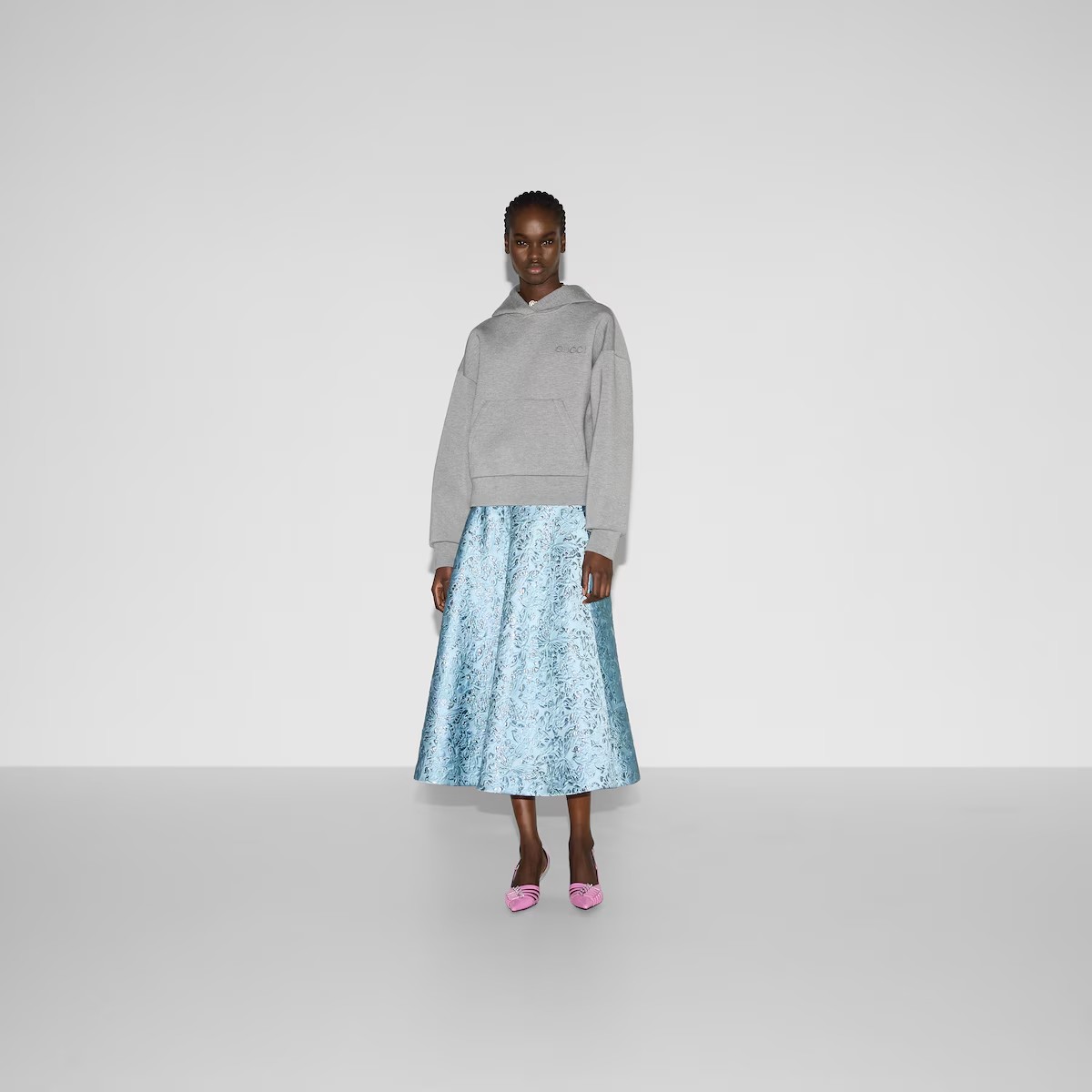 재해석된 시그니처 패턴이 새로운 실루엣의 재킷, 오버사이즈 셔츠, 파자마 세트와 조화를 이룹니다. 이 오버사이즈 후드 스웨트셔츠는 비스코스 저지로 제작되었으며, 구찌 자수로 장식되었습니다.