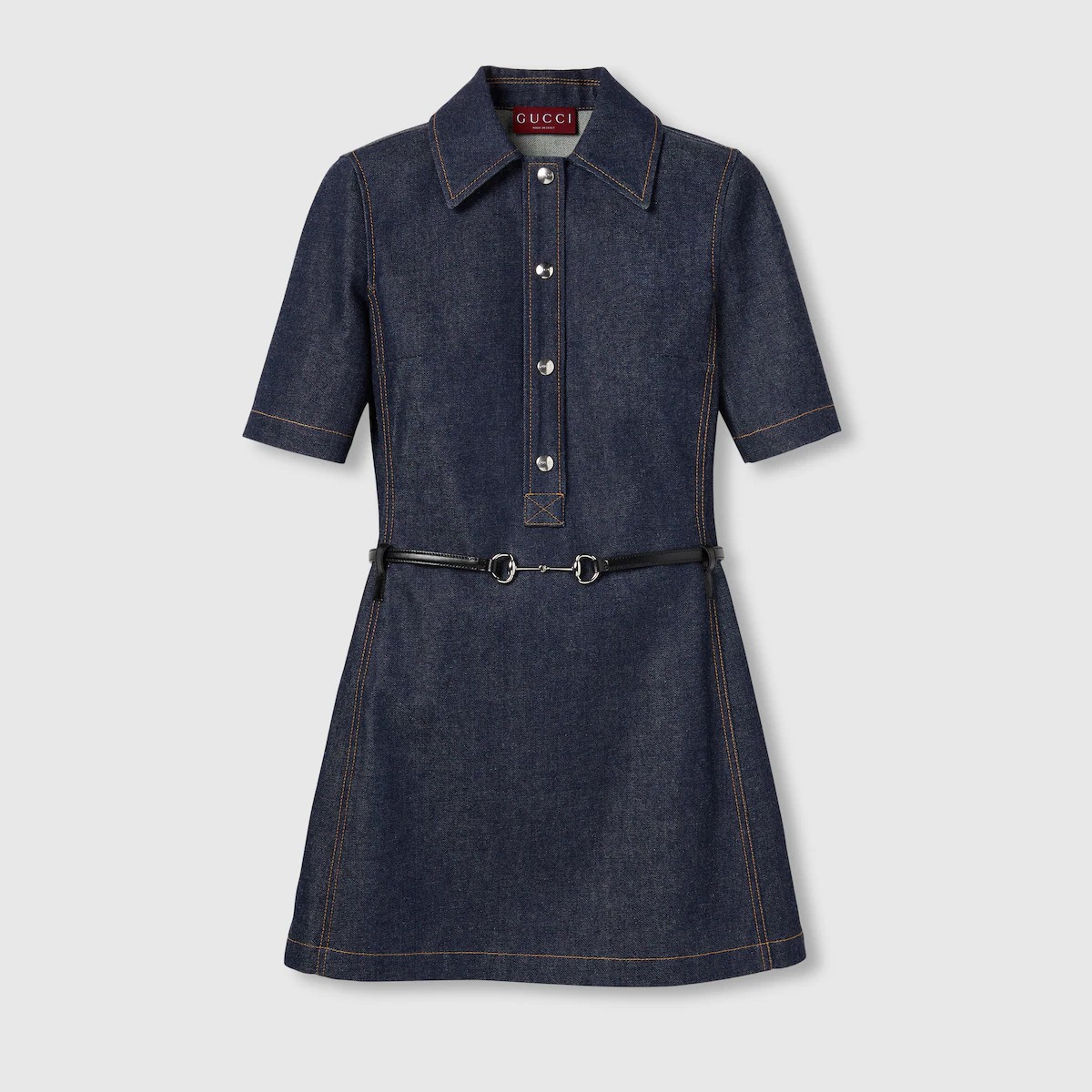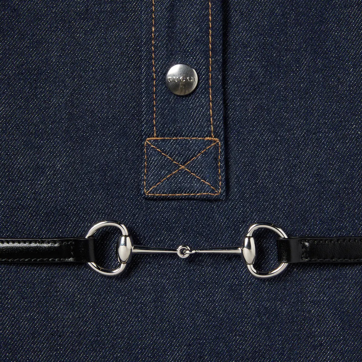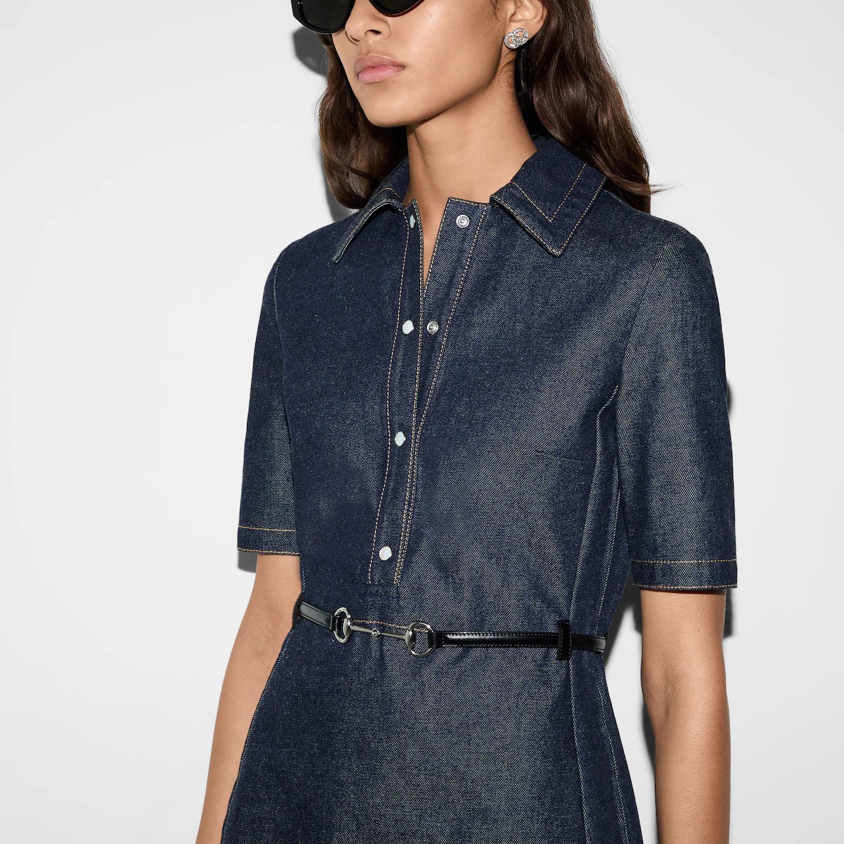 하우스의 핵심 소재로 계속 등장하는 데님. 독특한 시선으로 쉐입과 시그니처 소재에 대한 발상을 전환하여 데일리 룩의 품격을 높이는 구찌 2025 크루즈 컬렉션. 데님 바탕에 실버 톤 홀스빗 메탈 장식이 있는 탈부착 가능한 레더 벨트를 매치한 데님 미니 드레스.
