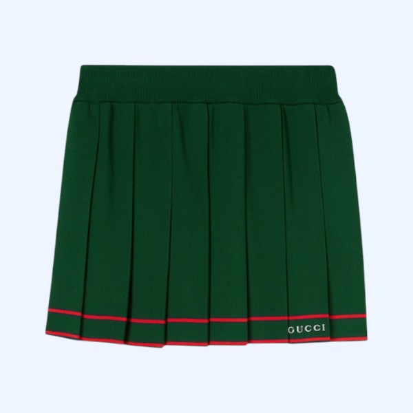 1970년대에 시작된 하우스와 테니스와의 관계를 계속해서 탐색하는 구찌. 웹(Web) 스트라이프와 같은 전통적인 디테일뿐만 아니라 혁신적인 소재에도 주목한 시그니처 아이템. 콘트라스트 스트라이프 레드 트리밍과 구찌 자수가 시선을 사로잡는 파인 비스코스 플리츠 스커트.