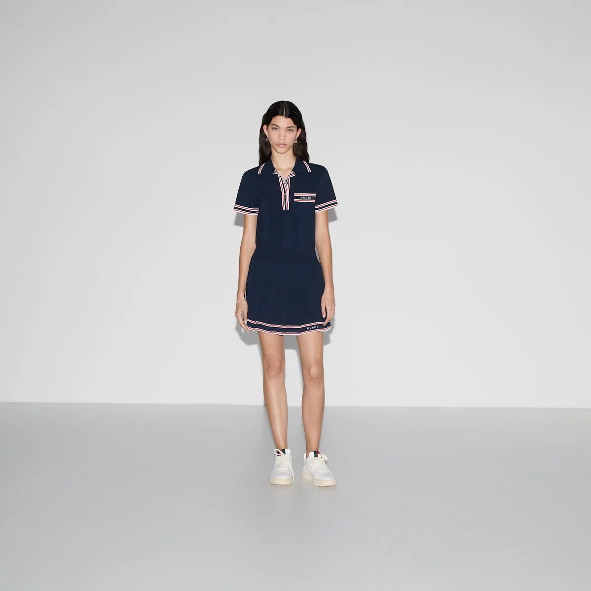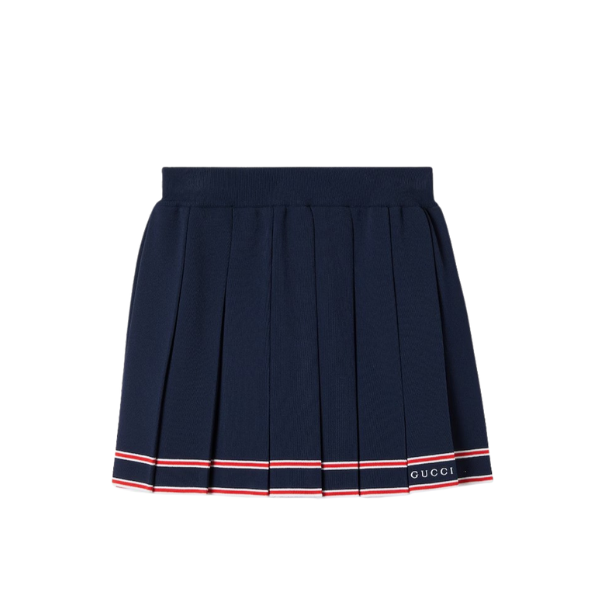 이탈리아 해변의 여름 감성과 비치 클럽의 영감을 표현하는 구찌 리도 컬렉션의 아이템입니다. 저지, 데님 및 그 밖의 다양한 소재로 만든 탑과 팬츠로 무한히 펼쳐지는 스타일링의 가능성. 섬세한 스트레치 비스코스 소재로 편안한 움직임과 착용감을 선사하는 플리츠 스커트. 하우스에 대한 경의를 표현하는 대조적인 스트라이프 트리밍과 구찌 자수로 세련된 디자인을 완성함.