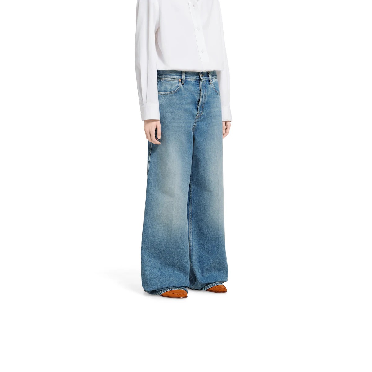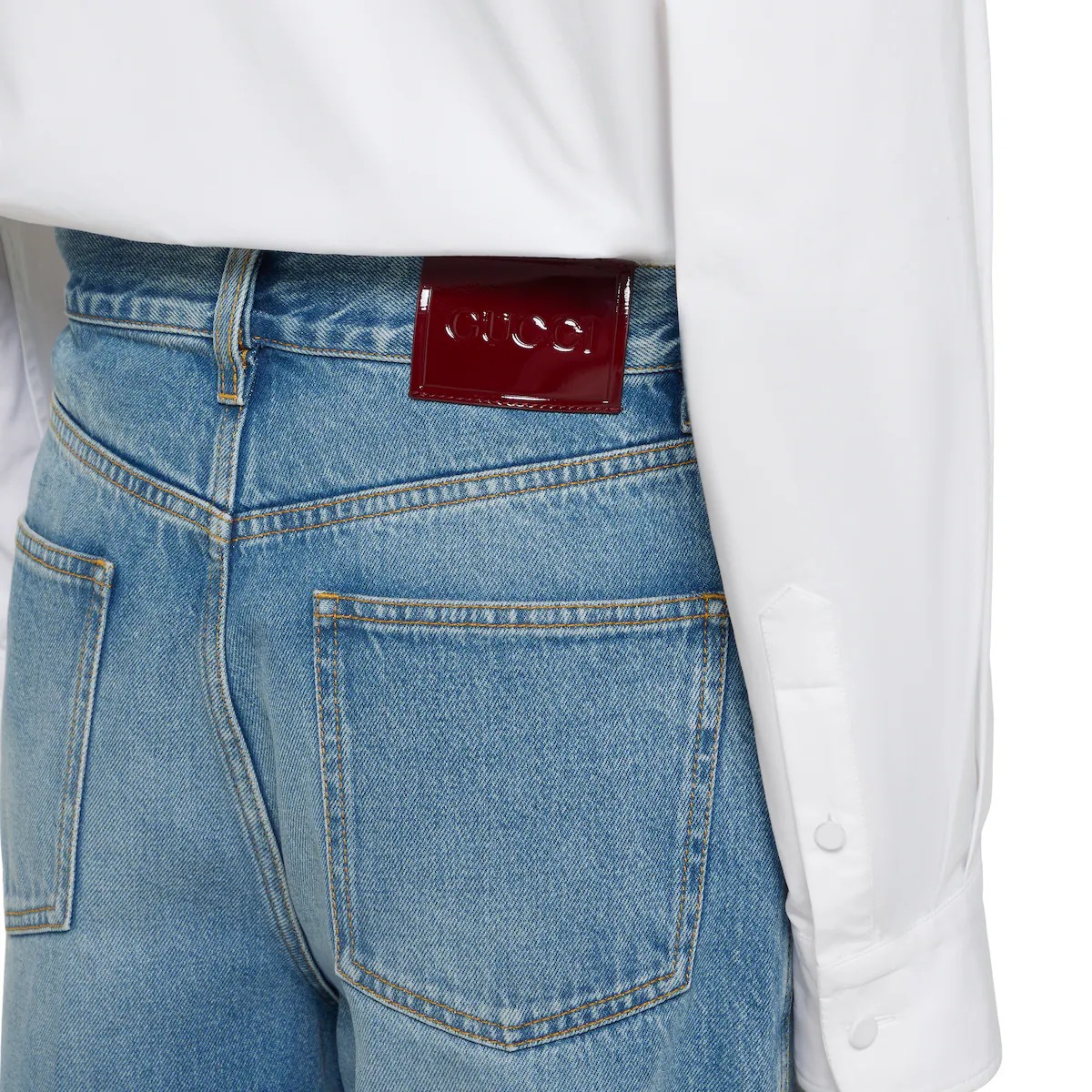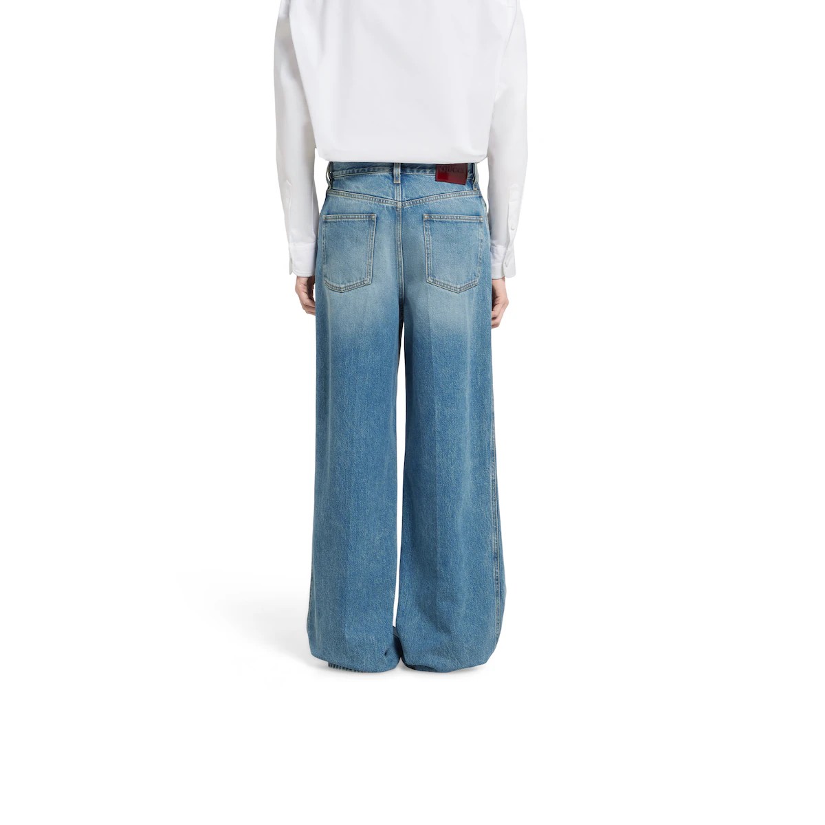캐주얼한 데일리 룩의 품격을 높이는 정교한 디테일로 데님에 대한 참신한 해석을 보여주는 2025 프리폴 컬렉션. 스톤 워시드 코튼 데님 소재에 구찌 로소 앙코라 나플락 라벨로 디자인을 완성한 5포켓 스타일의 와이드 레그 팬츠.