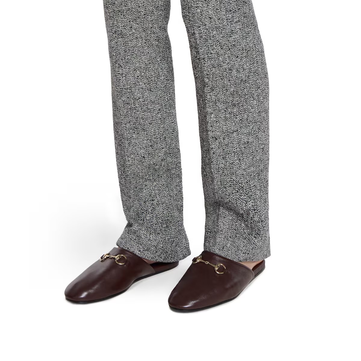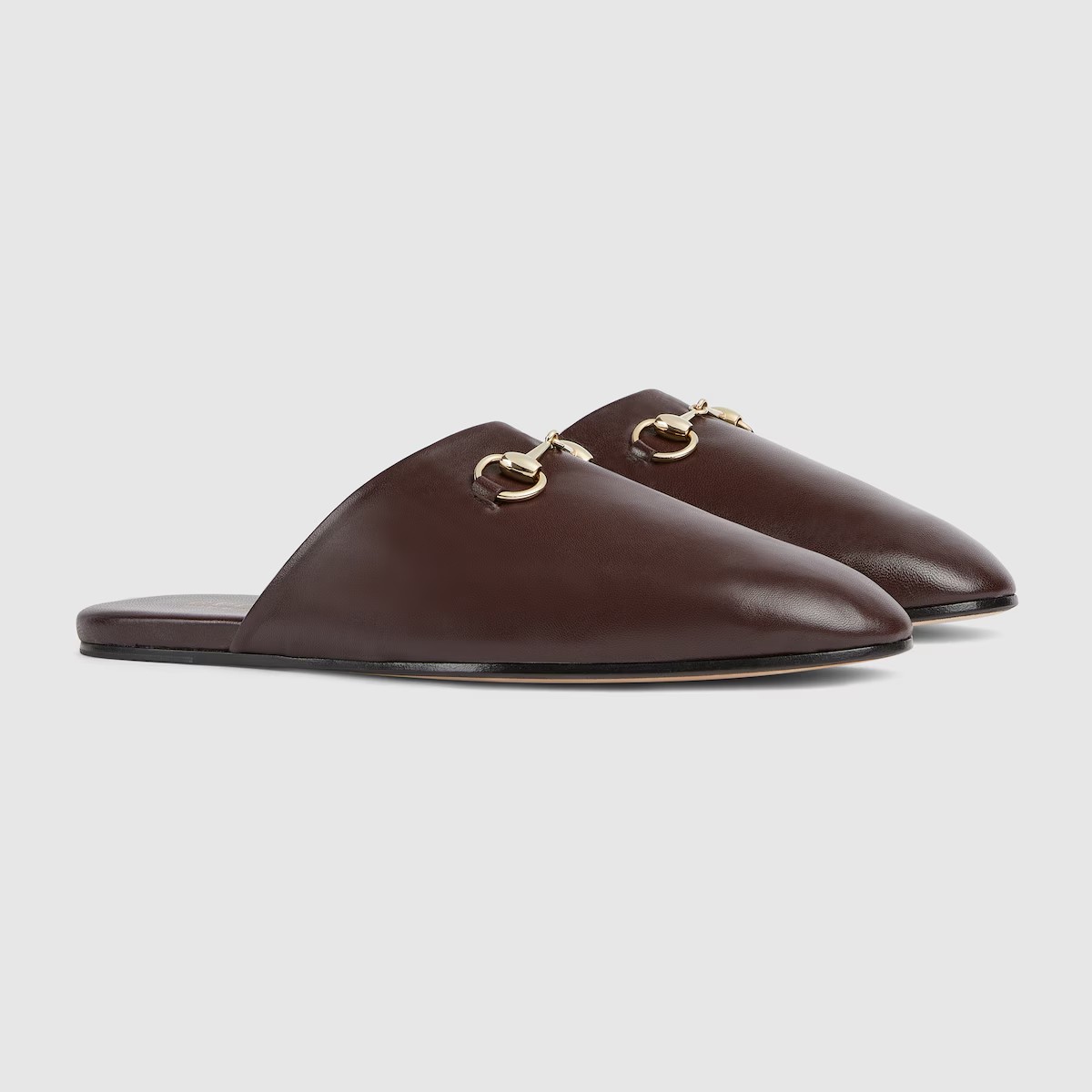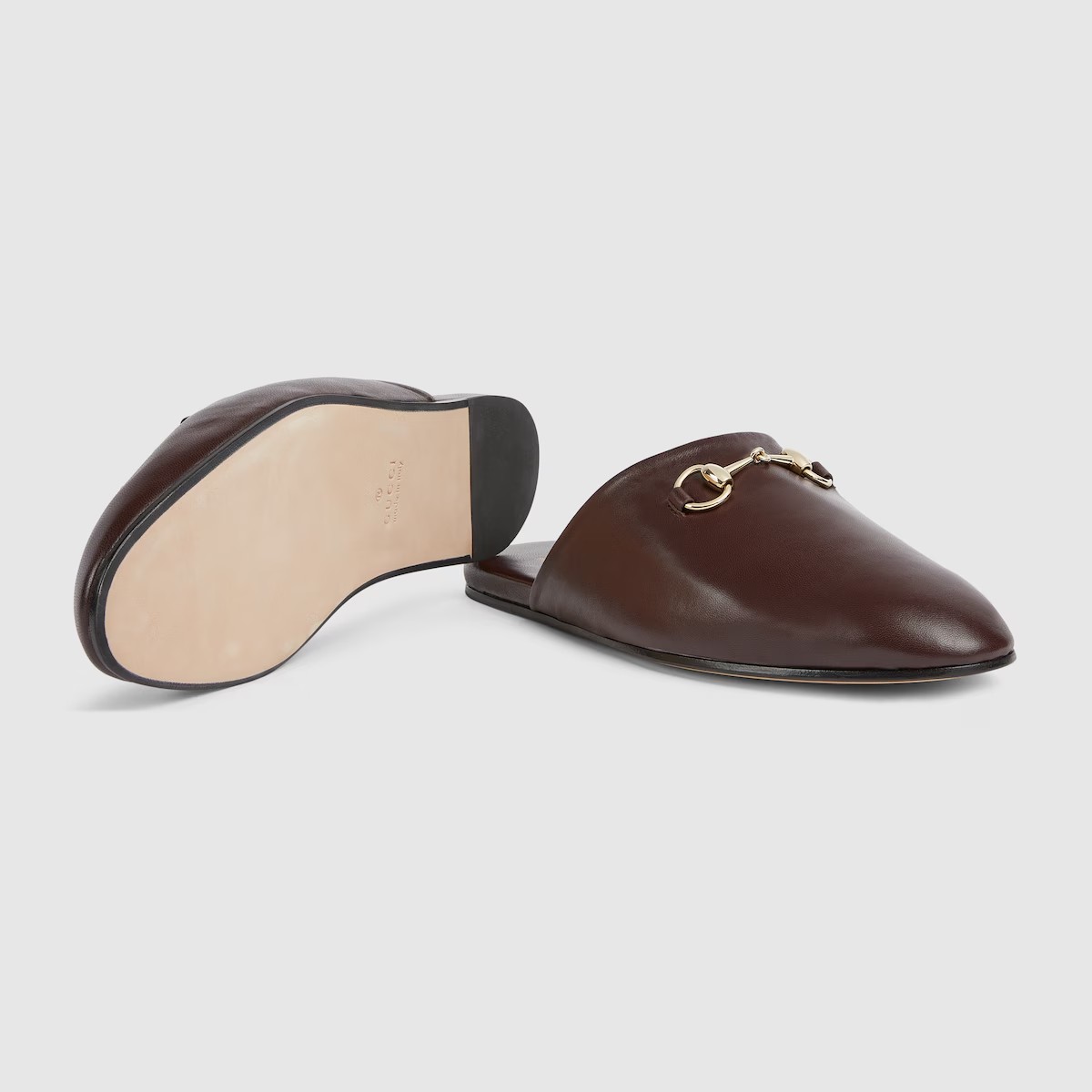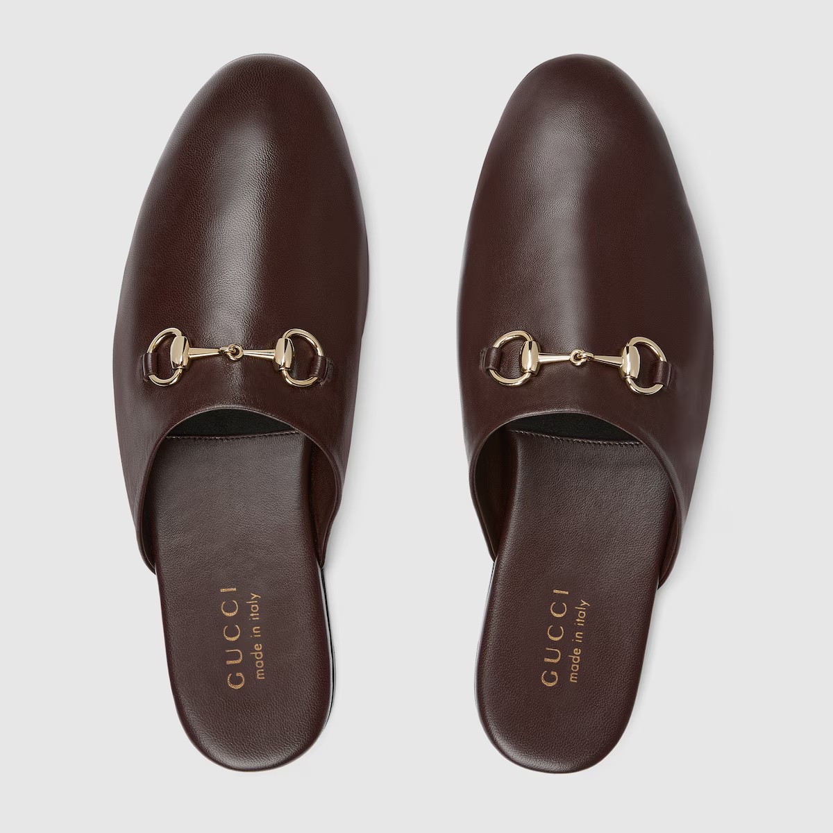 2025 가을-겨울 컬렉션, 구찌가 지속적으로 선보이는 아카이브 심볼. 최신 컬렉션에서 하우스의 승마 정통성을 되살린 홀스빗 메탈 장식. 유연한 레더 바탕에 라이트 골드 톤 메탈 장식으로 완벽한 스타일링을 선사하는 남성 뮬.