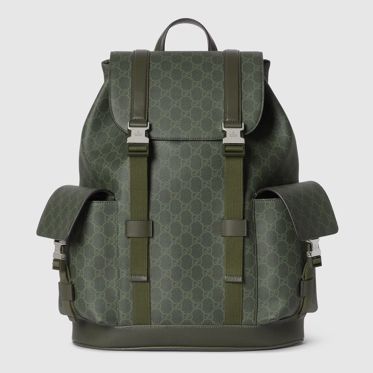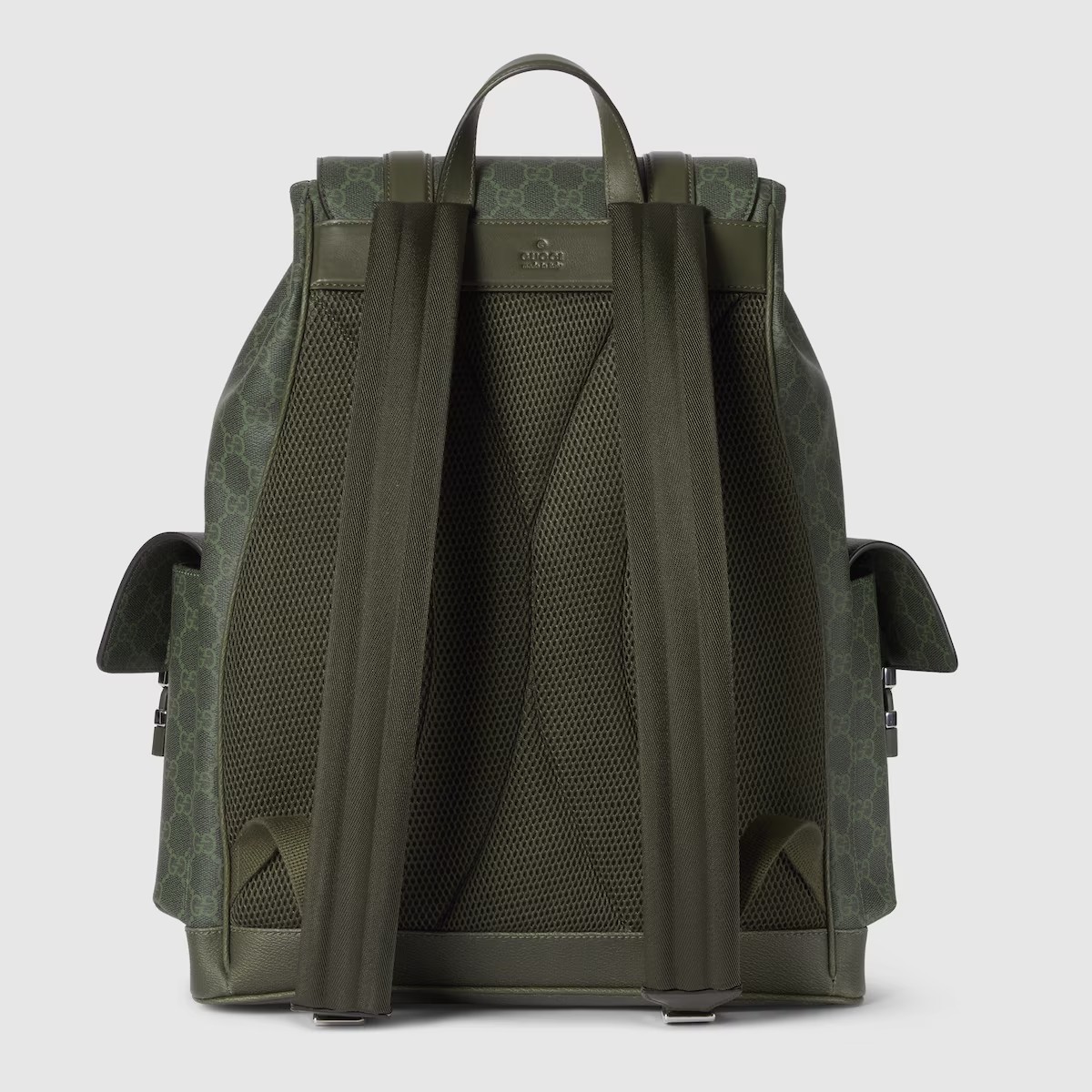 하우스의 시그니처 모티브를 새롭게 재해석한 2025 가을-겨울 컬렉션의 GG 모노그램 코팅 패브릭. 이 소재는 라지 백팩 전면에 적용되었으며 토널 레더 트리밍으로 마무리됩니다.