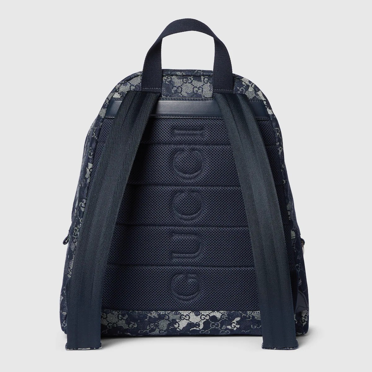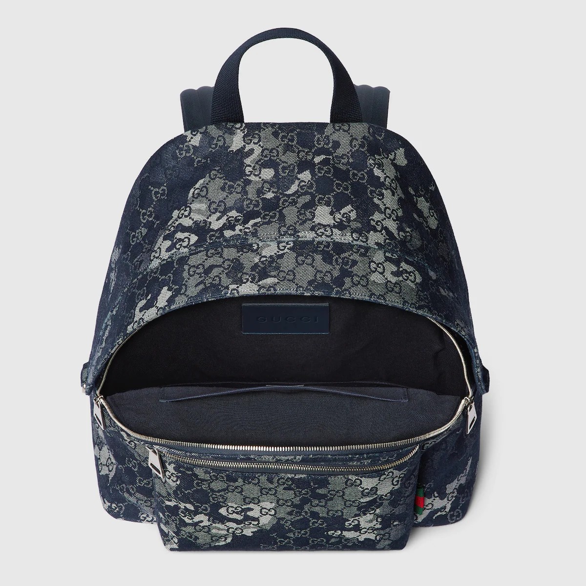 토널 카무플라주 효과로 새롭게 재해석한 2025 가을-겨울 컬렉션의 GG 데님. 이 소재는 라지 백팩 전면에 적용되었으며, 그린/레드의 웹(Web) 디테일과 뒷면의 구찌 로고가 돋보입니다.