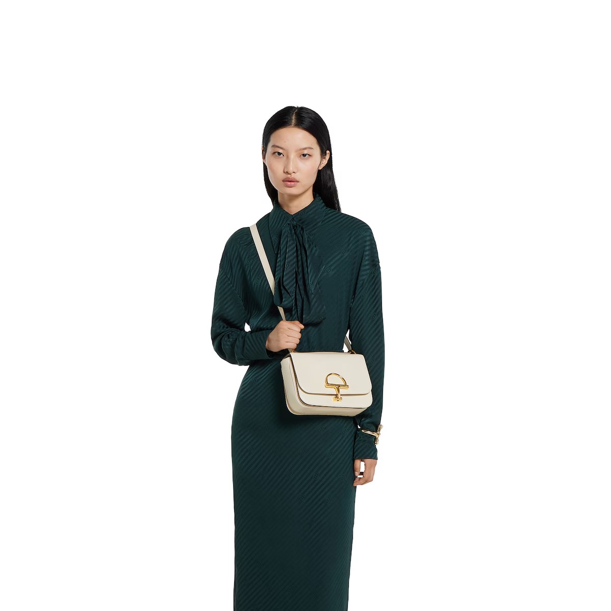 2025 가을-겨울 컬렉션, 2025 가을-겨울 런웨이에서 새롭게 선보인 구찌 시에나 스몰 숄더백으로, 구찌 특유의 시그니처 코드인 홀스빗을 혁신적으로 재해석한 아이템. 파인 스무드 레더로 제작하여 구조감이 돋보이는 실루엣을 1970년도에 처음으로 소개한 구찌만의 디테일인 하프 홀스빗 클래스프로 강조함. 골드 톤 메탈 장식으로 스타일을 완성했으며, 안감을 댄 내부에는 세 개의 거싯과 두 개의 지퍼 포켓이 있음.