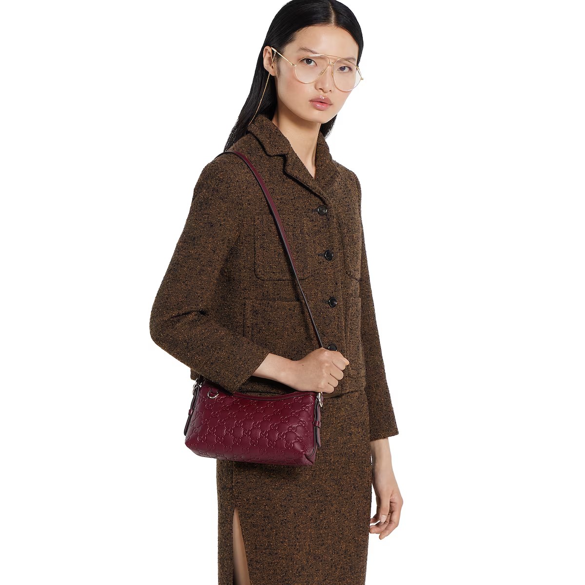 2025 가을-겨울 컬렉션, GG 엠블럼 컬렉션은 하우스의 우아함과 장인 정신의 역사를 재해석합니다. GG 엠보스 레더로 제작한 숄더백.
