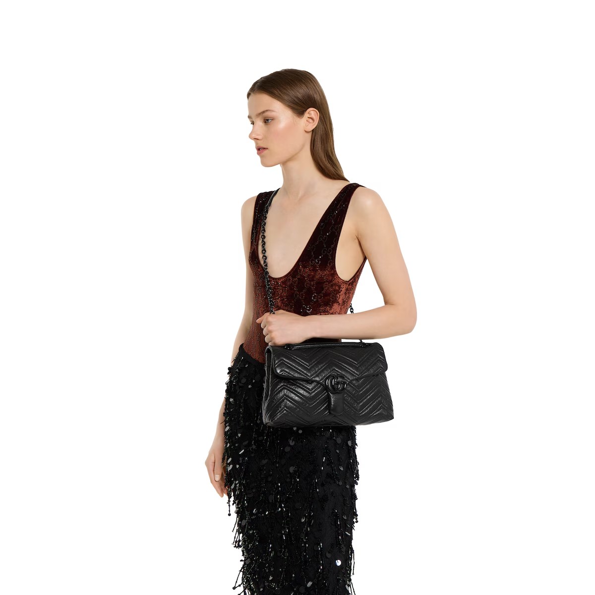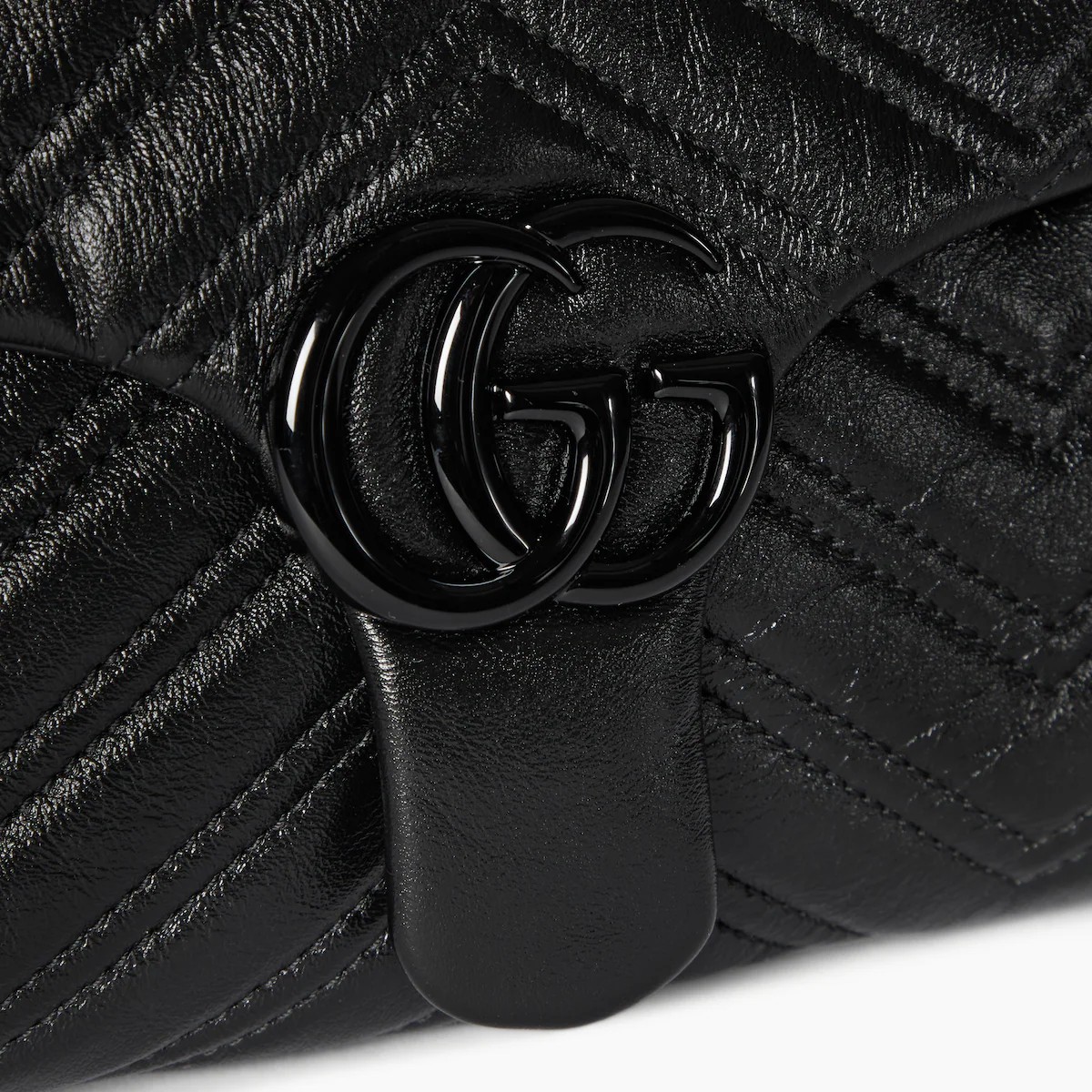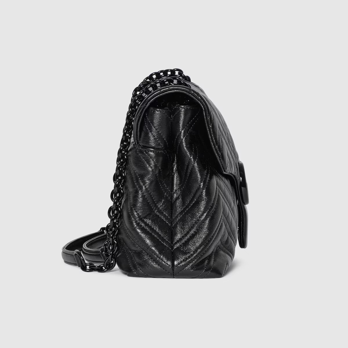 2025 가을-겨울 컬렉션, 상징적인 더블 G, 다면체 체인 스트랩, 부드러운 구조감이 돋보이는 실루엣이 특징인 하우스의 시그니처 컬렉션 GG 마몽. 부드럽고 가벼운 마틀라세 쉐브론 레더 소재에 토널 에나멜 메탈 장식과 체인을 더한 스타일.