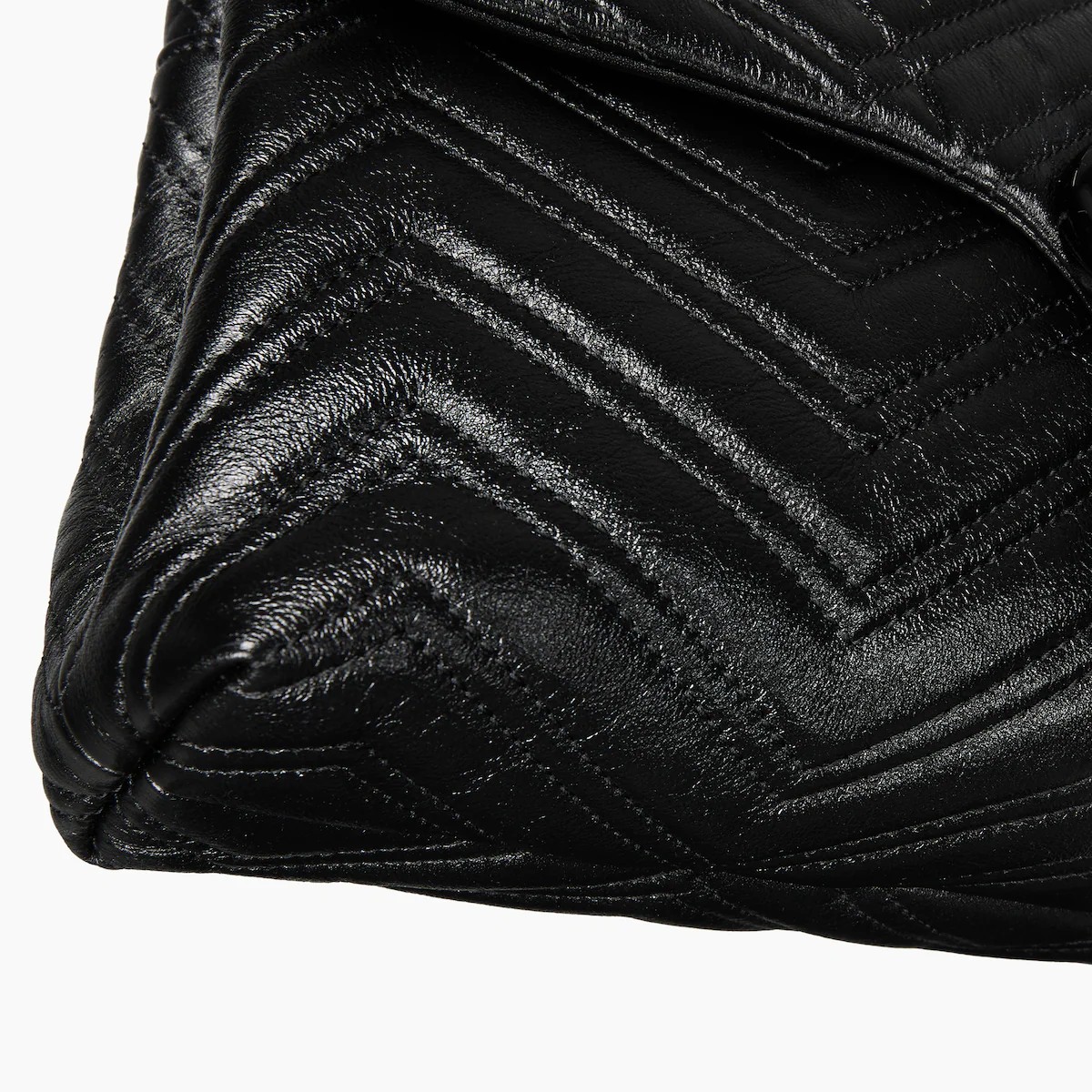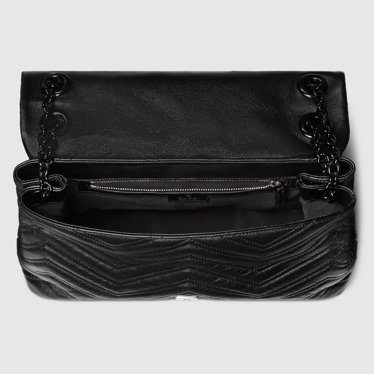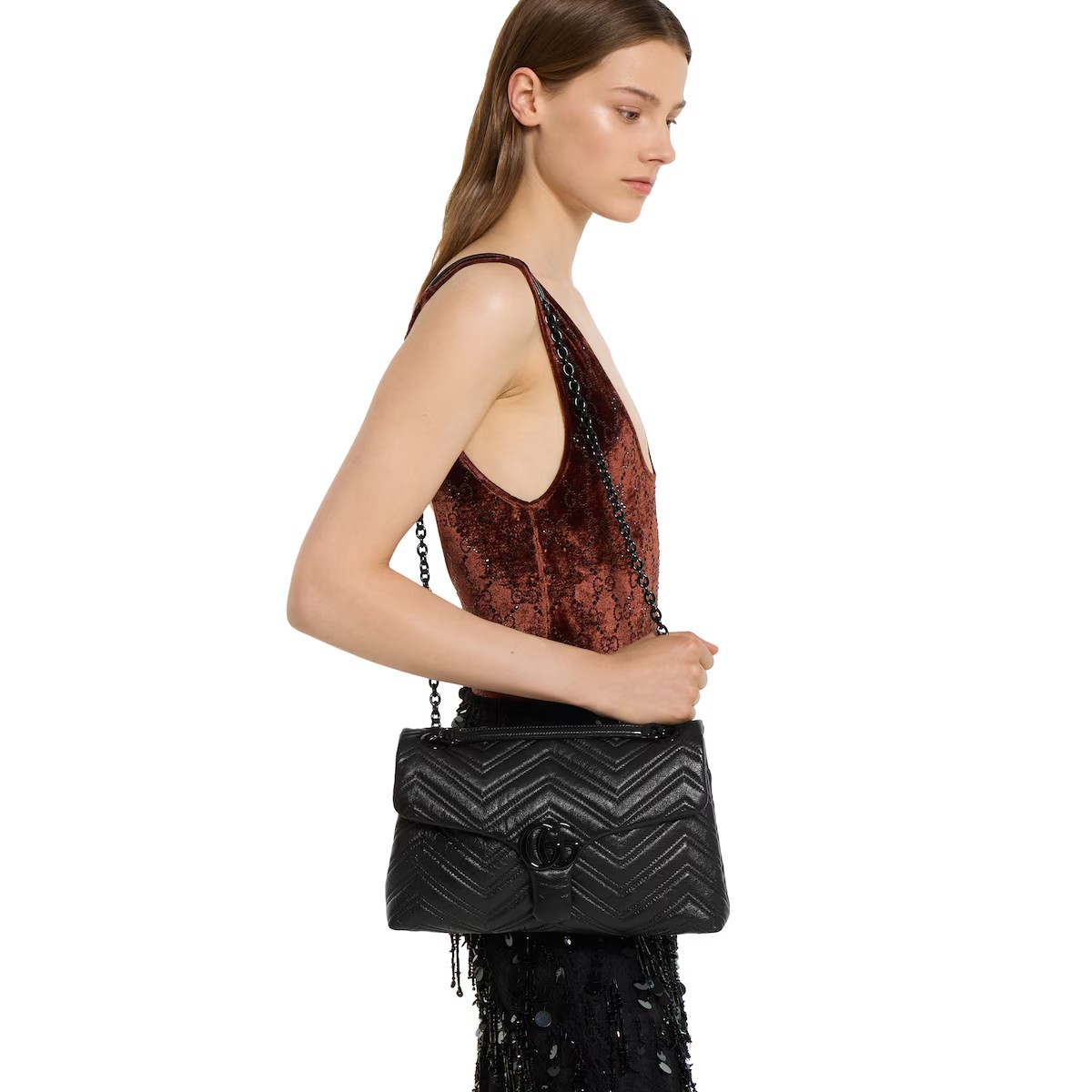 2025 가을-겨울 컬렉션, 상징적인 더블 G, 다면체 체인 스트랩, 부드러운 구조감이 돋보이는 실루엣이 특징인 하우스의 시그니처 컬렉션 GG 마몽. 부드럽고 가벼운 마틀라세 쉐브론 레더 소재에 토널 에나멜 메탈 장식과 체인을 더한 스타일.
