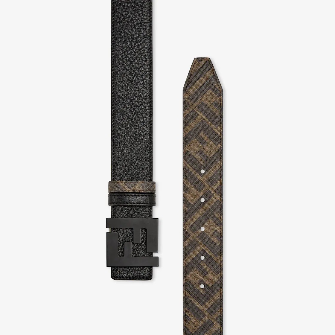 두 개의 루프가 있는 리버서블 벨트. 아이코닉한 FF 스터드 버클. 블랙 컬러의 셀러리아 가죽 소재. 토바코와 블랙 컬러의 FF 모티프 디자인 패브릭으로 된 반대쪽 면. 블랙 컬러의 에나멜 메탈웨어. Made in Italy
