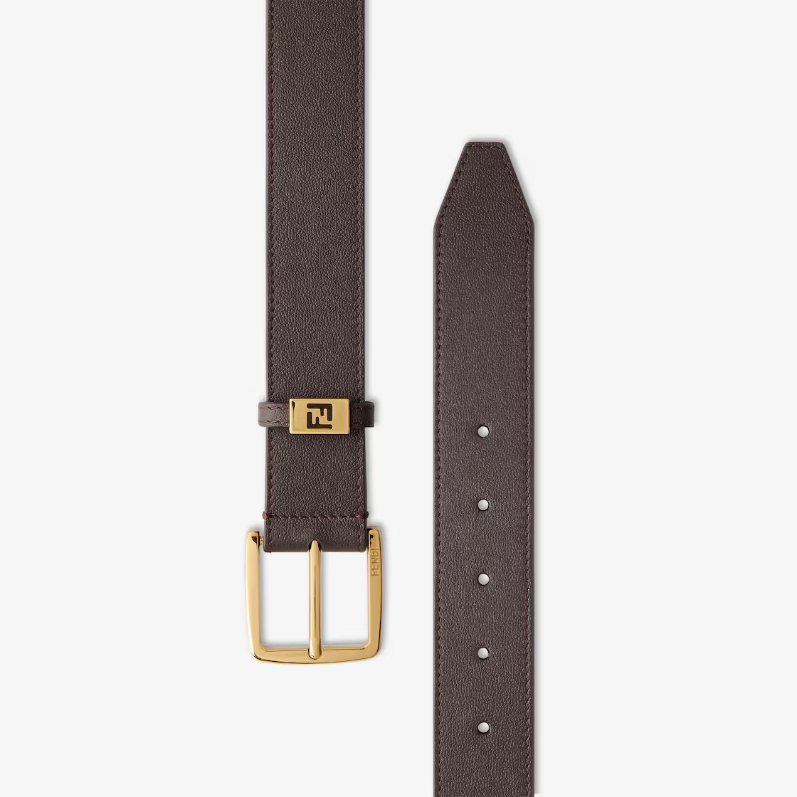 핀 버클과 루프가 있는 벨트, FF 디테일. 브라운 가죽 소재. 골드 피니시 메탈웨어. Made in Italy