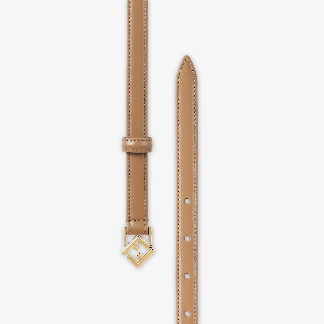 가느다란 벨트. 루프와 사선 FF 스터드 버클. 베이지 컬러 가죽 소재. 골드 피니시 메탈웨어. Made in Italy