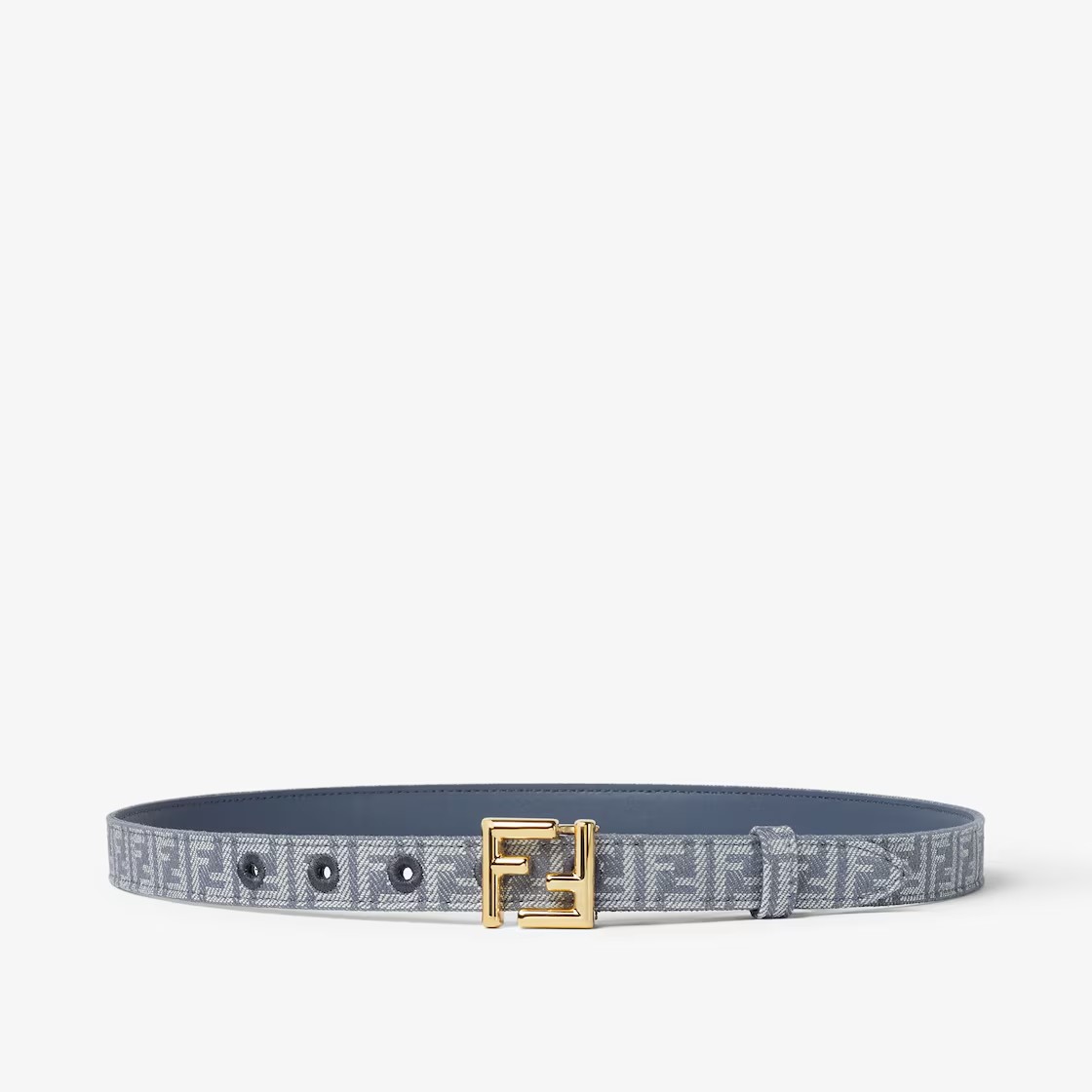 루프와 FF 스터드 버클을 부착한 슬림 벨트. 아이코닉 블루 FF 모티프의 데님 소재. 가죽 안감. 빈티지 골드 피니시의 메탈 액세서리. Made in Italy