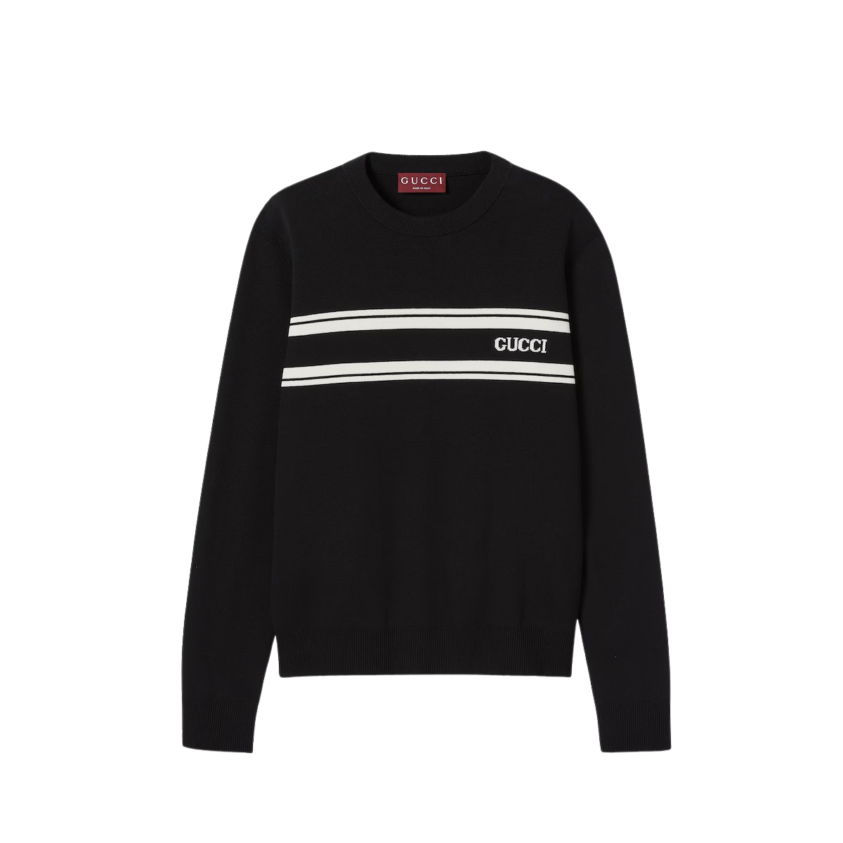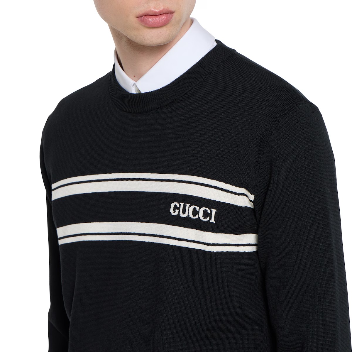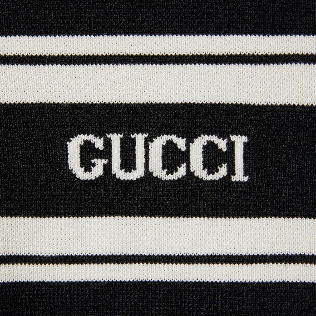 데이웨어부터 이브닝웨어까지 상징적인 디테일이 돋보이는 기본 실루엣을 강조하는 2025 프리폴 컬렉션 아이템. 블랙/화이트 실크 코튼 니트 소재로, 구찌 인타르시아가 시선을 사로잡는 스웨터.