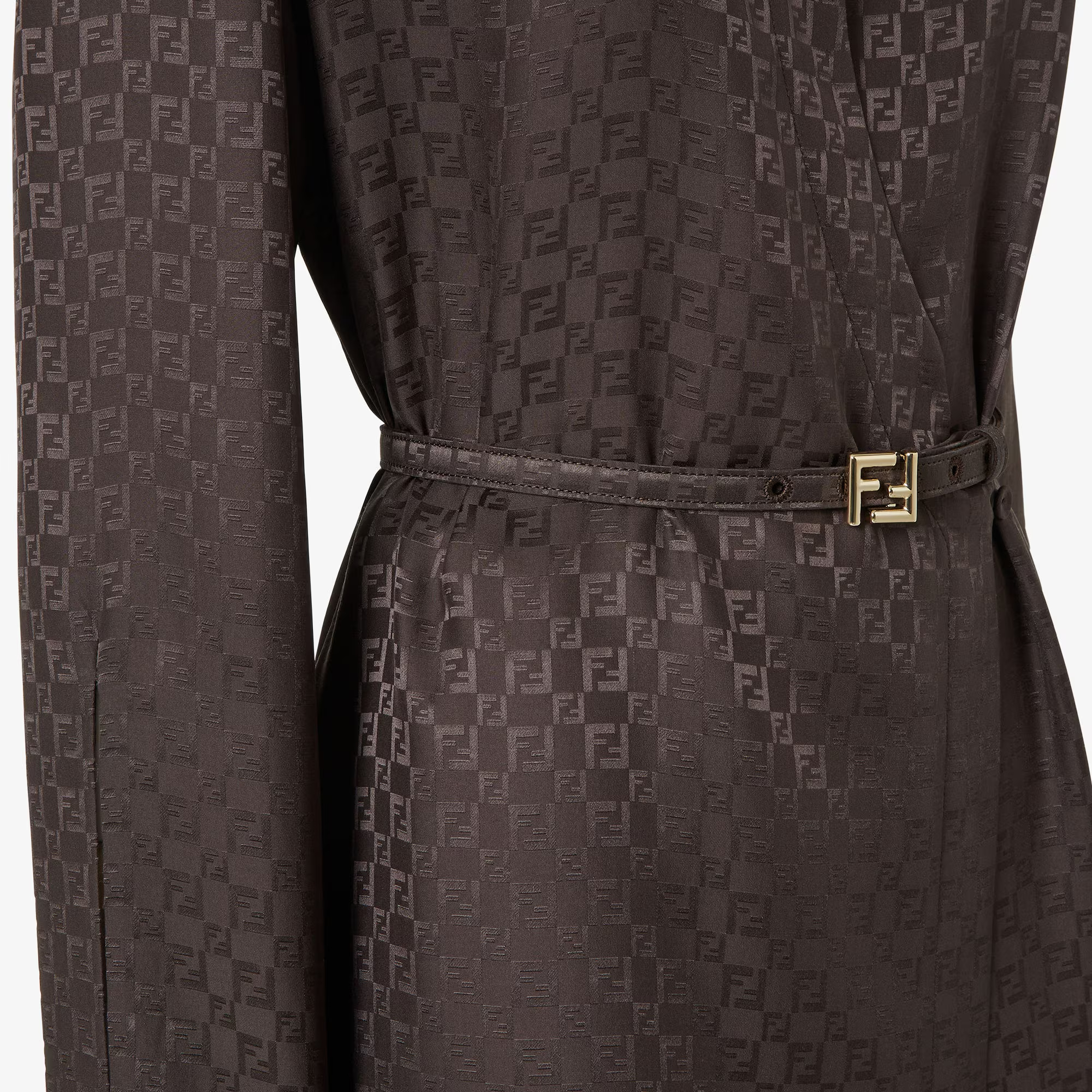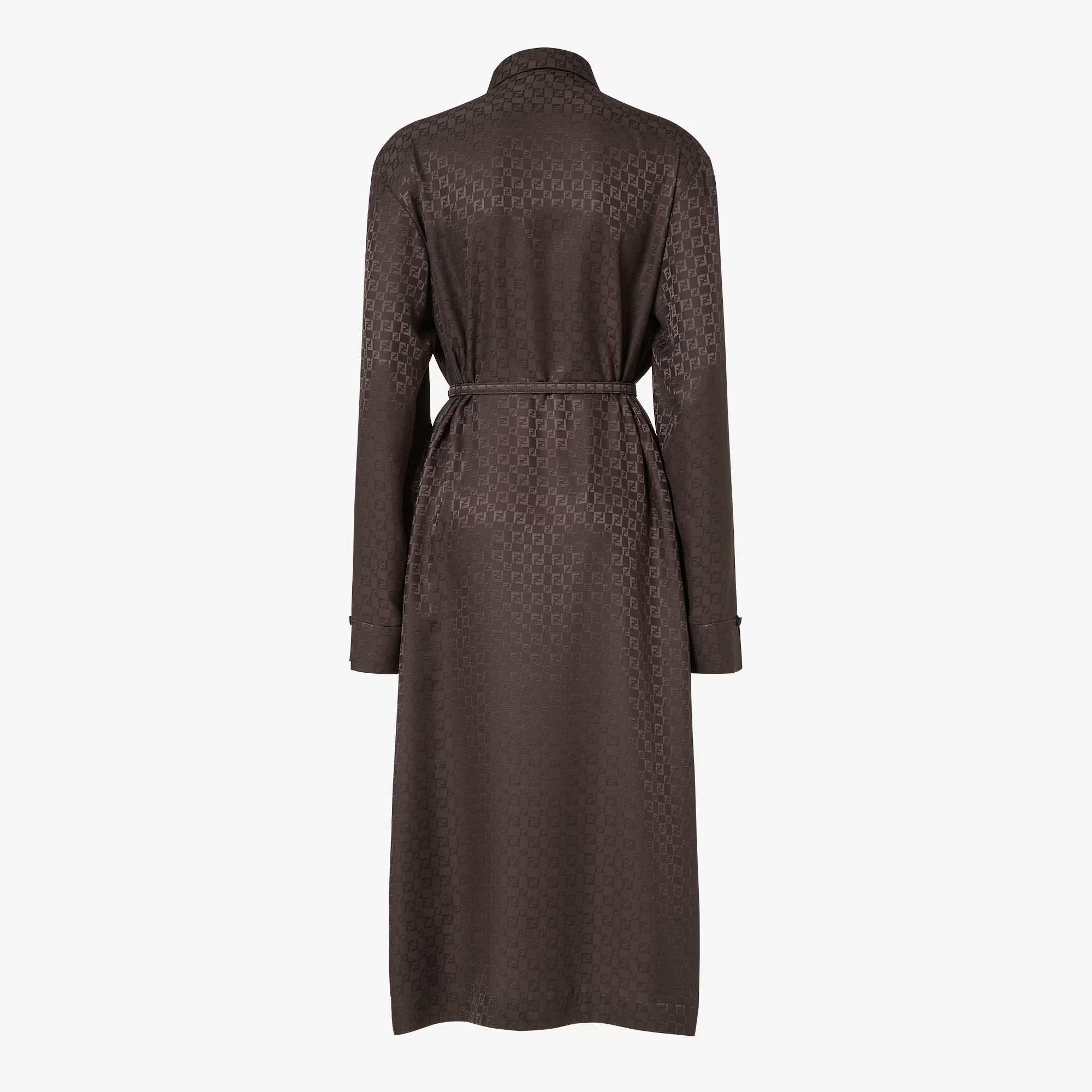 미디 셔츠 드레스. 셔츠 칼라 및 커프. 플로잉 스타일, 드롭 숄더 및 네크라인의 티어드롭 디테일. 비대칭 크로스 잠금, 옆면의 스몰 버튼. 자카드 실크 소재. 아이코닉 다크 브라운 컬러 체커 FF 모티프. FF 버클의 매칭 벨트.