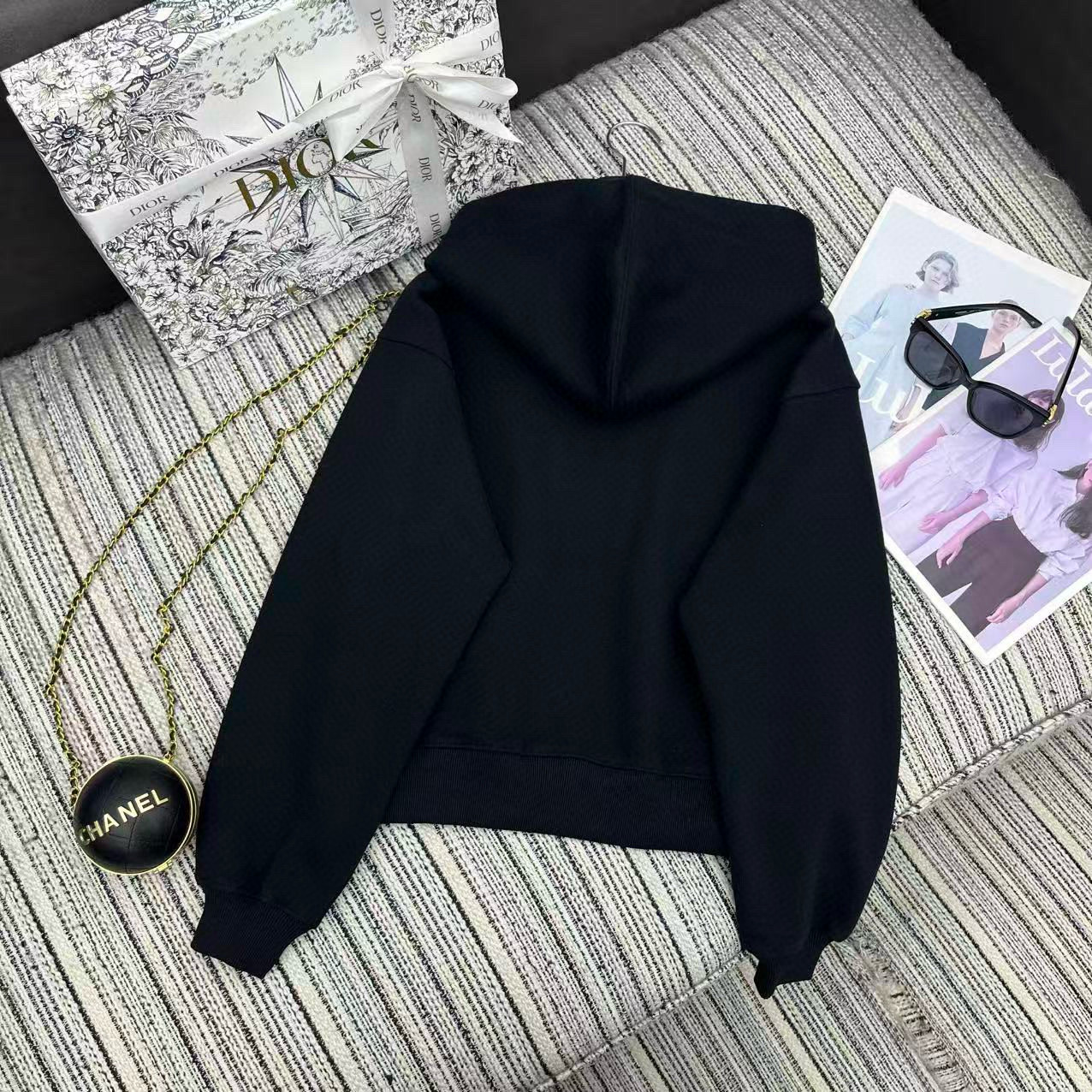 디올 벨벳 콘트라스트 후드 데일리룩