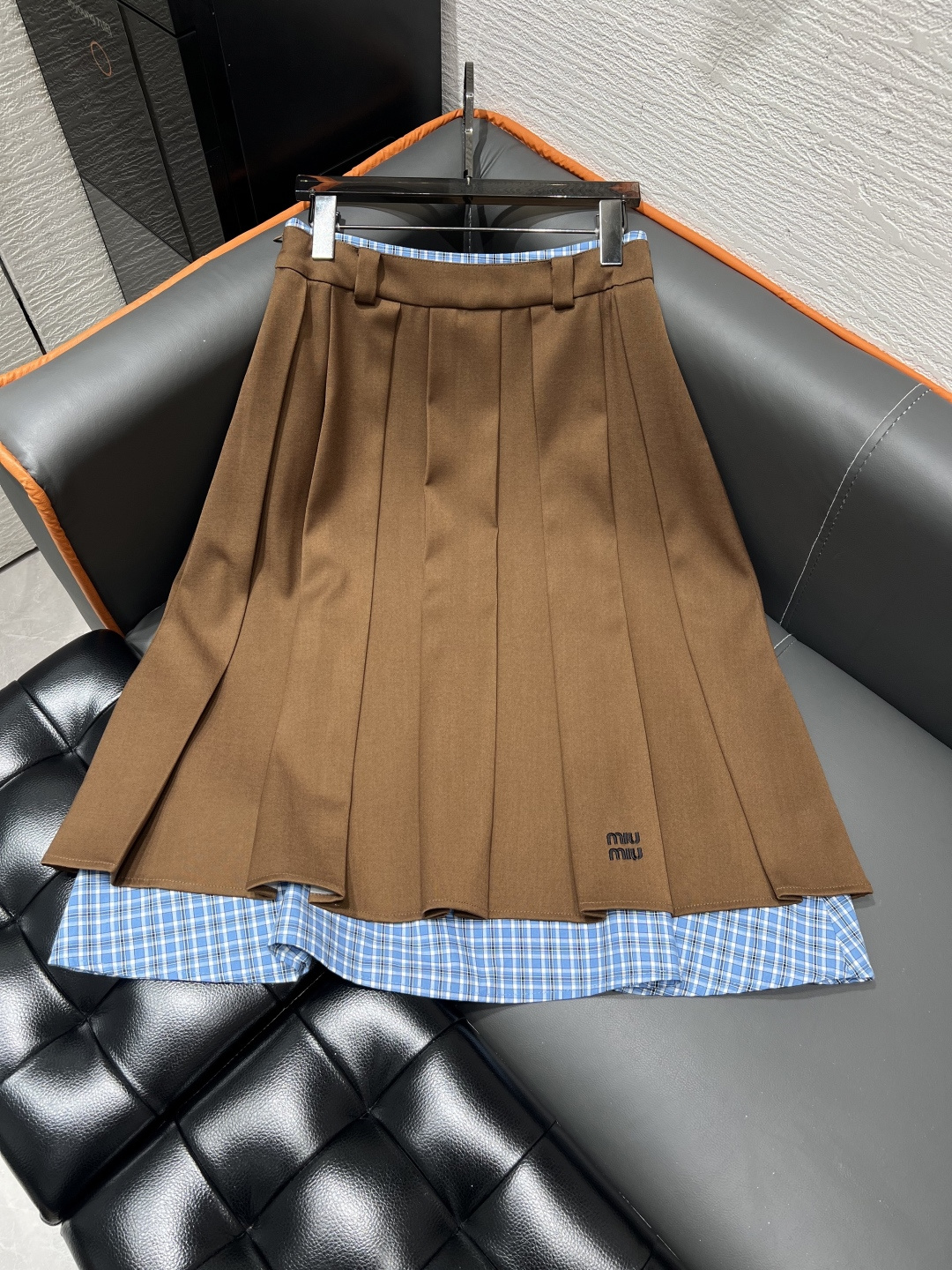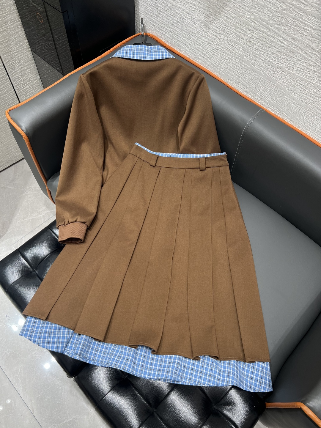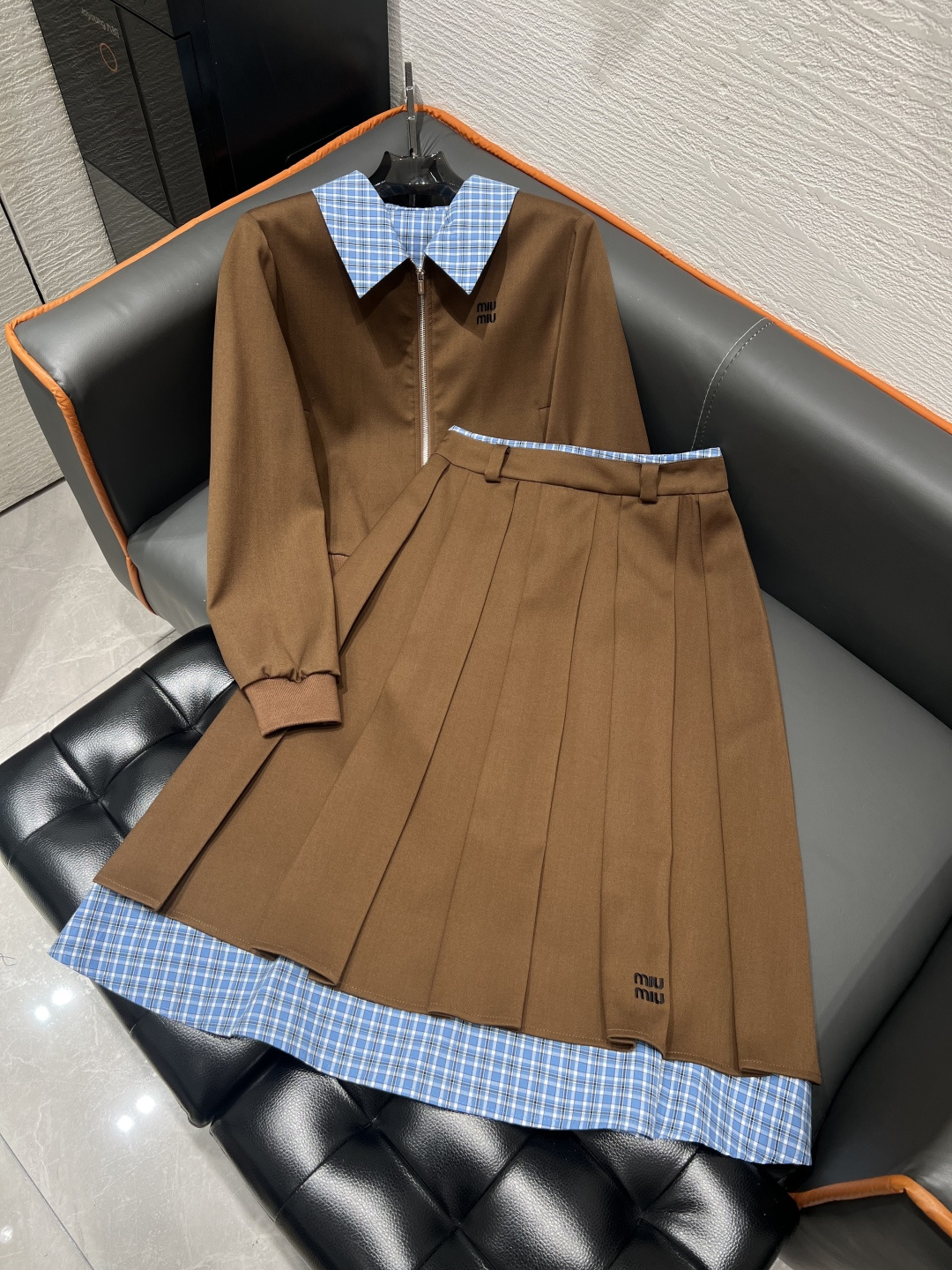 미우미우 라펠 콘트라스팅 플레드 탑 스커트
