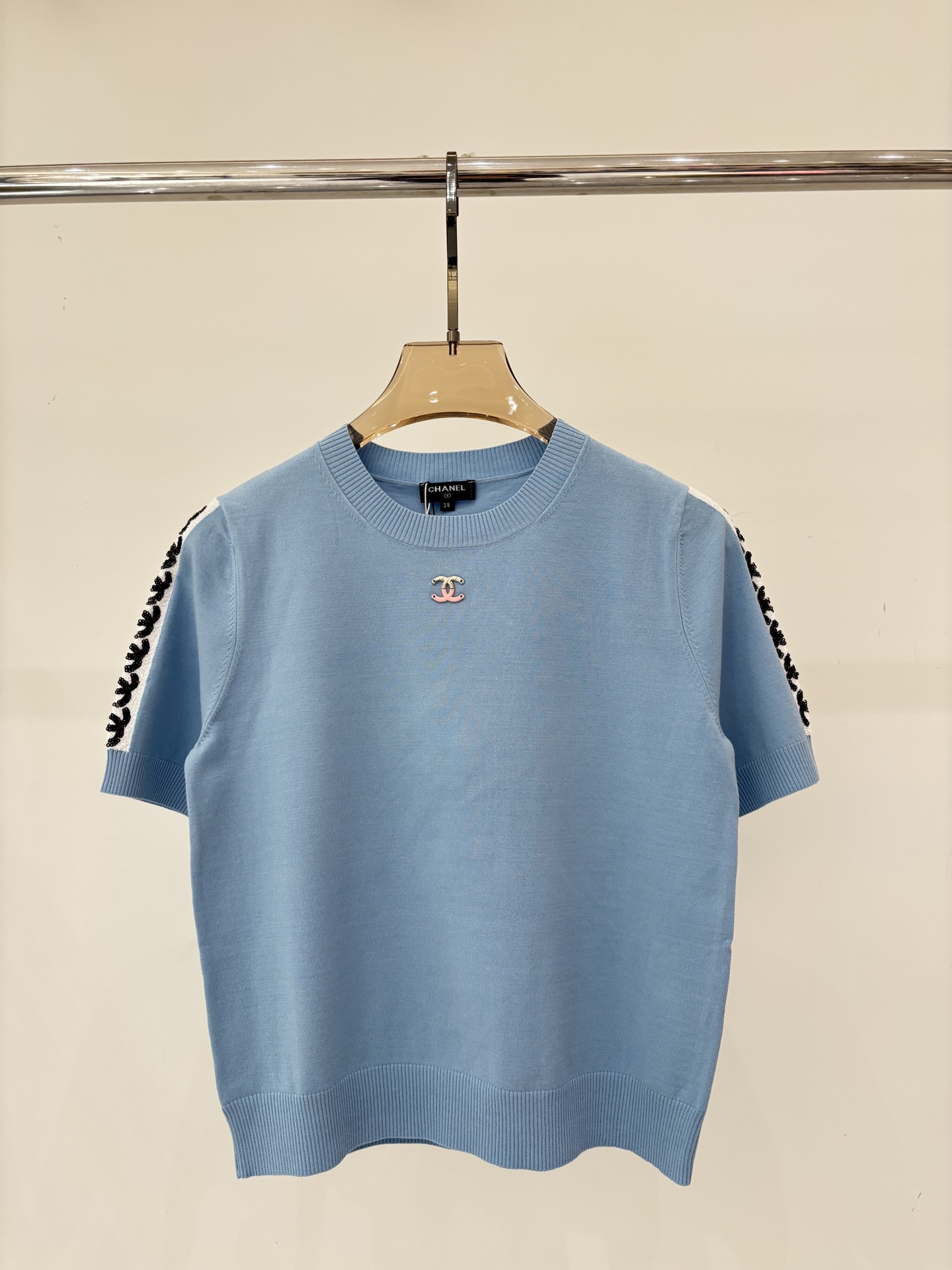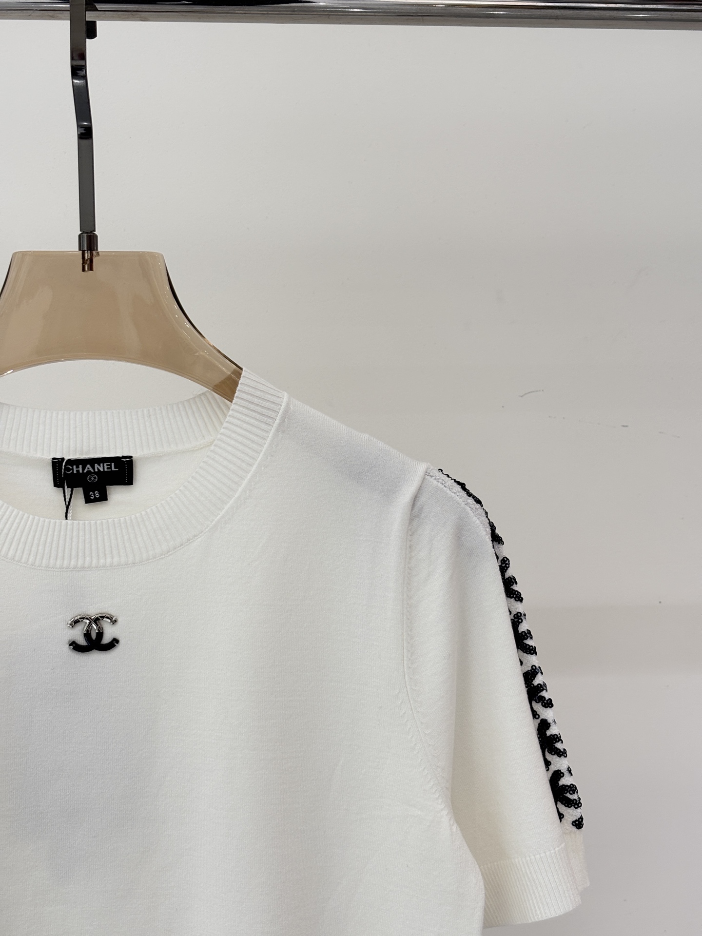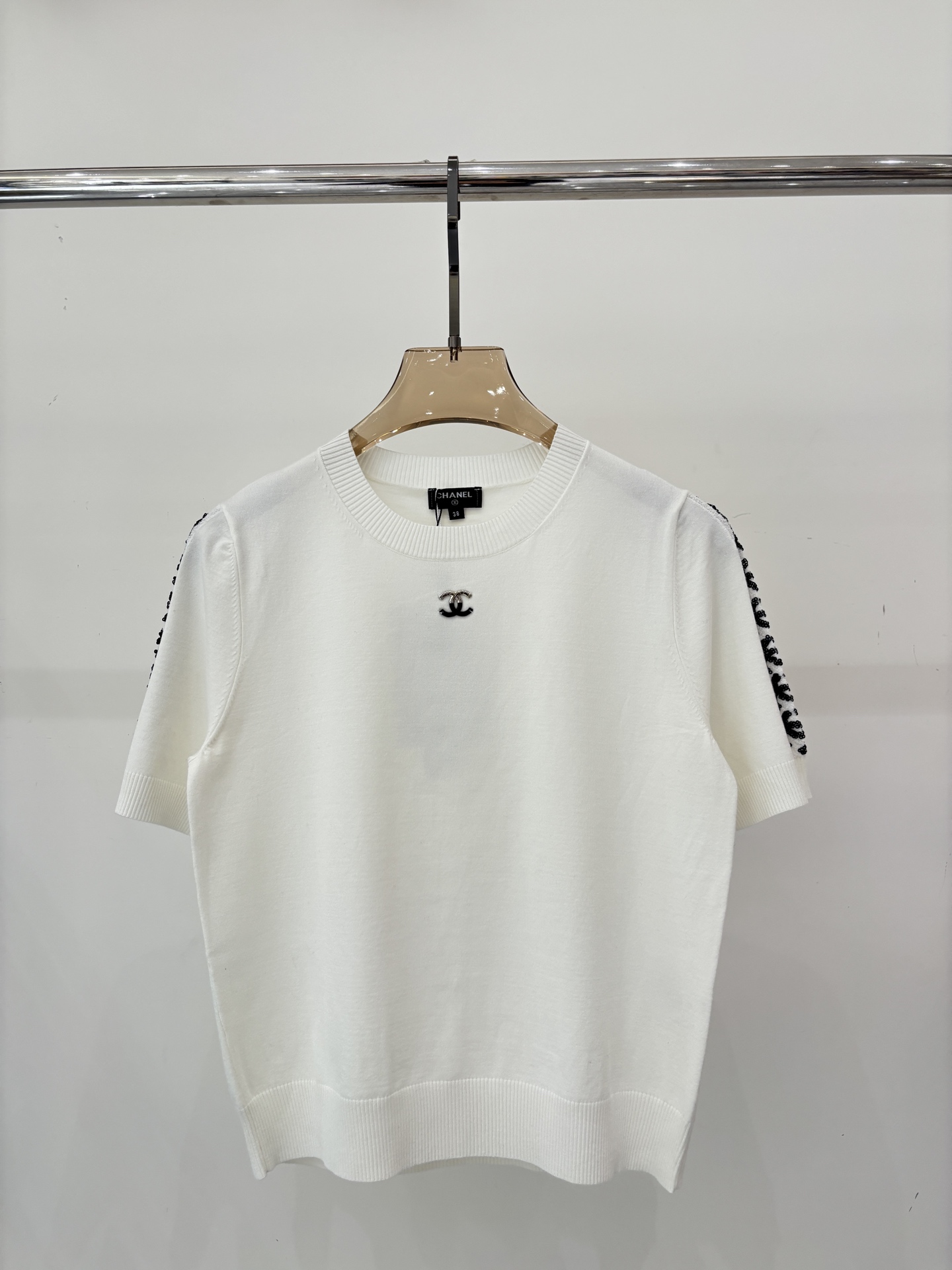 샤넬 라운드넥 체인 장식 스팽글 다이아몬드체크 반팔