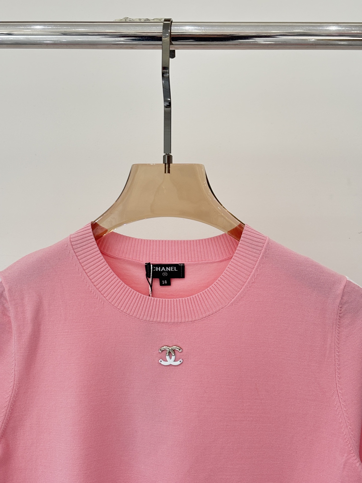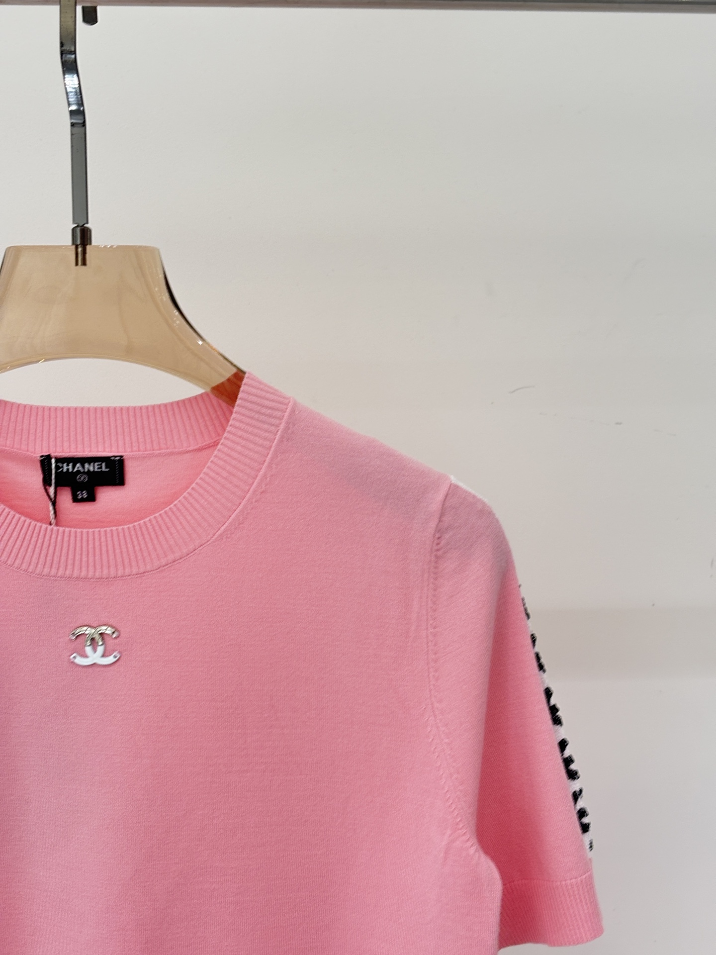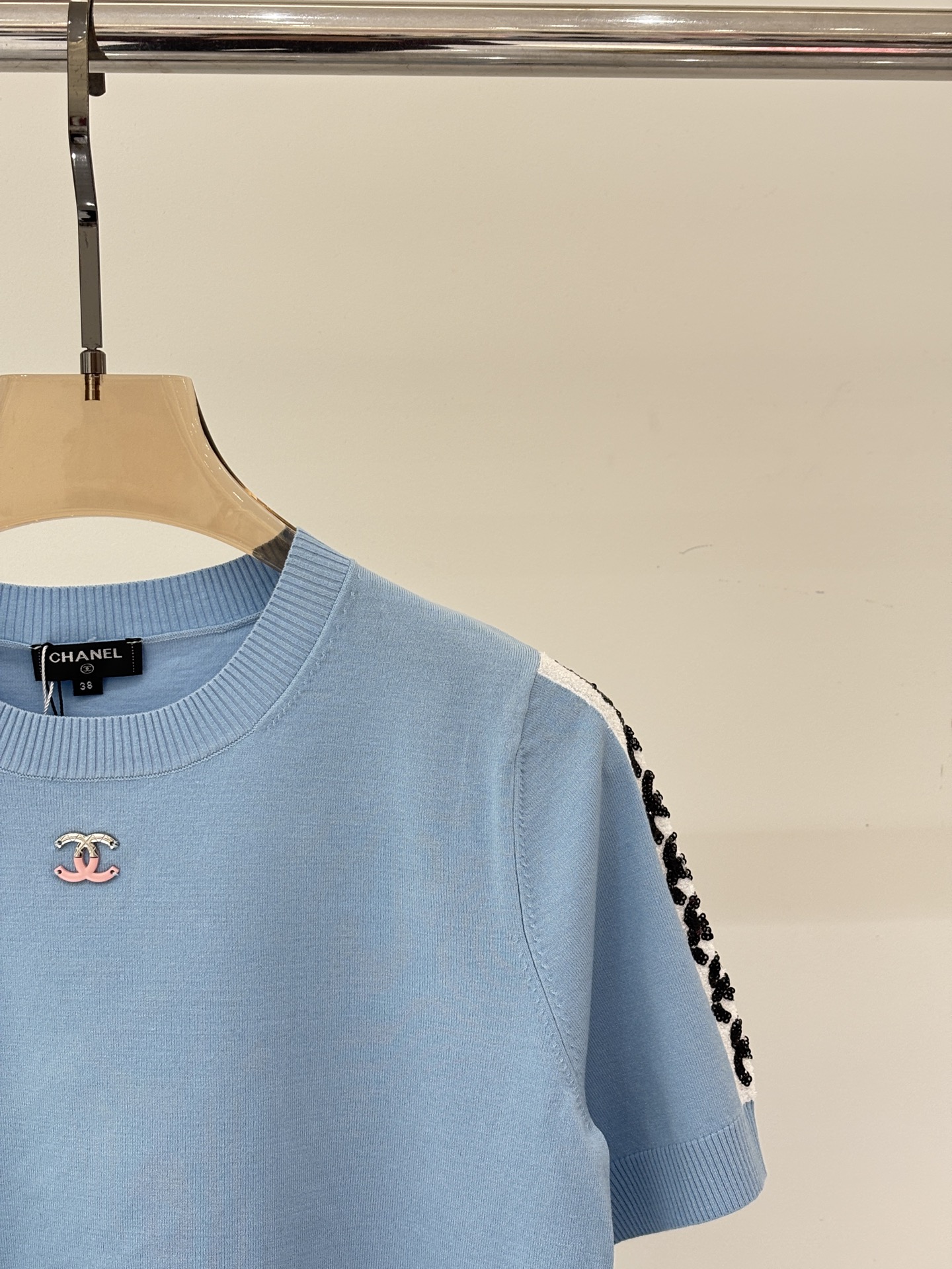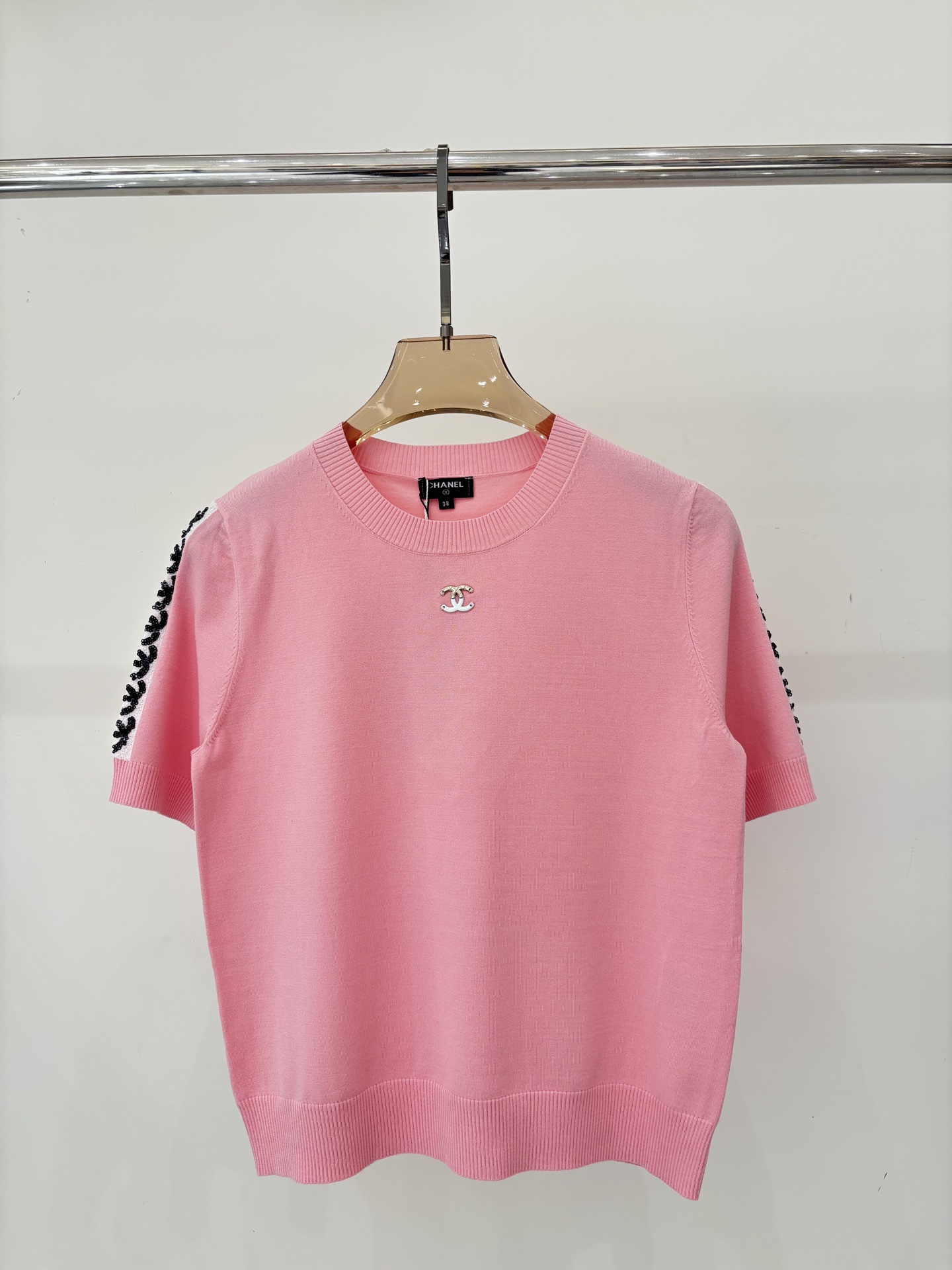 샤넬 라운드넥 체인 장식 스팽글 다이아몬드체크 반팔