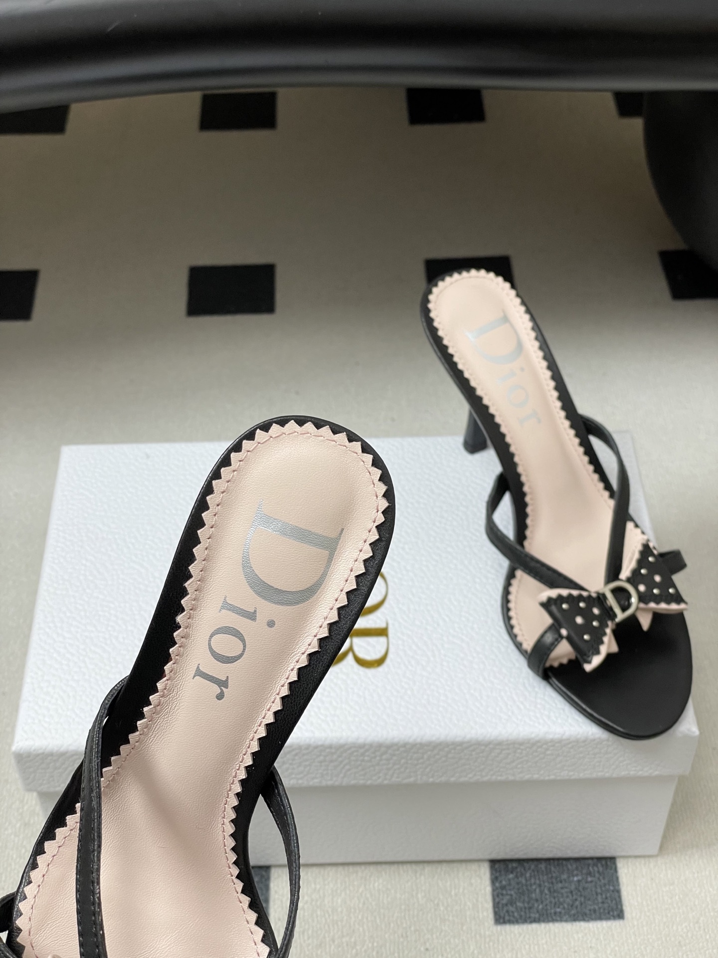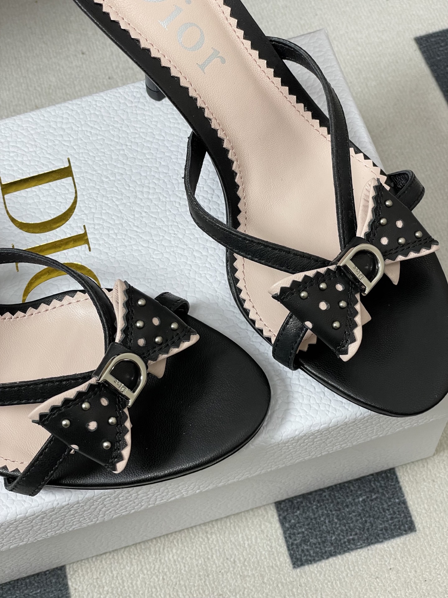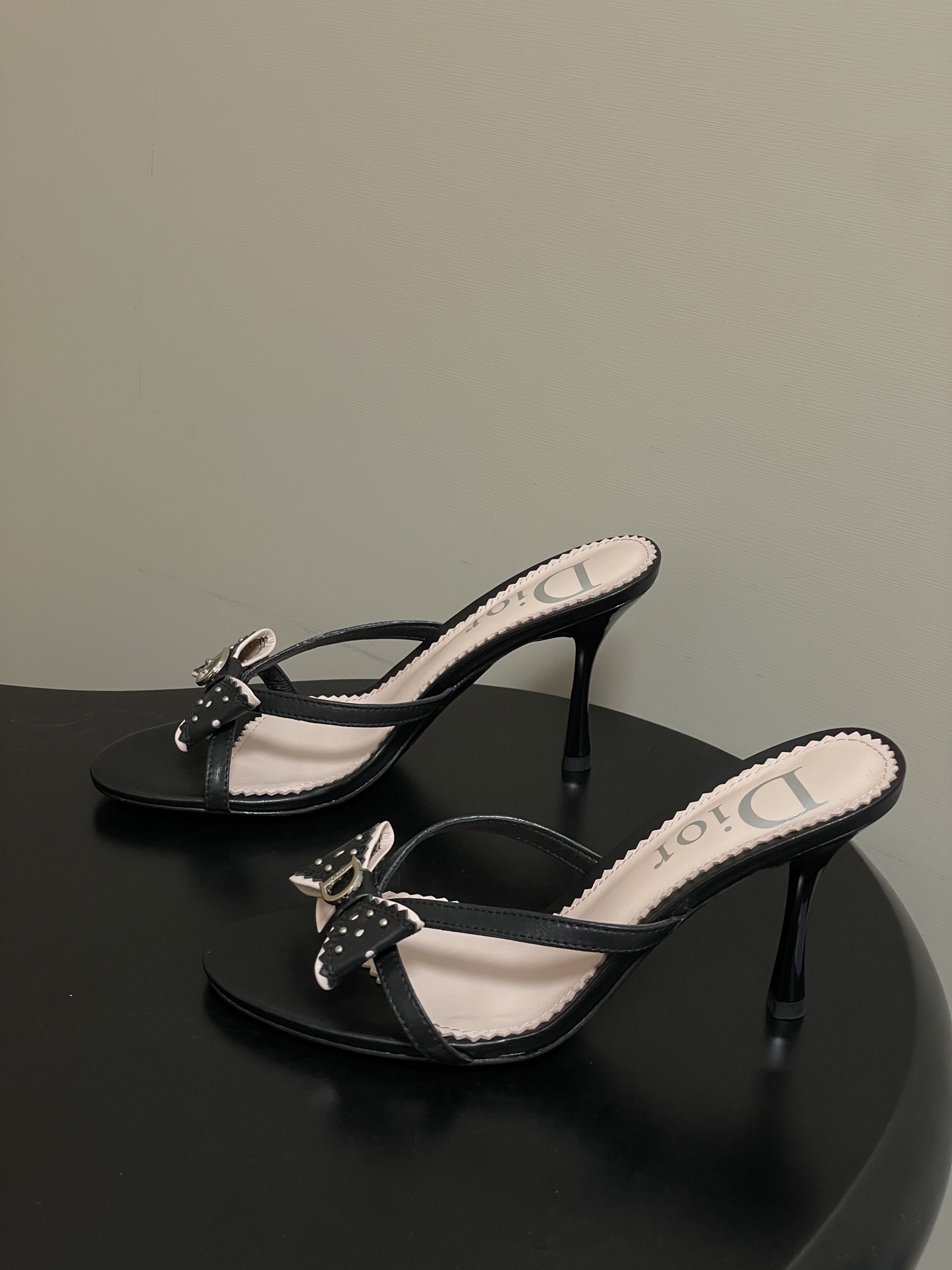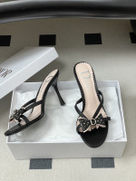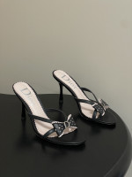 CD 로고 리본 오픈토 피시테일 백오픈 하이힐 샌들