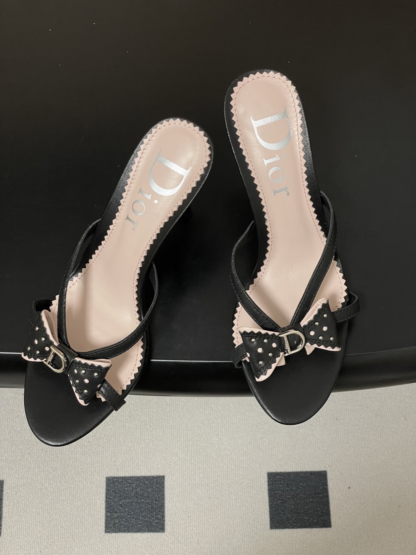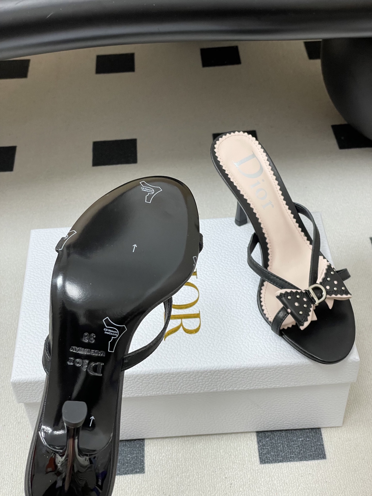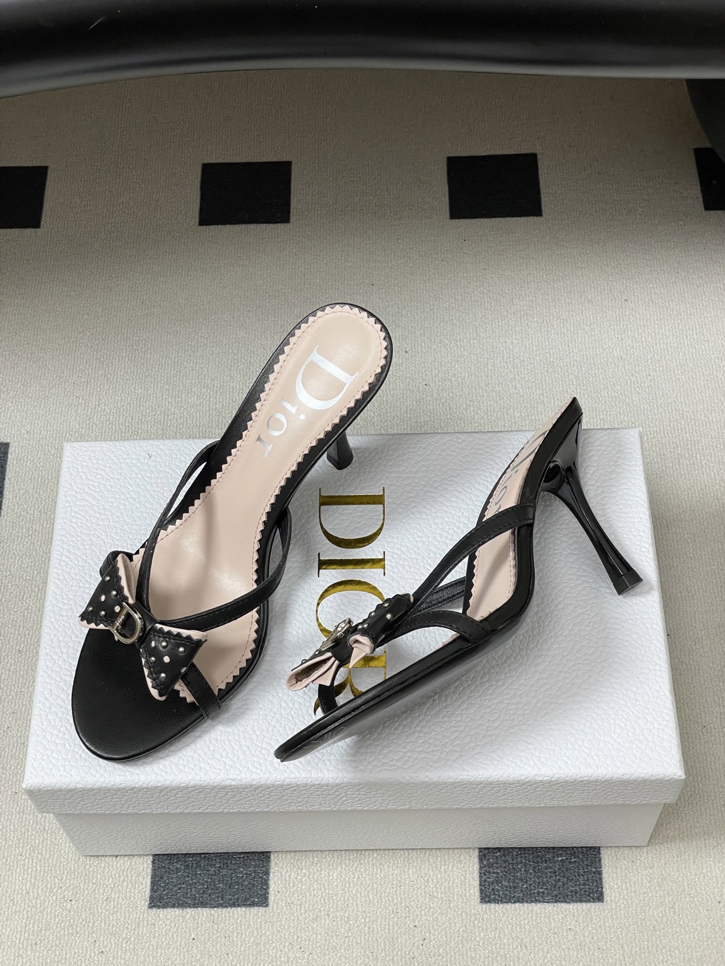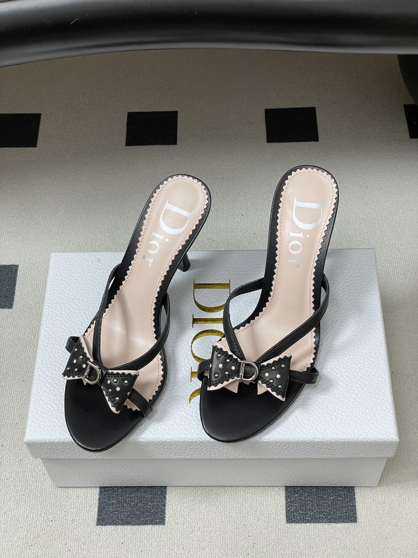 CD 로고 리본 오픈토 피시테일 백오픈 하이힐 샌들