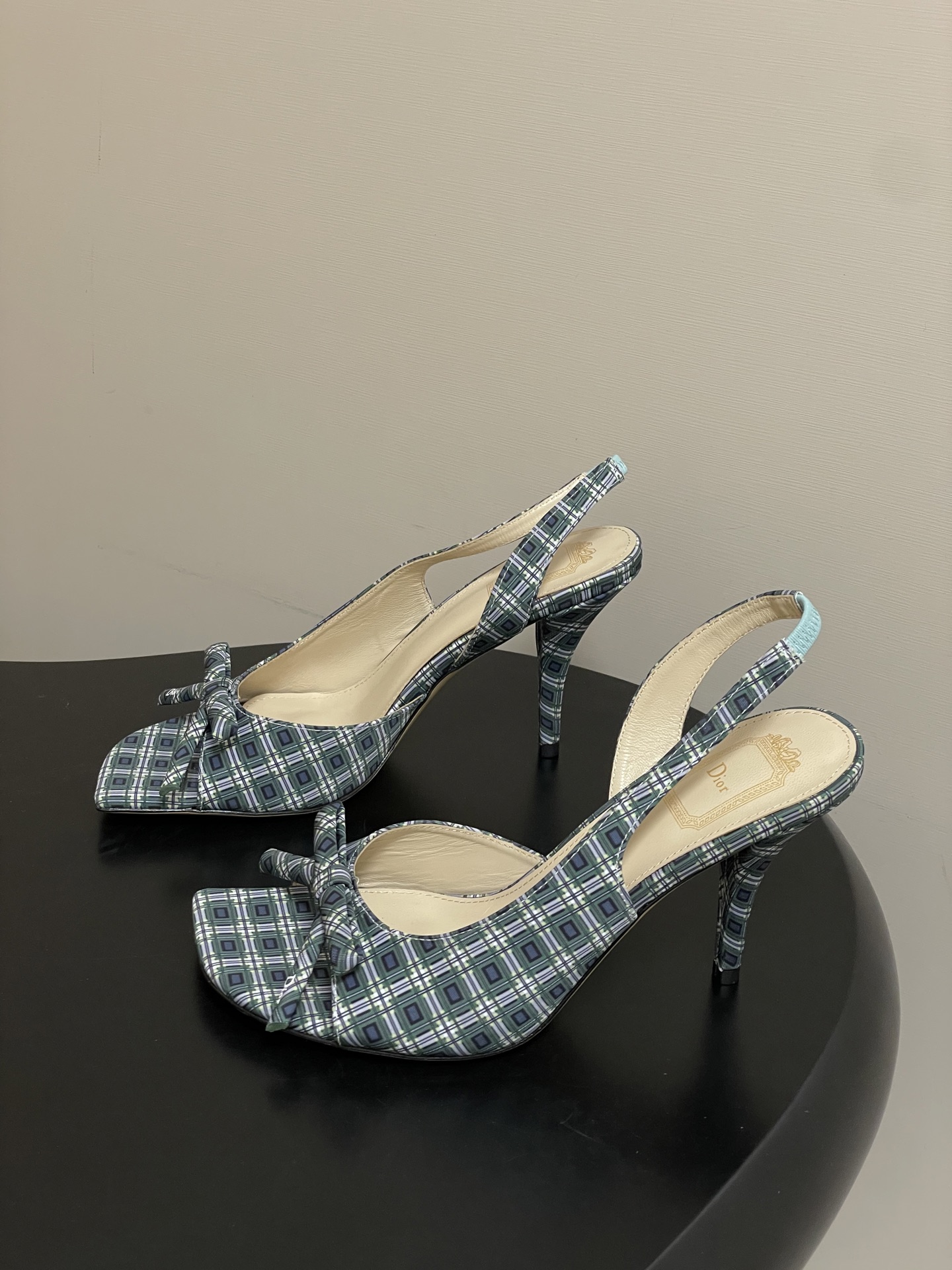 CD 로고 리본 오픈토 피시테일 백오픈 하이힐 샌들