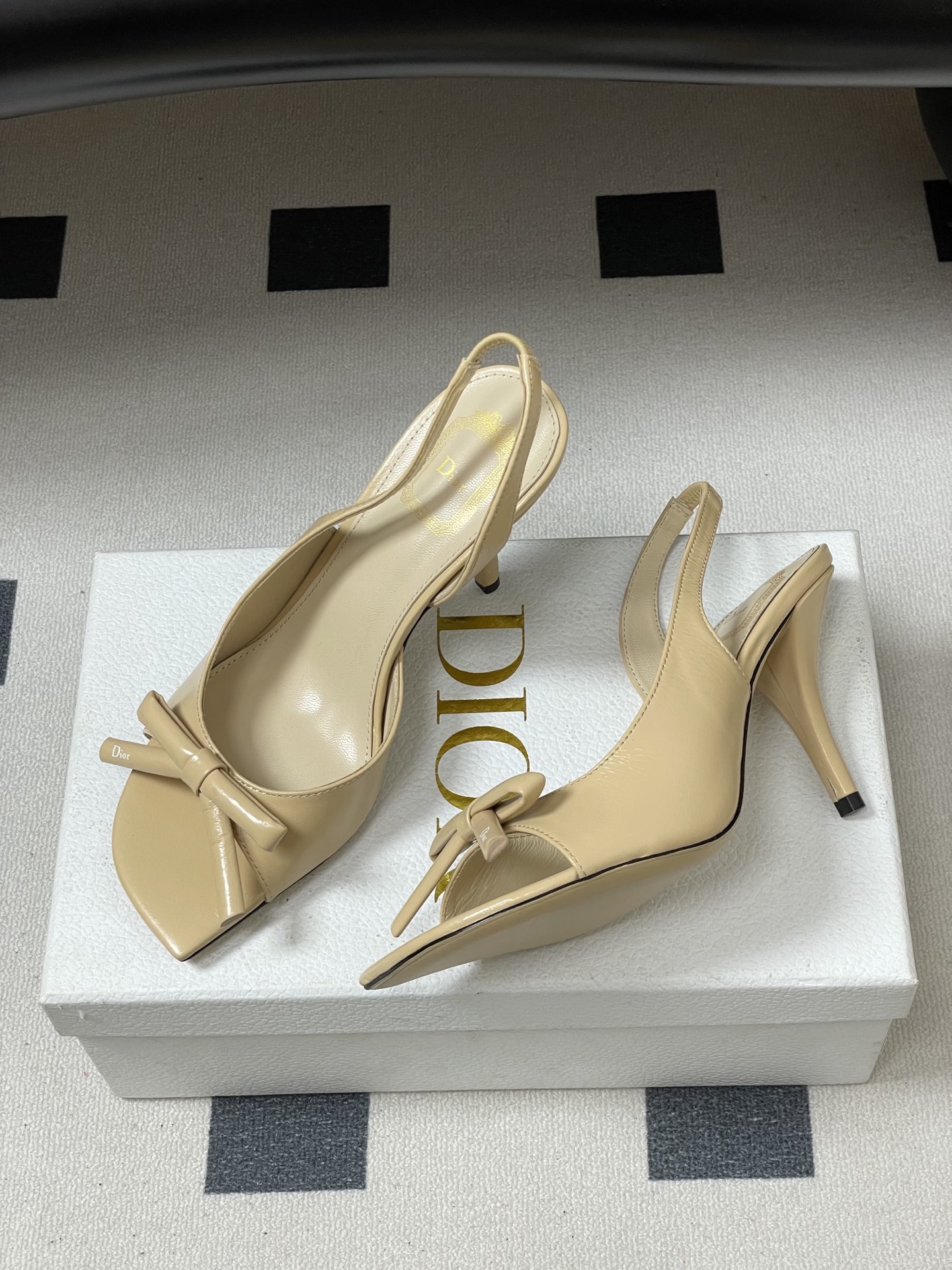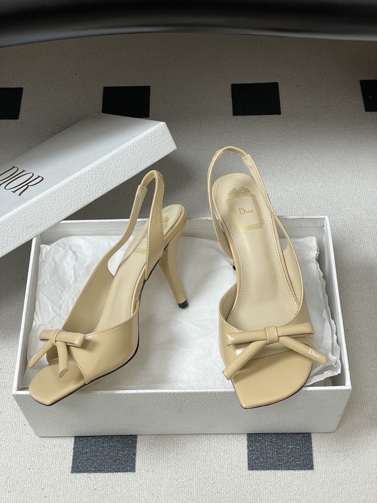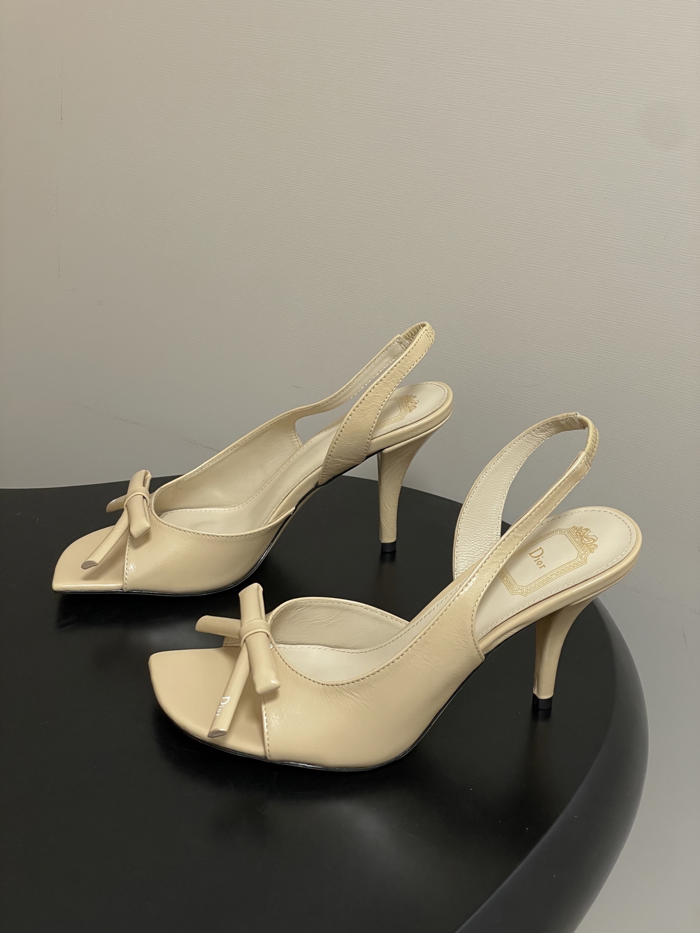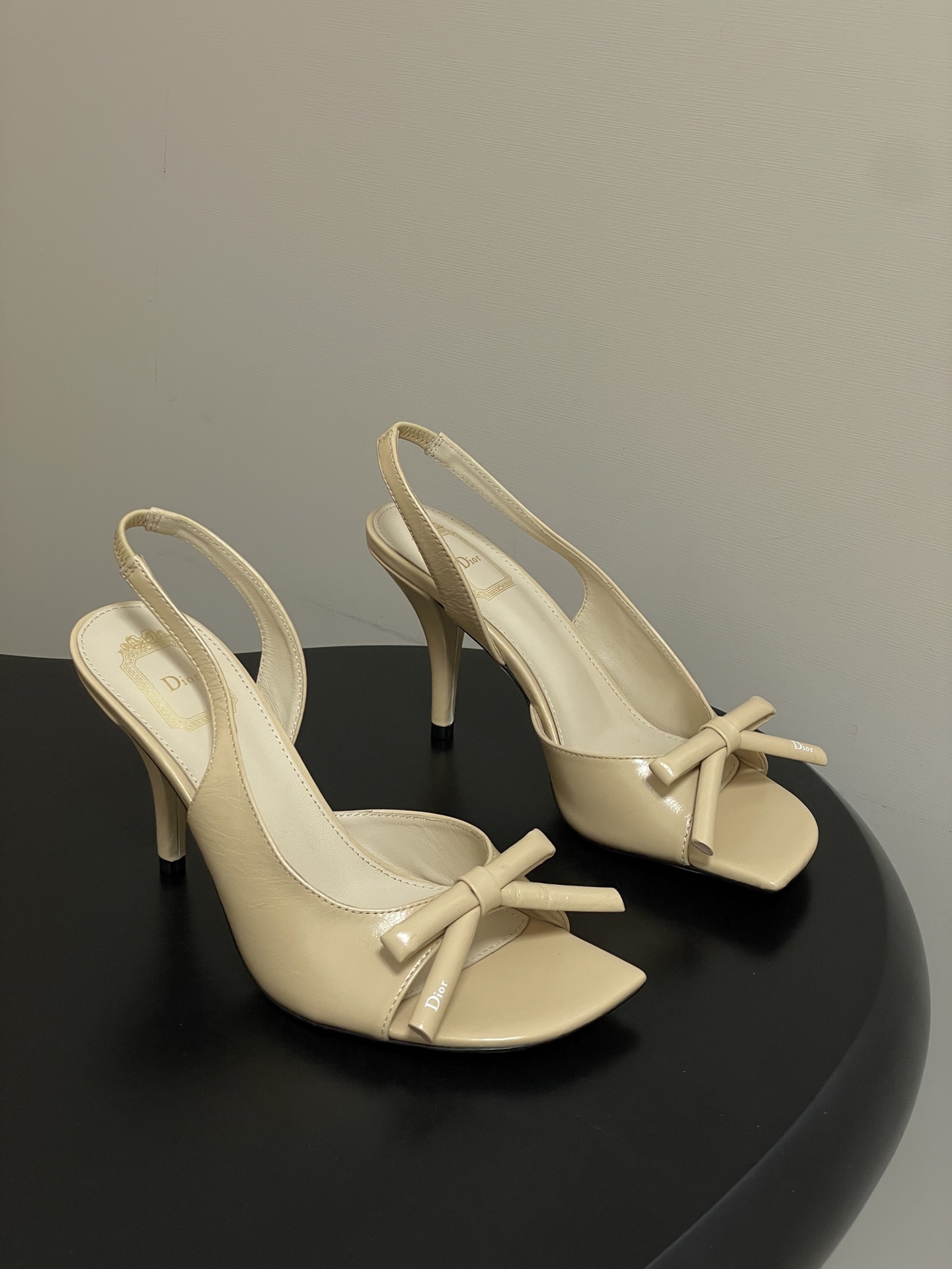 CD 로고 리본 오픈토 피시테일 백오픈 하이힐 샌들