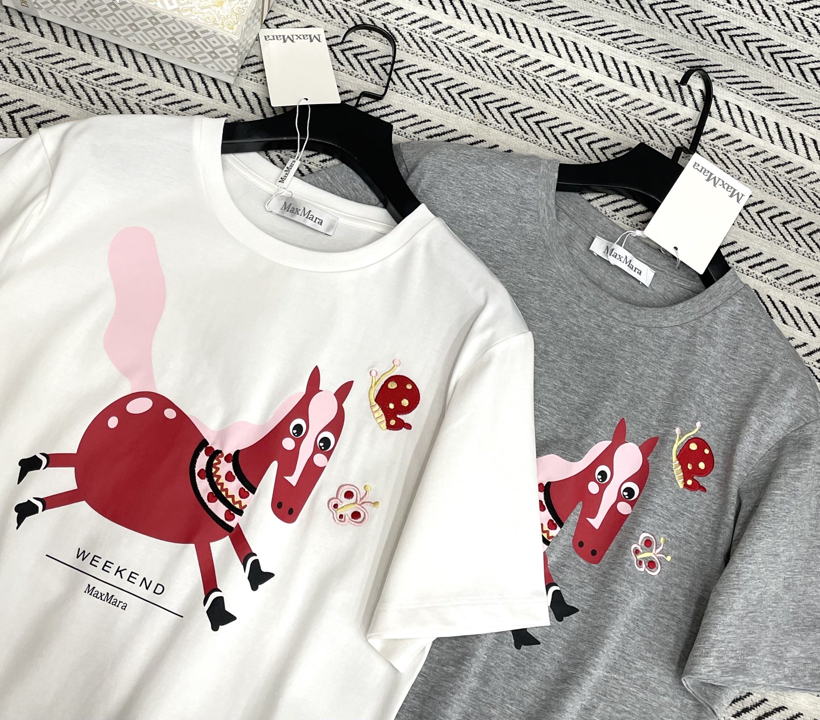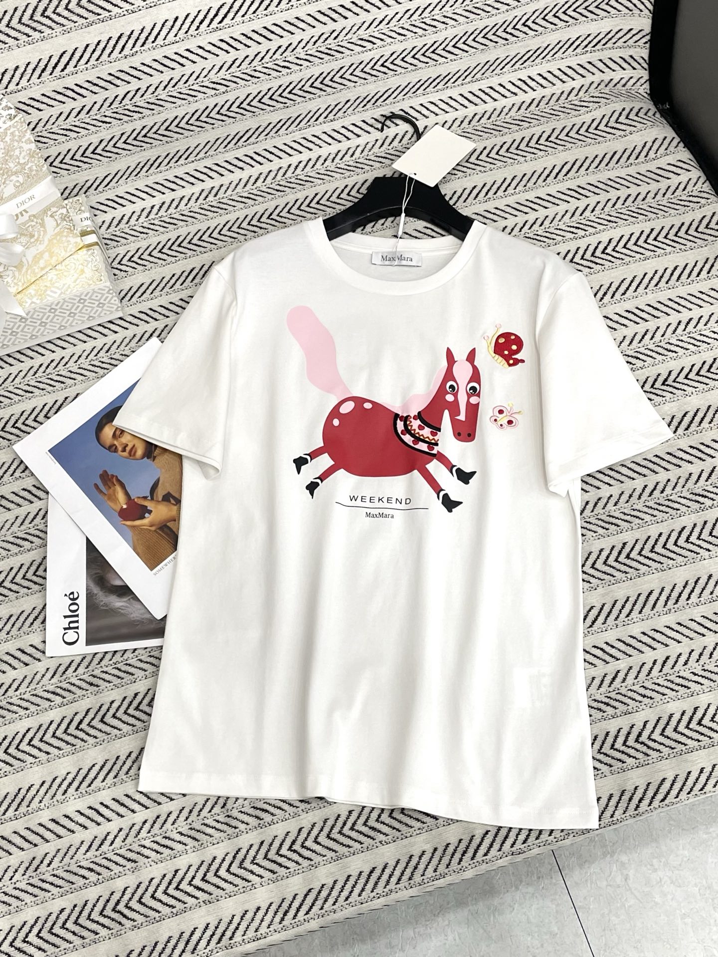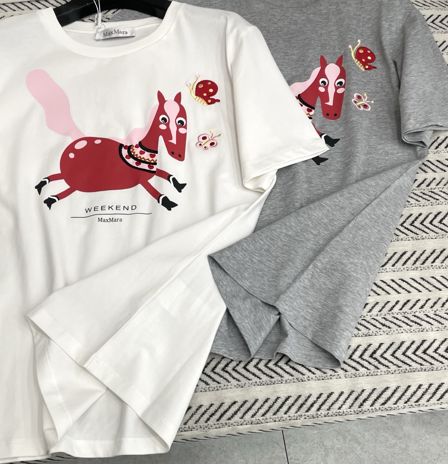 작은 말 프린트 자수 나비 패턴 알파벳 티셔츠 > 여성의류