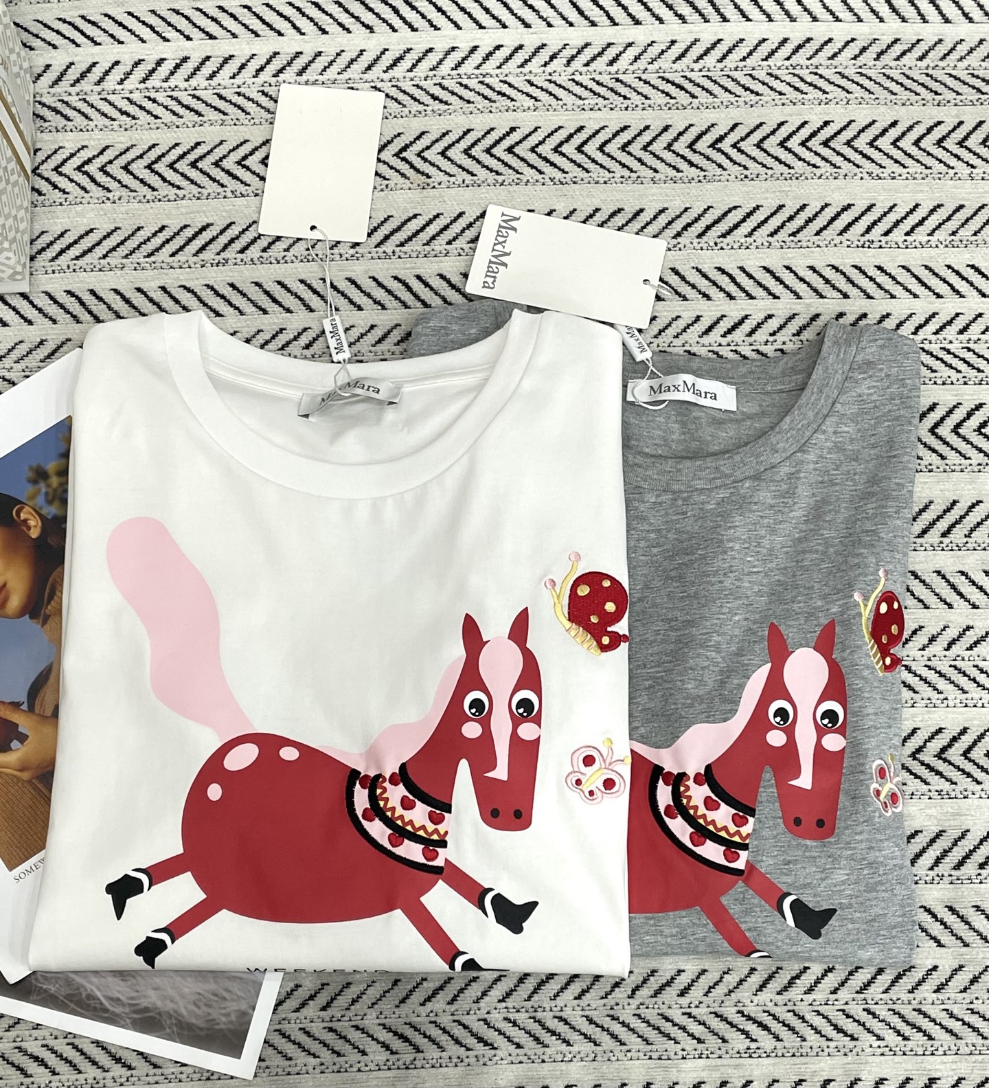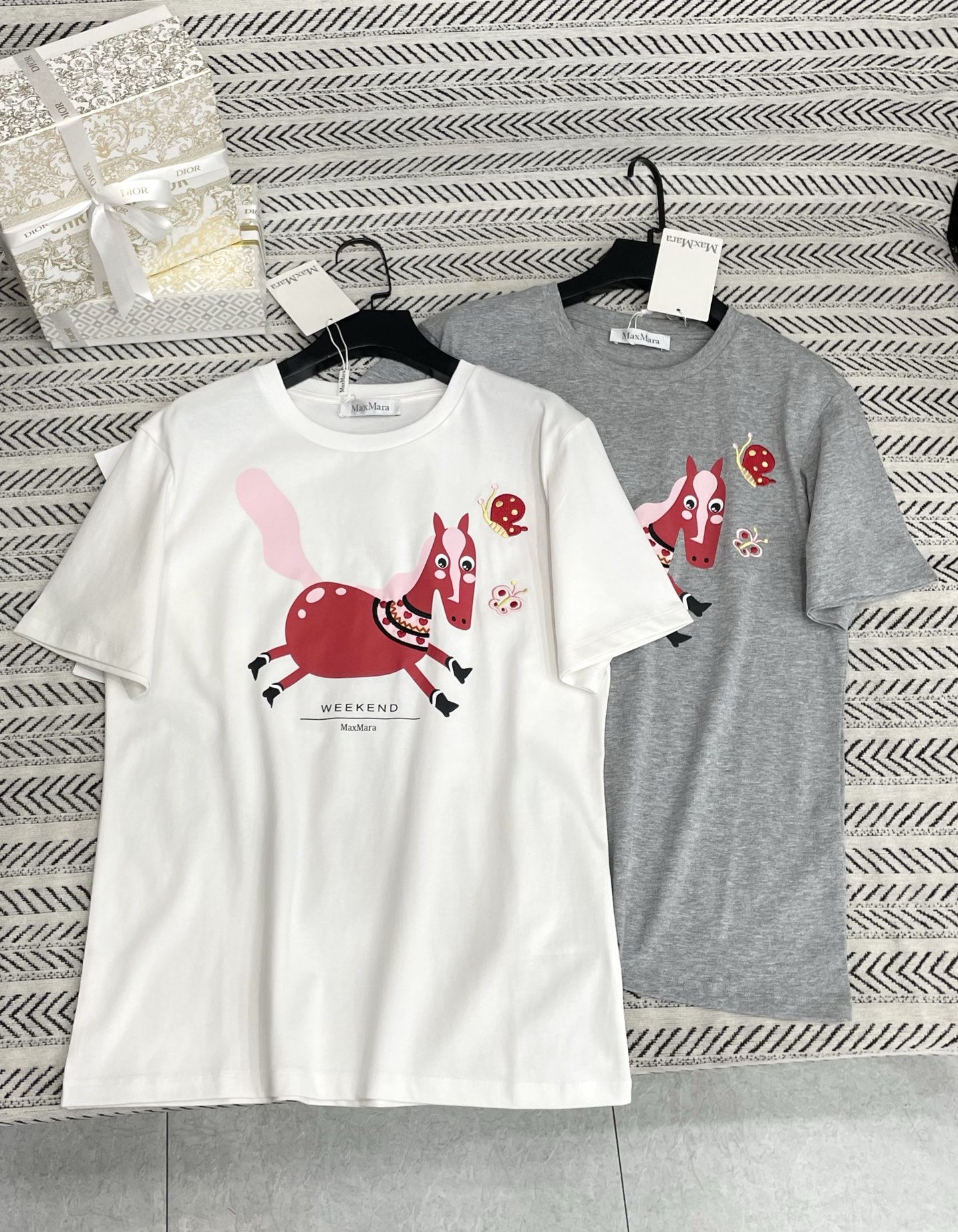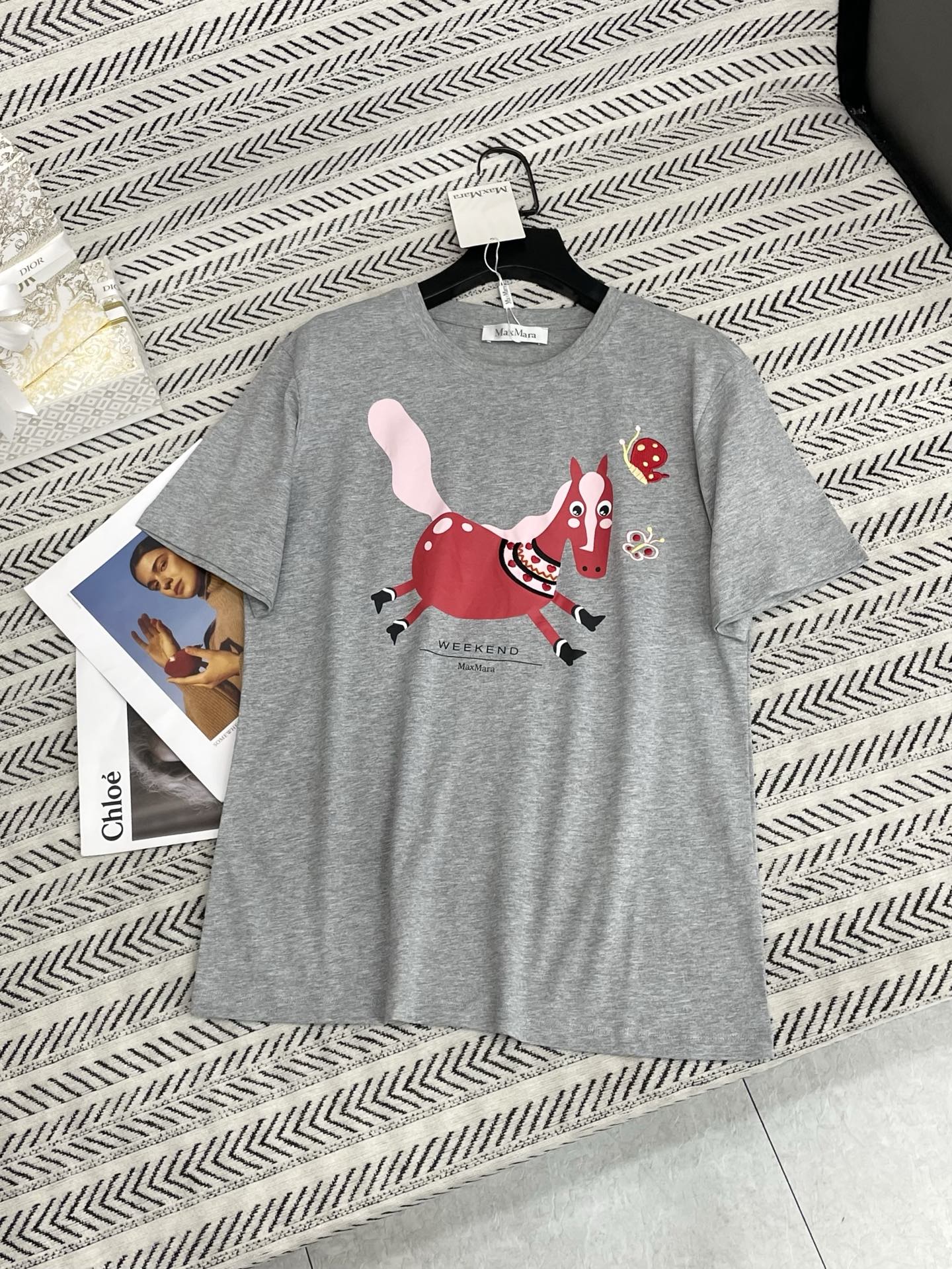 작은 말 프린트 자수 나비 패턴 알파벳 티셔츠 > 여성의류