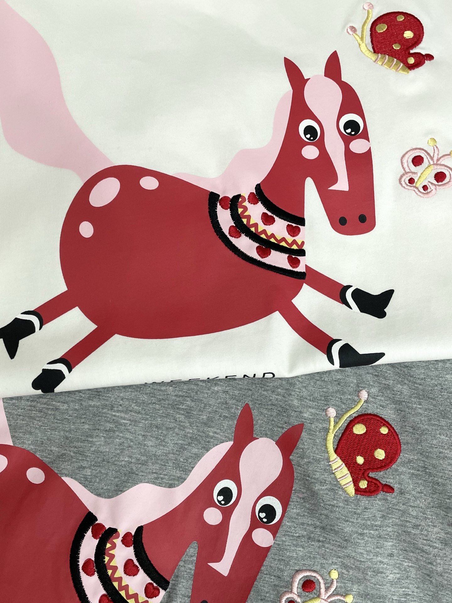 작은 말 프린트 자수 나비 패턴 알파벳 티셔츠