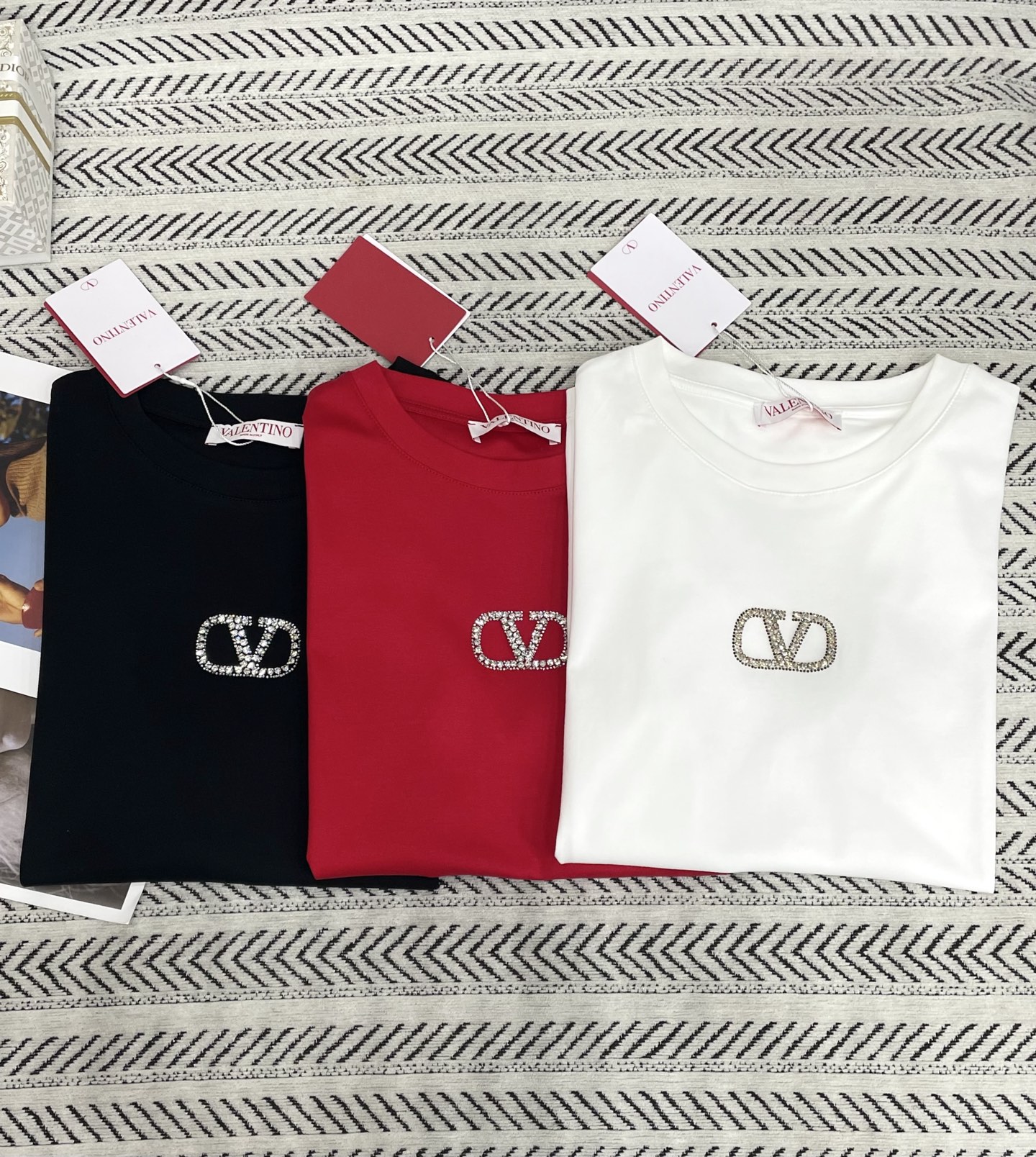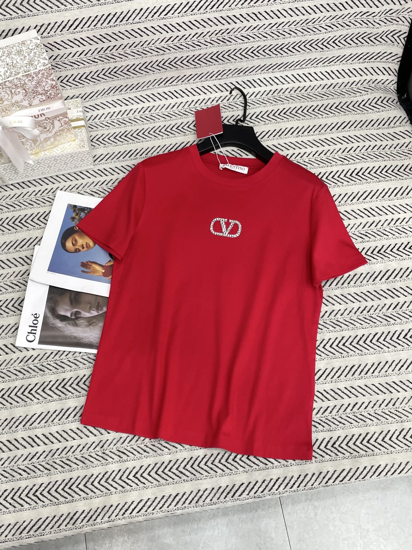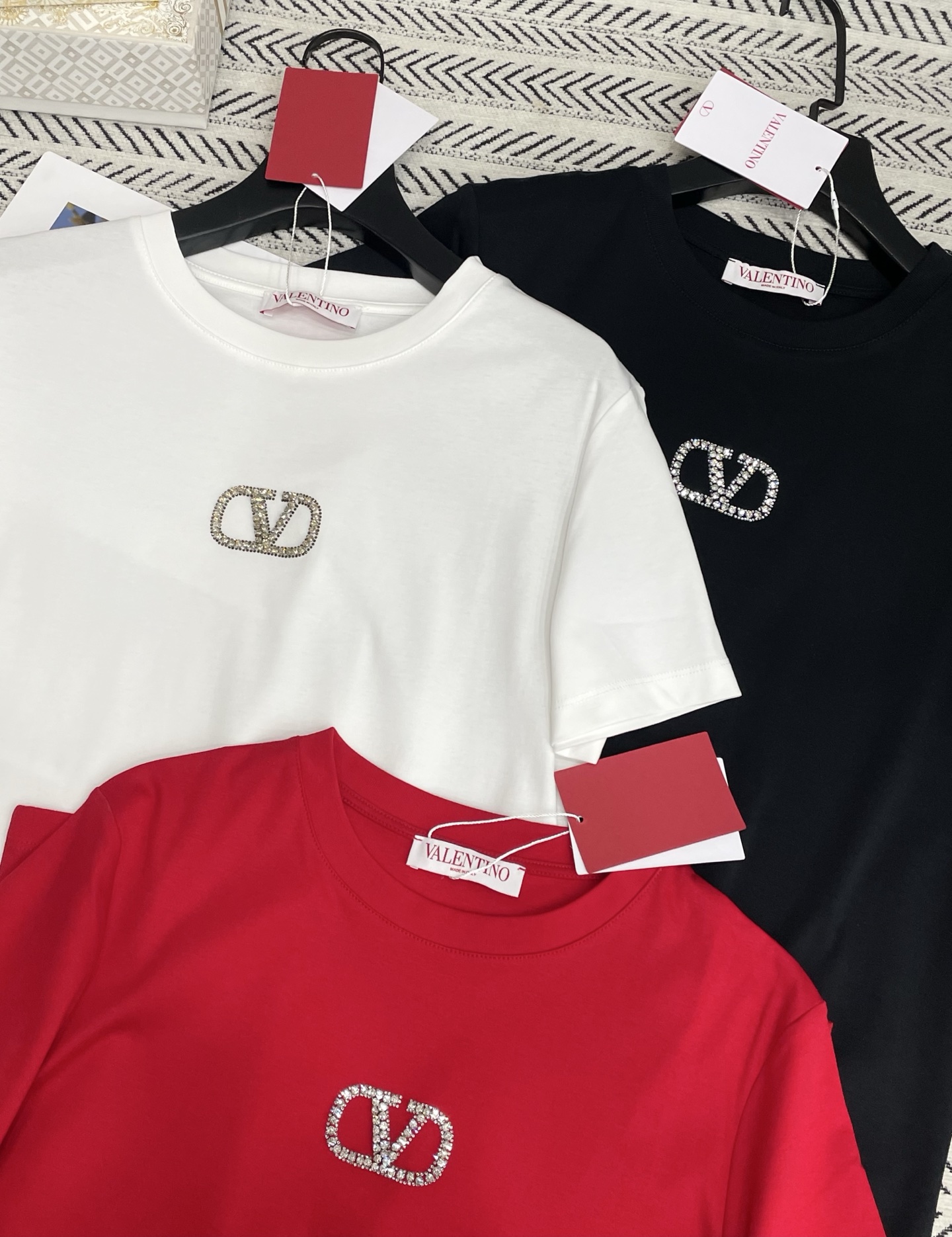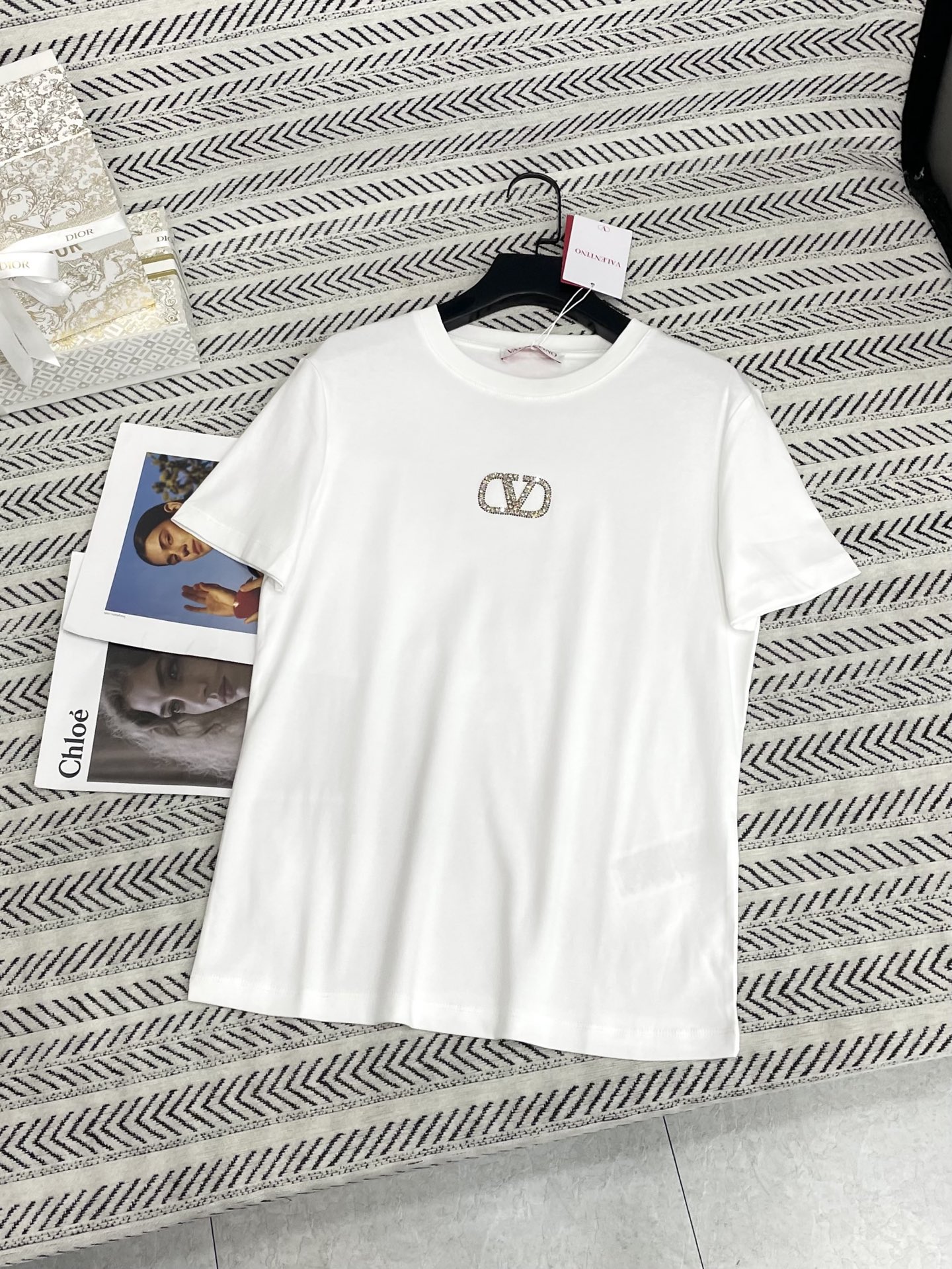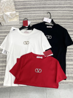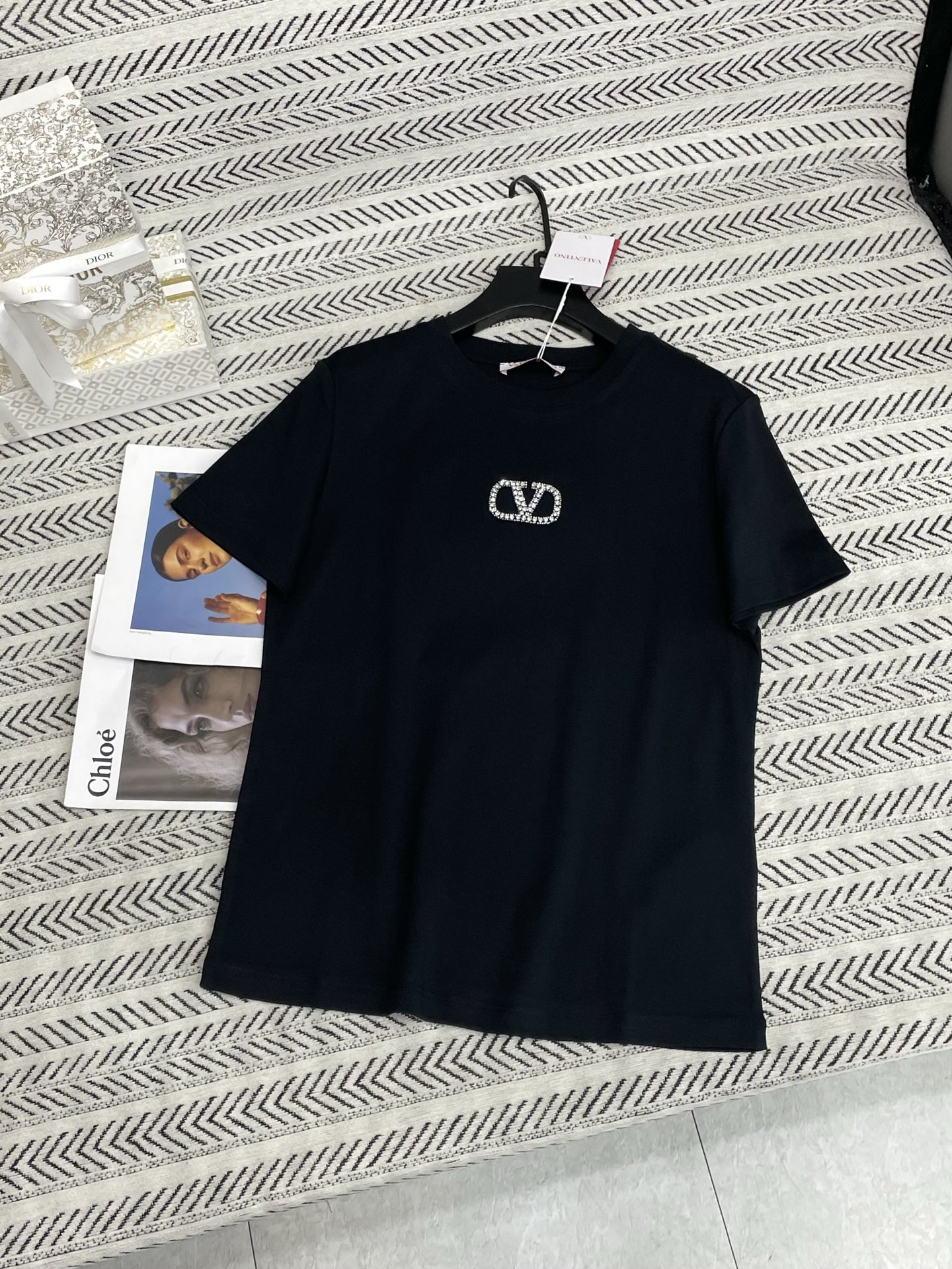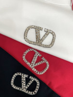 V 로고 스톤 알파벳 패턴 티셔츠
