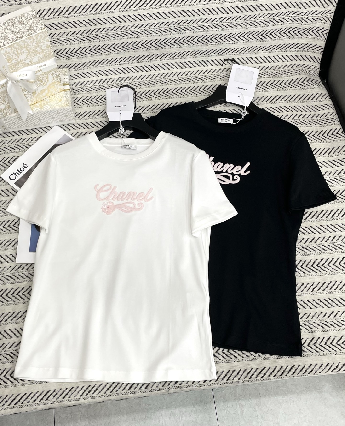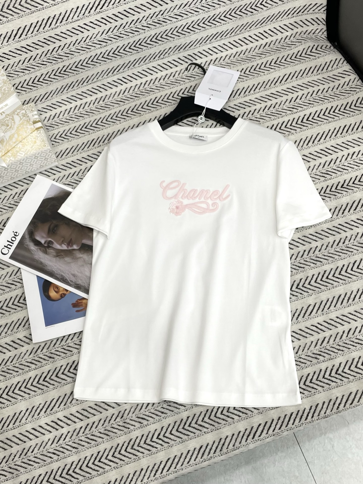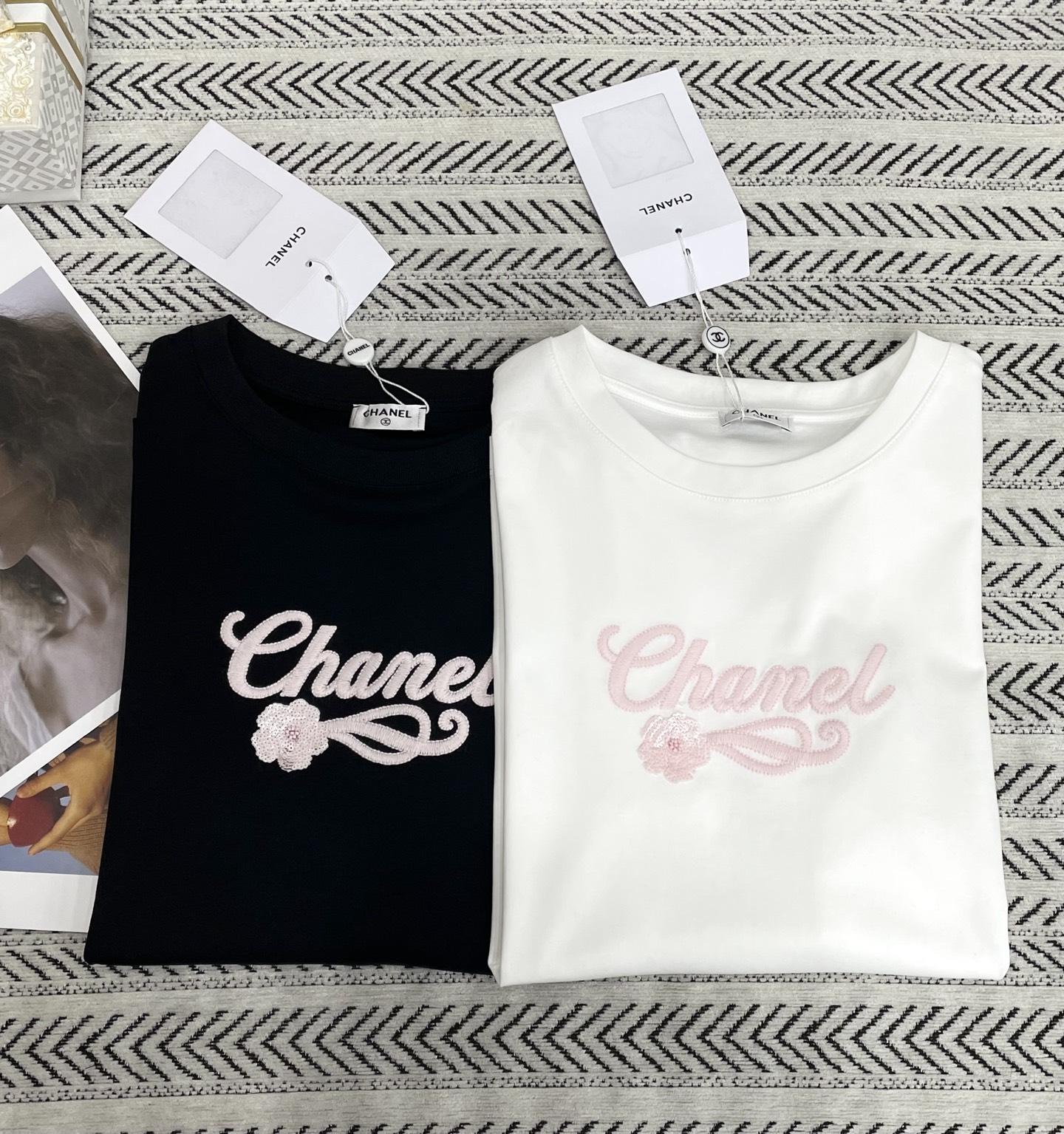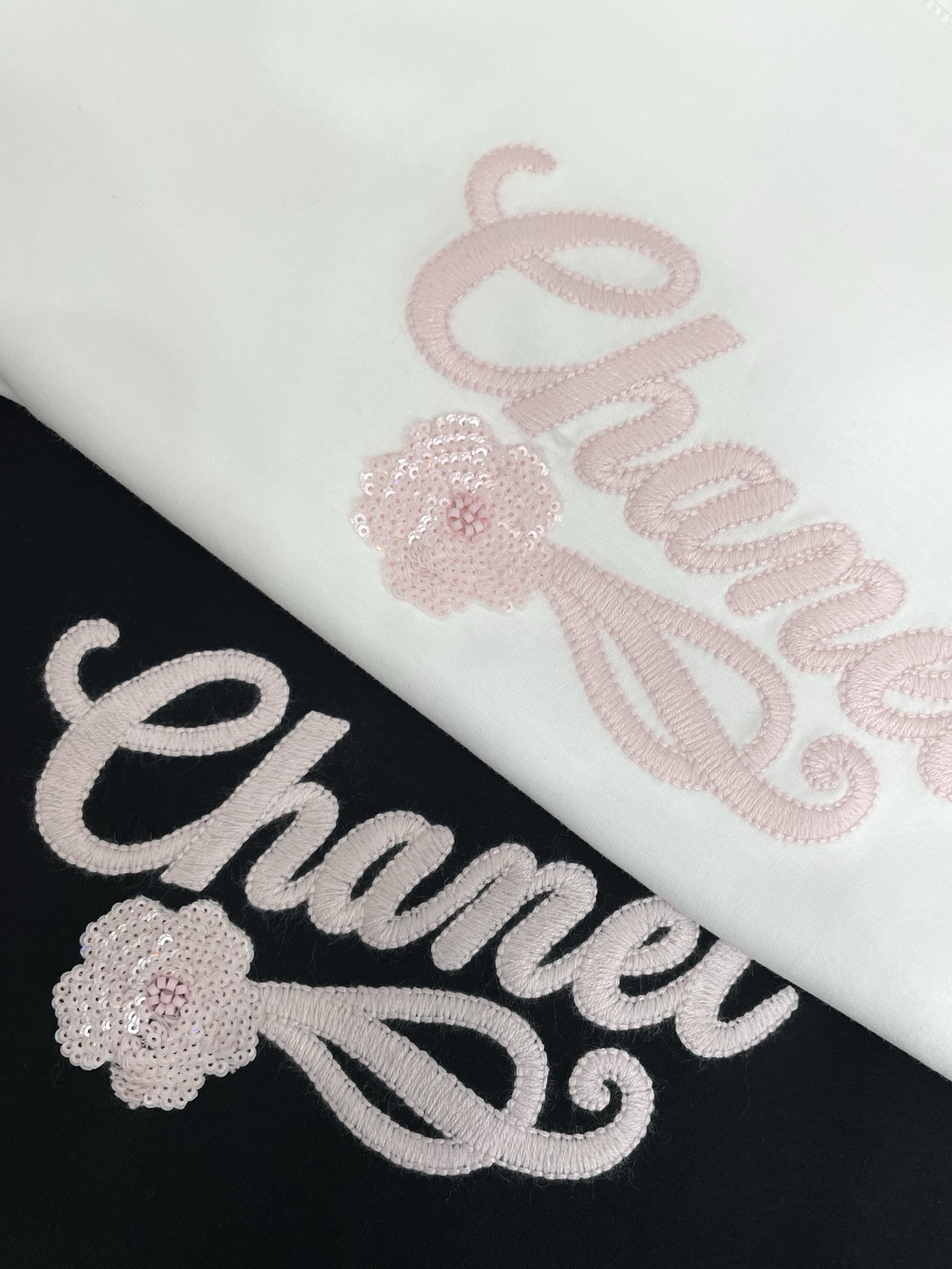 스팽글 레이스 자수 로고 알파벳 패턴 티셔츠