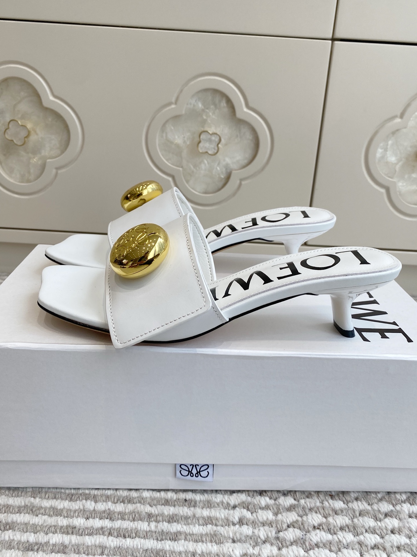 페블 골드 버클 스퀘어 토 캣힐 샌들