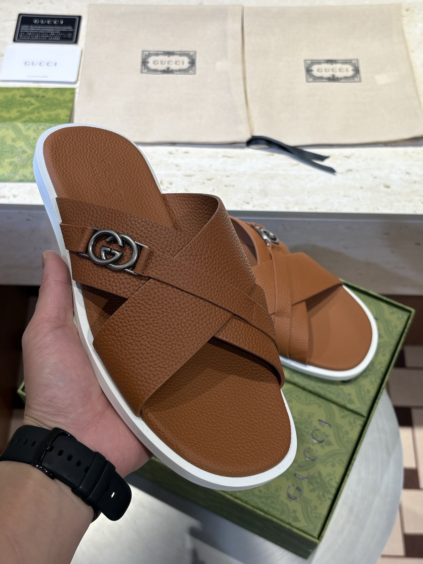 교차 샌들 인터락 더블 컬러 솔 더블 G > 남성신발