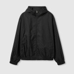 섬세한 플로라 자수, 엠보스 로고, 다양한 장인정신 디테일을 강조하는 차분한 블랙/그레이/그린 톤의 2025년 프리폴 아이템. 접어서 휴대 가능한 블랙 GG 나일론 자카드 소재의 후드 재킷.