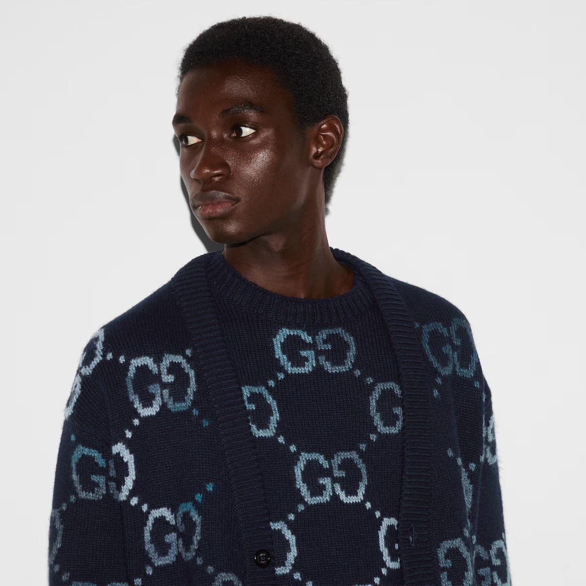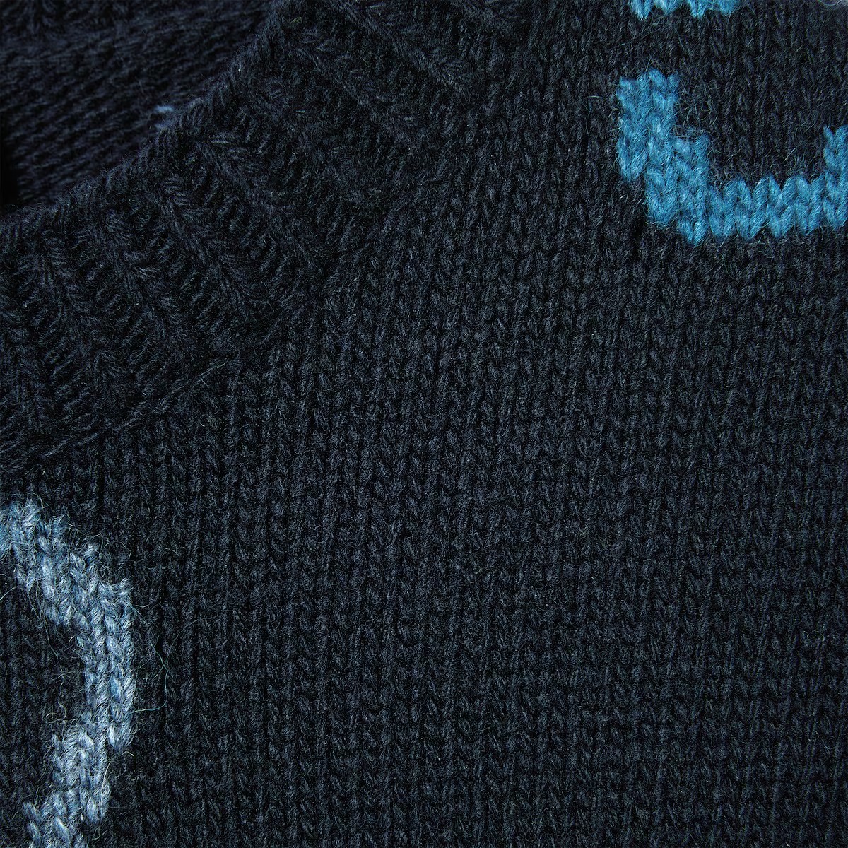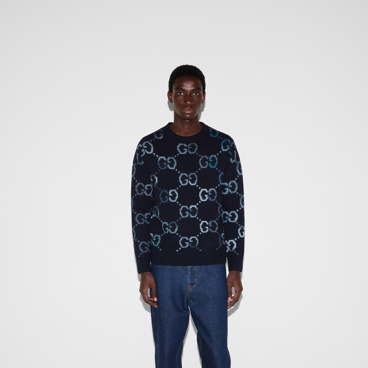 창립자 구찌오 구찌의 모노그램에서 영감을 얻은 GG 모티브는 오늘날에도 여전히 열렬한 지지를 얻고 있습니다. 다양한 네이비/블루 컬러의 대담한 GG 인타르시아 패턴을 전체적으로 적용해 완성한 높은 활용도의 부드러운 울 니트 크루넥 스웨터.