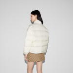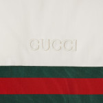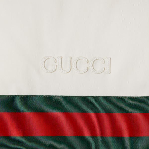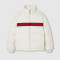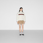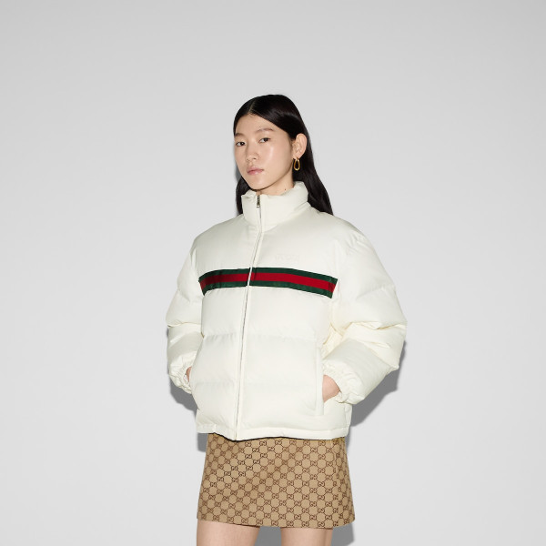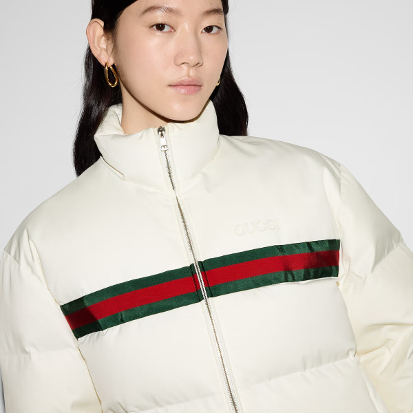 다가오는 쌀쌀한 계절을 위해 부드러운 질감과 보온성을 갖춘 고급 소재 채택 폴리에스테르 트윌 소재에 그린/레드 웹(Web) 가로 스트라이프가 시선을 사로잡는 레귤러 핏 패딩 재킷. 구찌 자수 디테일이 실루엣에 세련된 분위기를 더함.