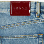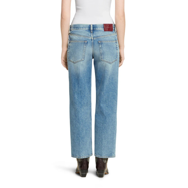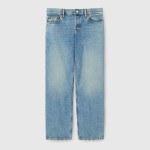 데일리 룩의 품격을 높이는 정교한 디테일로 데님에 대한 참신한 해석을 보여주는 2025 프리폴 컬렉션. 워시드 인증 코튼 데님 소재에 구찌 로소 앙코라 나플락 라벨로 장식된 스트레이트 핏 팬츠.