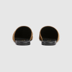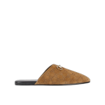 2025 가을-겨울 컬렉션, 구찌가 지속적으로 선보이는 아카이브 심볼. 최신 컬렉션에서 하우스의 승마 정통성을 되살린 홀스빗 메탈 장식. 부드러운 스웨이드 바탕에 라이트 골드 톤 메탈 장식이 돋보이는 남성 뮬.